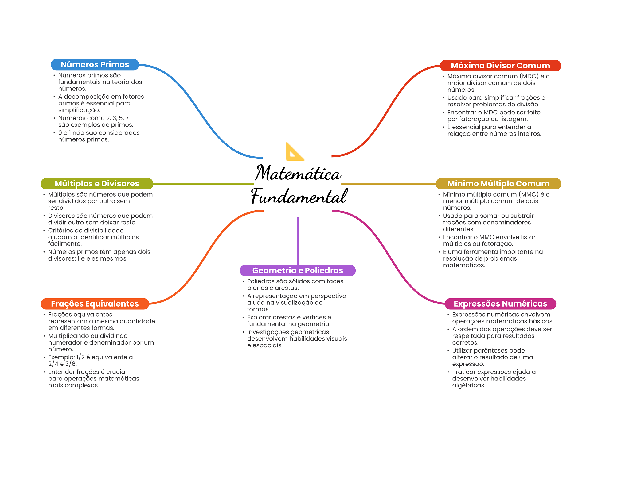 Números Primos Máximo Divisor Comum Números primos são Máximo divisor comum (MDC) é fundamentais na teoria dos maior divisor comum de dois números. números. A decomposição em fatores Usado para simplificar frações e primos é essencial para resolver problemas de divisão. simplificação. Encontrar MDC pode ser feito Números como 2, 3, 5,7 por fatoração ou listagem. são exemplos de primos. É essencial para entender a 0 e 1 não são considerados relação entre números inteiros. números primos. Matemática Múltiplos e Divisores Mínimo Múltiplo Comum Múltiplos são números que podem Fundamental Mínimo múltiplo comum é ser divididos por outro sem menor múltiplo comum de dois resto. números. Divisores são números que podem Usado para somar ou subtrair dividir outro sem deixar resto. frações com denominadores Critérios de divisibilidade diferentes. ajudam a identificar múltiplos Encontrar MMC envolve listar facilmente. múltiplos ou fatoração. Números primos têm apenas dois É uma ferramenta importante na divisores: 1 e eles mesmos. resolução de problemas matemáticos. Geometria e Poliedros Poliedros são sólidos com faces planas e arestas. A representação em perspectiva Frações Equivalentes ajuda na visualização de Expressões Numéricas formas. Frações equivalentes Explorar arestas e vértices é Expressões numéricas envolvem representam a mesma quantidade em diferentes formas. fundamental na geometria. operações matemáticas básicas. Investigações geométricas A ordem das operações deve ser Multiplicando ou dividindo desenvolvem habilidades visuais respeitada para resultados numerador e denominador por um corretos. número. e espaciais. Utilizar parênteses pode Exemplo: 1/2 é equivalente a alterar resultado de uma 2/4 e 3/6. expressão. Entender frações é crucial Praticar expressões ajuda a para operações matemáticas desenvolver habilidades mais complexas. algébricas.