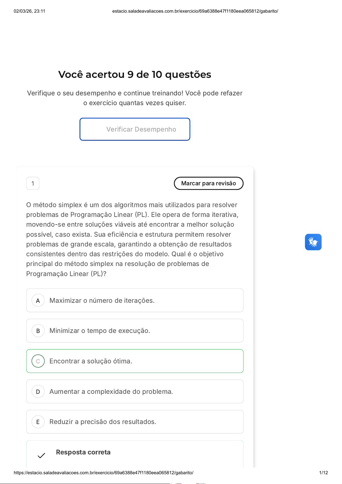 Você acertou 9 de 10 questões Verifique o seu desempenho e continue treinando! Você pode refazer o exercício quantas vezes quiser. Verificar Desempenho A B C D E 1 Marcar para revisão O método simplex é um dos algoritmos mais utilizados para resolver problemas de Programação Linear (PL). Ele opera de forma iterativa, movendo-se entre soluções viáveis até encontrar a melhor solução possível, caso exista. Sua eficiência e estrutura permitem resolver problemas de grande escala, garantindo a obtenção de resultados consistentes dentro das restrições do modelo. Qual é o objetivo principal do método simplex na resolução de problemas de Programação Linear (PL)? Maximizar o número de iterações. Minimizar o tempo de execução. Encontrar a solução ótima. Aumentar a complexidade do problema. Reduzir a precisão dos resultados. Resposta correta 02/03/26, 23:11 estacio.saladeavaliacoes.com.br/exercicio/69a6388e47f1180eea065812/gabarito/ https://estacio.saladeavaliacoes.com.br/exercicio/69a6388e47f1180eea065812/gabarito/ 1/12 A B C D E Parabéns, você selecionou a alternativa correta. Confira o gabarito comentado! Gabarito Comentado O método simplex é uma técnica de otimização utilizada para resolver problemas de Programação Linear (PL). Seu principal objetivo é encontrar a solução ótima, ou seja, a solução que maximiza (ou minimiza) a função objetivo sujeita às restrições do problema. Ao iterativamente melhorar uma solução inicial, o método simplex busca alcançar o ótimo, garantindo eficiência na resolução de problemas de PL. 2 Marcar para revisão Qual é a principal desvantagem do método simplex em relação a outros métodos de otimização? Sensibilidade a problemas mal condicionados. Dificuldade na implementação computacional. Requerimento de conhecimento avançado em matemática. Limitação para problemas com muitas variáveis. Ineficiência na convergência para a solução ótima. Resposta correta Parabéns, você selecionou a alternativa correta. Confira o gabarito comentado! Gabarito Comentado 02/03/26, 23:11 estacio.saladeavaliacoes.com.br/exercicio/69a6388e47f1180eea065812/gabarito/ https://estacio.saladeavaliacoes.com.br/exercicio/69a6388e47f1180eea065812/gabarito/ 2/12 A B C D E Uma das principais limitações do método simplex é sua eficácia reduzida em problemas com muitas variáveis. À medida que o número de variáveis aumenta, o método simplex pode exigir um número significativo de iterações para encontrar a solução ótima, tornando-se computacionalmente custoso e menos eficiente em comparação com outros métodos de otimização, como a programação dinâmica ou algoritmos de gradiente descendente. Isso ocorre devido à complexidade crescente do espaço de busca com um grande número de variáveis, o que pode aumentar o tempo computacional necessário para encontrar a solução ótima. 3 Marcar para revisão Os problemas resolvidos pelo método simplex devem ter suas restrições convertidas para a forma canônica. Dessa forma, as restições que apresentam uma desigualdade devem ser convertidas em igualdade. Quando a restrição é do tipo maior ou igual, devemos introduzir que tipo de varável para a conversão para a forma canônica? Excesso. Folga. De Decisão. De Ajuste. Canônicas. Resposta correta Parabéns, você selecionou a alternativa correta. Confira o gabarito comentado! 02/03/26, 23:11 estacio.saladeavaliacoes.com.br/exercicio/69a6388e47f1180eea065812/gabarito/ https://estacio.saladeavaliacoes.com.br/exercicio/69a6388e47f1180eea065812/gabarito/ 3/12 A B Gabarito Comentado A resposta correta é: Excesso. Sempre que a restrição for de menor ou igual, ao converter para a form canônica devemos criar uma variável de folga, porém, se a restrição for de maior ou igual, devemos criar uma variável de excesso. 4 Marcar para revisão A Tabela a seguir apresenta a proporção de cada material na mistura para a obtenção das ligas passíveis de fabricação por uma metalúrgica que deseja maximizar sua receita bruta. O preço está cotado em reais por tonelada da liga fabricada. Também em toneladas estão expressas as restrições de disponibilidade de matéria-prima. A variável de decisão para a modelagem deste problema é x , que indica a quantidade em toneladas produzidas da liga especial de baixa resistência (i = 1) e da especial de alta resistência (i = 2). Assim, para a solução ótima deste problema, a produção de ligas especiais de alta resistência pela metalúrgica deve ser de: Fonte: Adaptado de Goldbarg e Luna (2005, p. 36) i 1,4 11,4 02/03/26, 23:11 estacio.saladeavaliacoes.com.br/exercicio/69a6388e47f1180eea065812/gabarito/ https://estacio.saladeavaliacoes.com.br/exercicio/69a6388e47f1180eea065812/gabarito/ 4/12 C D E A B C 31,4 45,4 100,4 Resposta correta Parabéns, você selecionou a alternativa correta. Confira o gabarito comentado! Gabarito Comentado A resposta certa é: 1,4 5 Marcar para revisão Uma empresa tem dois tipos de produtos, A e B. Ela tem disponíveis 8 horas de mão de obra para produzir os produtos A e 12 horas para produzir os produtos B. Cada produto A tem um lucro de R 80,00. A empresa tem como objetivo maximizar seu lucro e deve produzir pelo menos 2 unidades de A e não pode produzir mais de 4 unidades de B. Qual é o número máximo de unidades de B que a empresa deve produzir para maximizar seu lucro? 50, 00ecadaprodutoBtemumlucrodeR 3 unidades. 4 unidades. 2 unidades. 02/03/26, 23:11 estacio.saladeavaliacoes.com.br/exercicio/69a6388e47f1180eea065812/gabarito/ https://estacio.saladeavaliacoes.com.br/exercicio/69a6388e47f1180eea065812/gabarito/ 5/12 D E 5 unidades. 6 unidades. Resposta correta Parabéns, você selecionou a alternativa correta. Confira o gabarito comentado! Gabarito Comentado A alternativa correta é a B, que indica a produção de 4 unidades do produto B. Explicação: A alternativa "3 unidades" é falsa. Produzindo 3 unidades de B, 