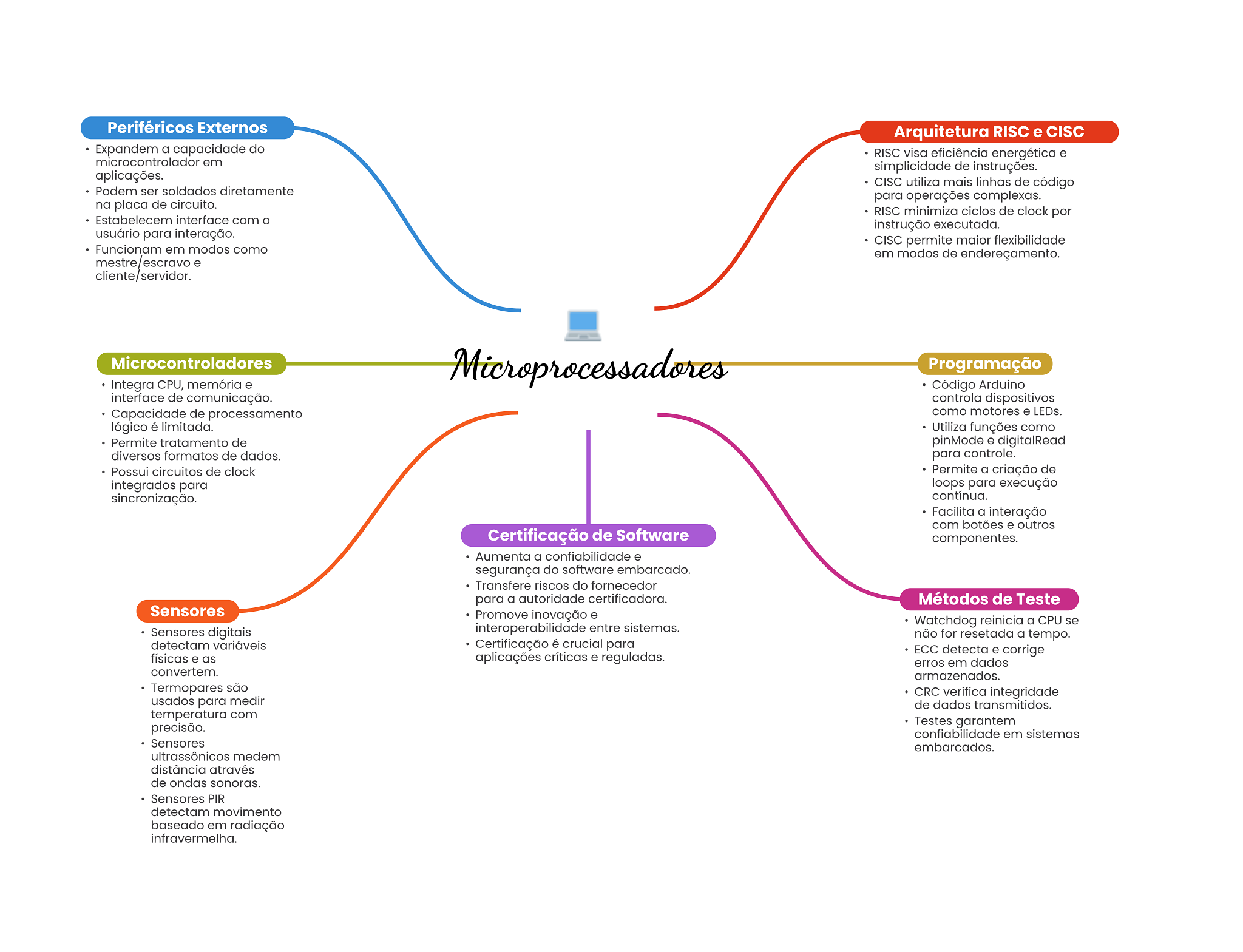 Periféricos Externos Arquitetura RISC e CISC Expandem a capacidade do RISC visa eficiência energética e microcontrolador em simplicidade de instruções. aplicações. CISC utiliza mais linhas de código Podem ser soldados diretamente para operações complexas. na placa de circuito. RISC minimiza ciclos de clock por Estabelecem interface com instrução executada. usuário para interação. CISC permite maior flexibilidade Funcionam em modos como em modos de endereçamento. mestre/escravo e cliente/servidor. Microcontroladores Microprocessadores Programação Integra CPU, memória e Código Arduino interface de comunicação. controla dispositivos Capacidade de processamento como motores e LEDs. lógico é limitada. Utiliza funções como Permite tratamento de pinMode e digitalRead diversos formatos de dados. para controle. Possui circuitos de clock Permite a criação de integrados para loops para execução sincronização. contínua. Facilita a interação com botões e outros Certificação de Software componentes. Aumenta a confiabilidade e segurança do software embarcado. Transfere riscos do fornecedor para a autoridade certificadora. Métodos de Teste Sensores Promove inovação e Watchdog reinicia a CPU se Sensores digitais interoperabilidade entre sistemas. não for resetada a tempo. detectam variáveis Certificação é crucial para físicas e as aplicações críticas e reguladas. ECC detecta e corrige erros em dados convertem. armazenados. Termopares são CRC verifica integridade usados para medir de dados transmitidos. temperatura com precisão. Testes garantem confiabilidade em sistemas Sensores embarcados. ultrassônicos medem distância através de ondas sonoras. Sensores PIR detectam movimento baseado em radiação infravermelha.