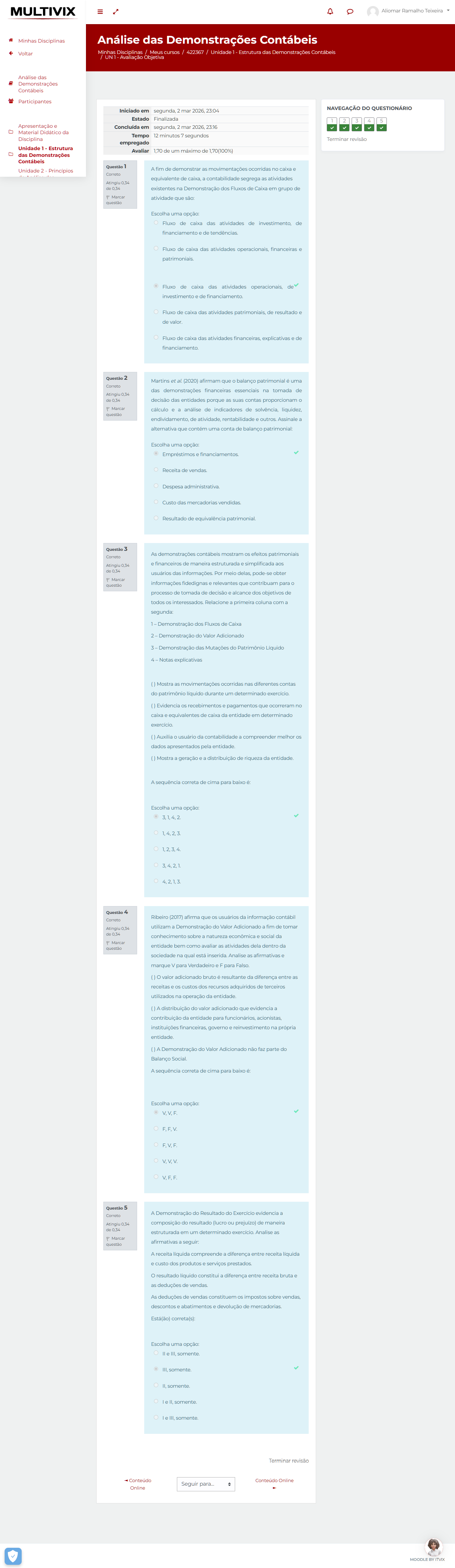 IX / a Análise das Demonstrações Contábeis Minhas Disciplinas Meus cursos 422367 Unidade Estrutura das Contábeis Avaliação Objetiva Iniciado em segunda, 2026,23:04 NAVEGAÇÃO DO QUE Estado Finalizada 4 em 2026, 23:16 da Tempo minutos segundos Terminar revisão empregado Avaliar de de 1,70(100%) Questão Afim as tações ridas equivalente de contabilidade segrega as atividades Atinglu existentes na Demonstração dos Fluxos de Caixa em grupo de P atividade que são Escolh opção: Fluxo de caixa das atividades de de financiamento Fluxo de caixa das atividades financeiras e Fluxo de caixa das atividades operacionais investimento Fluxo caixa das atividades patrimoniais, de resultado Fluxo de caixa das atividades explicativas financiamento Martins (2020) afirmam que balanço monial uma das demonstrações financeiras essenciais na tomada de Atingiu decisão das entidades porque as suas contas proporcion P cálculo análise de indicadores de solvência, endividamento de atividade outros Assinale a alternativa que contém uma conta de bal patrimonial opção Empréstimos financiame Receita vendas Despesa dministrativa Custo das mercadorias vendidas Resultado de patrimonial. As strações mostran efeitos patrimoniais e inanceiros de maneira estruturada usuários das Por meio delas, pode obter P questão informações fidedigna relevantes que processo tomada de decisão alcano dos objetivos todos interessados Relacione coluna Demonstração dos Fluxos de Caixa Demonstração do Valor onado 3 Demonstração das Mutações do Patrimônio 4 Notas explicativas Mostra ocorridas nas diferentes contas do patrimônio líquido durante um determinado Evidencia pagamentos caixa equivalentes de caixa da entidade em determinado Auxilia contab compreender melhor os dados tados pela entidade riqueza da entidade sequência correta Escolha uma opção: 1,2,3,4 Ribeiro (2017) afirma da mação At utilizam Demonstração Adicionado fim sobre natureza econômica social da P entidade bem como avaliar as ividades dela dentro questão sociedade na qual está inserida nalise as firmativas marque para Verdadeiro para Falso valor adicionado bruto resultante da diferença entre as receitas custos dos rec rsos adquiridos de terceiros utilizados dade distribuição do valor contribuição da entidade para funcionários acionistas instit finance governo reinvestimento propria entidade Demonstração do Valor Adicionado não faz parte do Balanço Social A sequência correta cima para Escolha do Resultado do Exercício composição do resultado lucro ou de maneira estruturada em um Analise as questão seguir A receita diferença ent custo dos produtos serviços prestados es tado líquido constitui iferença entre receita bruta as deduções vendas As ções vendas constit en os mpostos descontos abatimentos devolução de mercadorias Está(ão) correta(s) Escolha opção: somente somente somente somente revisão Seguir Online