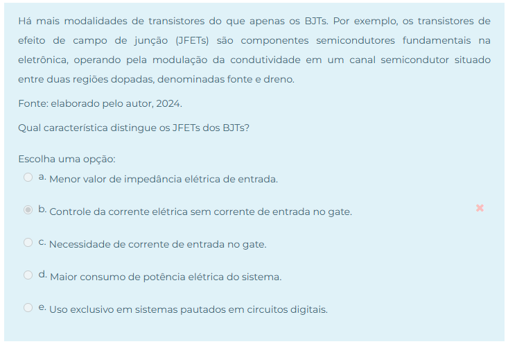 Há mais modalidades de transistores do que apenas OS BJTs. Por exemplo, transistores de efeito de campo de junção (JFETs) são componentes semicondutores fundamentais na eletrônica, operando pela modulação da condutividade em um canal semicondutor situado entre duas regiões dopadas, denominadas fonte e dreno. Fonte: elaborado pelo autor, 2024. Qual característica distingue JFETs dos BJTs? Escolha uma opção: a. Menor valor de impedância elétrica de entrada. b. Controle da corrente elétrica sem corrente de entrada no gate. C. Necessidade de corrente de entrada no gate. d. Maior consumo de potência elétrica do sistema. e. Uso exclusivo em sistemas pautados em circuitos digitais.