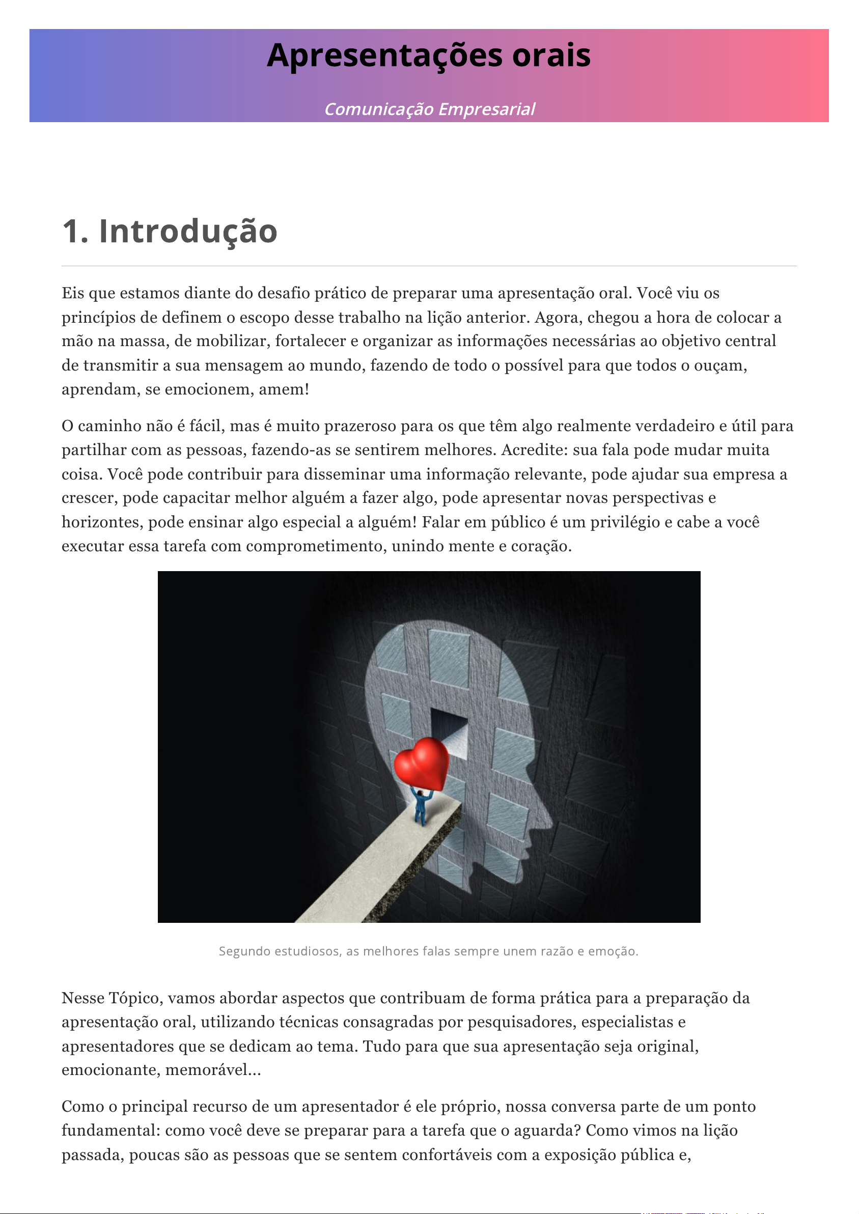 22/12/2021 09:03 Apresentações orais https://cead.uvv.br/graduacao/conteudo.php?aula=apresentacoes-orais&dcp=comunicacao-empresarial&topico=7 1/22 Apresentações orais Comunicação Empresarial 1. Introdução Eis que estamos diante do desafio prático de preparar uma apresentação oral. Você viu os princípios de definem o escopo desse trabalho na lição anterior. Agora, chegou a hora de colocar a mão na massa, de mobilizar, fortalecer e organizar as informações necessárias ao objetivo central de transmitir a sua mensagem ao mundo, fazendo de todo o possível para que todos o ouçam, aprendam, se emocionem, amem! O caminho não é fácil, mas é muito prazeroso para os que têm algo realmente verdadeiro e útil para partilhar com as pessoas, fazendo-as se sentirem melhores. Acredite: sua fala pode mudar muita coisa. Você pode contribuir para disseminar uma informação relevante, pode ajudar sua empresa a crescer, pode capacitar melhor alguém a fazer algo, pode apresentar novas perspectivas e horizontes, pode ensinar algo especial a alguém! Falar em público é um privilégio e cabe a você executar essa tarefa com comprometimento, unindo mente e coração. Nesse Tópico, vamos abordar aspectos que contribuam de forma prática para a preparação da apresentação oral, utilizando técnicas consagradas por pesquisadores, especialistas e apresentadores que se dedicam ao tema. Tudo para que sua apresentação seja original, emocionante, memorável... Como o principal recurso de um apresentador é ele próprio, nossa conversa parte de um ponto fundamental: como você deve se preparar para a tarefa que o aguarda? Como vimos na lição passada, poucas são as pessoas que se sentem confortáveis com a exposição pública e, Segundo estudiosos, as melhores falas sempre unem razão e emoção. https://cead.uvv.br/conteudo/wp-content/uploads/2019/03/aula_comemp_top07_img01-768x498.jpg 22/12/2021 09:03 Apresentações orais https://cead.uvv.br/graduacao/conteudo.php?aula=apresentacoes-orais&dcp=comunicacao-empresarial&topico=7 2/22 especialmente, se este não for o seu caso, a preparação pessoal é um ponto de partida importante para a empreitada que se apresenta. Porém, não é tudo. Para além de você ser um comunicador inspirado, a mensagem precisa estar alinhada às características do contexto, do público, dos objetivos e também alinhada a você. Portanto, cuidado com ela! Elabore um roteiro, estude, pesquise, reflita sobre a melhor forma de construir um discurso coerente à causa que ele serve e às pessoas as quais ele se dirige. Se elas se dispuseram a ouvir você, dê a elas o melhor: apresente novidades, inspire-as. E acredite: fazer isso de improviso raramente dá certo. Um roteiro adequado a cada situação pode ser a bússola que vai conduzi-lo ao encontro de uma navegação mais tranquila, serena e vitoriosa. Mas, acredite, também não é tudo. Precisamos considerar, por fim, que muitos apresentadores utilizam recursos visuais para apoiar sua fala e essa decisão é acertada. Tais recursos são úteis tanto para o apresentador como para o público e podem ser importantes reforçadores da mensagem. No entanto, muitas apresentações sucumbem exatamente nesse ponto, ao exibirem ao público imagens em baixa resolução, slides feios, poluídos demais e preparados sem o devido zelo e atenção. Acredite: seus slides podem emitir uma mensagem silenciosa que, em algumas ocasiões, pode se chocar com aquilo que você realmente gostaria de dizer. Atenção a eles! Você não vai querer colocar tudo a perder, vai? Como destacamos de início, essa lição aprofunda o tema já iniciado no tópico anterior, e, ainda, oferece recursos práticos em torno dos três itens destacados acima: a preparação do apresentador, a preparação do roteiro e a preparação dos slides. E você, preparado para começar? Cuidado e zelo com a apresentação fazem toda a diferença! 2. Preparação do apresentador https://cead.uvv.br/conteudo/wp-content/uploads/2019/03/aula_comemp_top07_img02-768x513.jpg 22/12/2021 09:03 Apresentações orais https://cead.uvv.br/graduacao/conteudo.php?aula=apresentacoes-orais&dcp=comunicacao-empresarial&topico=7 3/22 Não há nada mais contagiante que assistir a alguém falar de uma paixão! Quantas vezes nossos caminhos, pensamentos, opiniões e mesmo decisões foram atravessados e modificados completamente por pessoas que nos mobilizaram com a sua energia impactante? Isso não vem do nada. Ao contrário, vem justamente de um lugar em nós onde residem as nossas mais profundas crenças acerca de algo. Um espaço povoado pelas nossas esperanças, alegrias, tristezas, conhecimento prático das vias e dos desvios da estrada, da pura vivência. Você consegue identificar esse lugar, essa motivação, essa paixão em você? Pois bem: se sim, é exatamente a força desse engajamento que engajará as pessoas que estarão diante de você, que fará com que acreditem em cada uma de suas palavras. Não necessariamente porque elas (as palavras) são bonitas ou elegantes, mas, sobretudo, porque são carregadas de força, de vida - sua vida! Portanto, faça o coração das pessoas baterem mais forte, assim como o seu. Segundo Gallo (2014), as apresentações inspiradoras apresentam três características em comum: são emocionantes, porque tocam o coração de quem fala e de quem escuta; são originais, na medida em que sempre ensinam alguma coisa nova; e são memoráveis, pois apresentam o tema de uma forma inesquecível, marcante. Nesse sentido, os melhores comunicadores são aqueles que conseguem entrar em sintonia tanto com a mente quanto com o coração das pessoas. Partindo desse princípio, um bom parâmetro que você pode utilizar antes de começar a preparar qualquer apresentação compreende: Nada substitui o entusiasmo em uma apresentação. https://cead.uvv.br/conteudo/wp-content/uploads/2019/03/aula_comemp_top07_img03-768x512.jpg 22/12/2021 09:03 Apresentaç