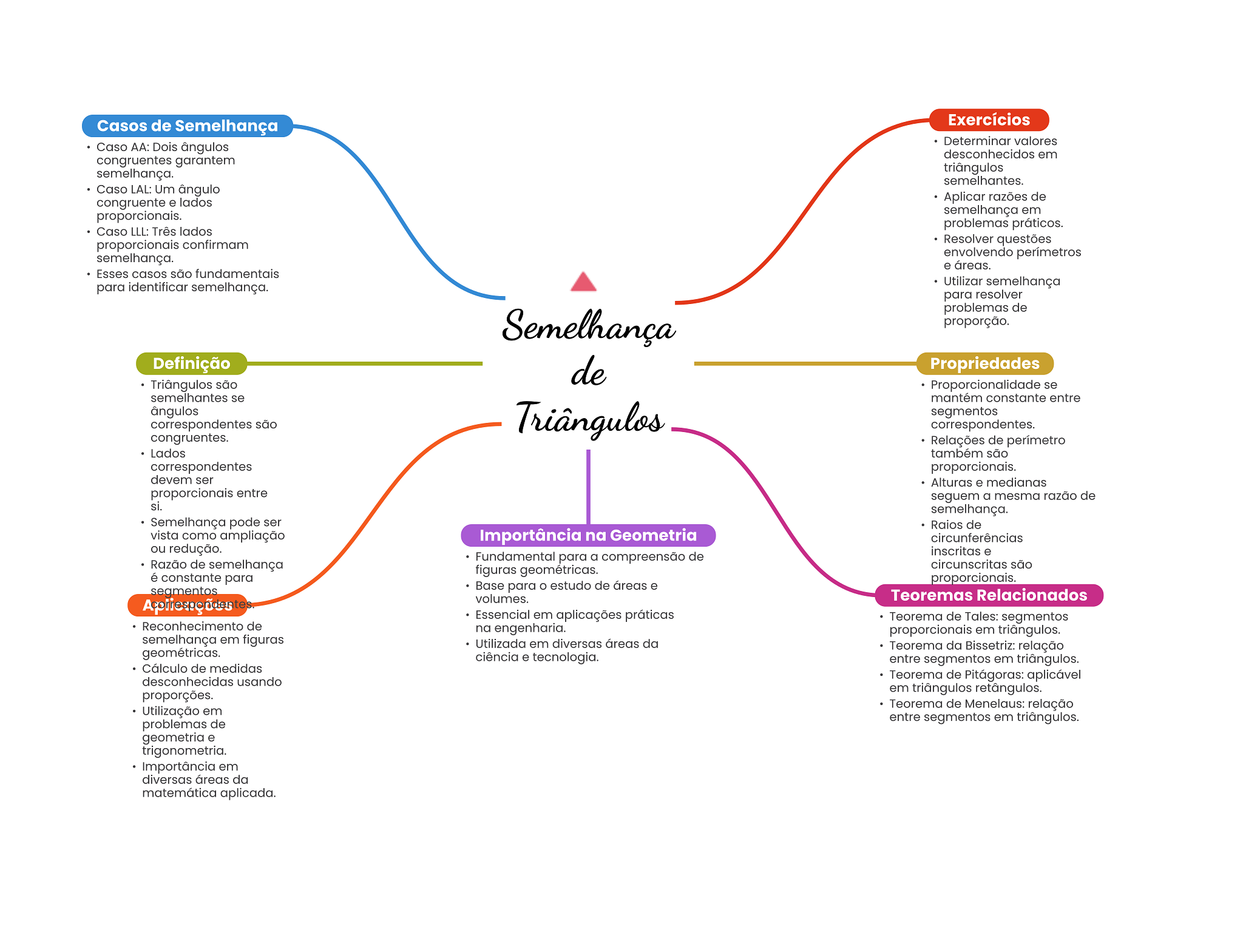 Casos de Semelhança Exercícios Determinar valores Caso AA: Dois ângulos desconhecidos em congruentes garantem semelhança. triângulos semelhantes. Caso LAL: Um ângulo congruente e lados Aplicar razões de proporcionais. semelhança em problemas práticos. Caso LLL: Três lados proporcionais confirmam Resolver questões semelhança. envolvendo perímetros e áreas. Esses casos são fundamentais para identificar semelhança. Utilizar semelhança para resolver problemas de Semelhança proporção. Definição de Propriedades Triângulos são Proporcionalidade se semelhantes se mantém constante entre ângulos correspondentes são Triângulos segmentos correspondentes. congruentes. Relações de Lados também são correspondentes proporcionais. devem ser Alturas e medianas proporcionais entre seguem a mesma razão de si. semelhança. Semelhança pode ser Raios de vista como ampliação Importância na Geometria circunferências ou redução. inscritas e Fundamental para a compreensão de Razão de semelhança figuras geométricas. circunscritas são é constante para proporcionais. segmentos Base para estudo de áreas e volumes. Teoremas Relacionados Essencial em aplicações práticas Teorema de Tales: segmentos Reconhecimento de na engenharia. proporcionais em triângulos. semelhança em figuras Utilizada em diversas áreas da geométricas. Teorema da Bissetriz: relação ciência e tecnologia. entre segmentos em triângulos. Cálculo de medidas desconhecidas usando Teorema de Pitágoras: aplicável proporções. em triângulos retângulos. Utilização em Teorema de Menelaus: relação problemas de entre segmentos em triângulos. geometria e trigonometria. Importância em diversas áreas da matemática aplicada.