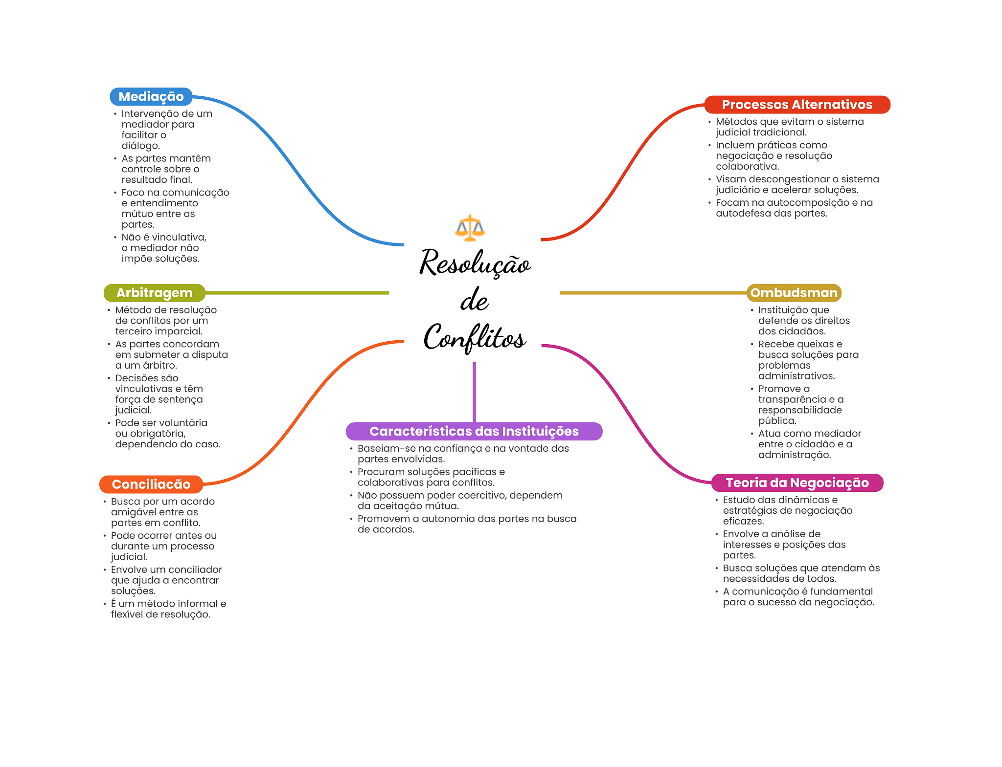 Mediação Processos Alternativos Intervenção de um mediador para Métodos que evitam sistema facilitar judicial tradicional. diálogo. Incluem práticas como As partes mantêm negociação e resolução controle sobre colaborativa. resultado final. Visam descongestionar sistema Foco na comunicação judiciário e acelerar soluções. e entendimento Focam na autocomposição e na mútuo entre as autodefesa das partes. partes. Não é vinculativa, mediador não impõe soluções. Resolução Arbitragem de Ombudsman Método de resolução Instituição que de conflitos por um defende direitos terceiro imparcial. Conflitos dos cidadãos. As partes concordam Recebe queixas e em submeter a disputa busca soluções para a um árbitro. problemas Decisões são administrativos. vinculativas e têm Promove a força de sentença transparência e a judicial. responsabilidade Pode ser voluntária pública. ou obrigatória, Características das Instituições Atua como mediador dependendo do caso. Baseiam-se na confiança e na vontade das partes envolvidas. administração. Procuram soluções pacíficas e colaborativas para conflitos. Teoria da Negociação Não possuem poder coercitivo, dependem Busca por um acordo Estudo das dinâmicas e da aceitação mútua. amigável entre as estratégias de negociação partes em conflito. Promovem a autonomia das partes na busca eficazes. de acordos. Pode ocorrer antes ou Envolve a análise de durante um processo interesses e posições das judicial. partes. Envolve um conciliador Busca soluções que atendam às que ajuda a encontrar necessidades de todos. soluções. A comunicação é fundamental É um método informal e para sucesso da negociação. flexível de resolução.