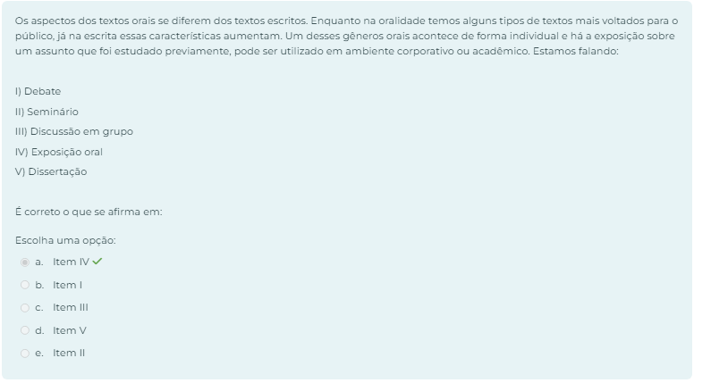 Os aspectos dos textos orais se diferem dos textos escritos. Enquanto na oralidade temos alguns tipos de textos mais voltados para público, já na escrita essas aumentam. Um desses orais acontece de forma individual e a exposição sobre um assunto que foi estudado previamente, pode ser utilizado em ambiente corporativo ou Estamos falando: Debate II) III) Discussão em grupo IV) Exposição oral V) Dissertação É correto que se afirma em: Escolha uma opção: a. Item IV C. Item III e. Item II