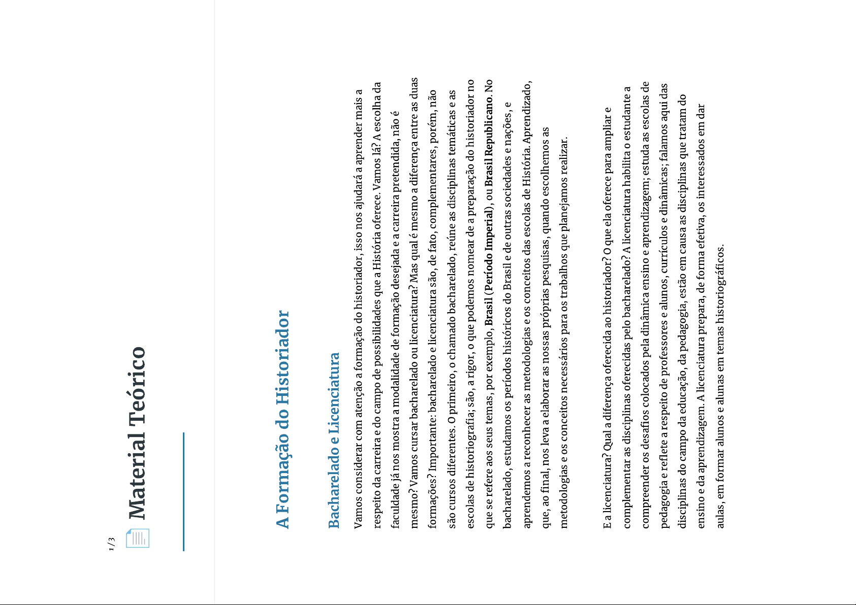1/3 Material Teórico Formação do Historiador Bacharelado e Licenciatura Vamos considerar com atenção a formação do historiador, isso nos ajudará a aprender mais a respeito da carreira e do campo de possibilidades que a História oferece. Vamos lá? A escolha da faculdade já nos mostra a modalidade de formação desejada e a carreira pretendida, não é mesmo? Vamos cursar bacharelado ou licenciatura? Mas qual é mesmo a diferença entre as duas formações? Importante: bacharelado e licenciatura são, de fato, complementares, porém, não são cursos diferentes. o primeiro, o chamado bacharelado, reúne as disciplinas temáticas e as escolas de historiografia; são, a rigor, o que podemos nomear de a preparação do historiador no que se refere aos seus temas, por exemplo, Brasil (Período Imperial), ou Brasil Republicano. No bacharelado, estudamos os períodos históricos do Brasil e de outras sociedades e nações, e aprendemos a reconhecer as metodologias e os conceitos das escolas de História. Aprendizado, que, ao final, nos leva a elaborar as nossas próprias pesquisas, quando escolhemos as metodologias e os conceitos necessários para os trabalhos que planejamos realizar. E a licenciatura? Qual a diferença oferecida ao historiador? o que ela oferece para ampliar e complementar as disciplinas oferecidas pelo bacharelado? A licenciatura habilita estudante a compreender os desafios colocados pela dinâmica ensino e aprendizagem; estuda as escolas de pedagogia e reflete a respeito de professores e alunos, currículos e dinâmicas; falamos aqui das disciplinas do campo da educação, da pedagogia, estão em causa as disciplinas que tratam do ensino e da aprendizagem. A licenciatura prepara, de forma efetiva, os interessados em dar aulas, em formar alunos e alunas em temas historiográficos.Figura 1 - Estante de livros Fonte: Getty Images #ParaTodosVerem: fotografia. Vê-se imagem de prateleira de livros, observamos as lombadas. A imagem sugere biblioteca na qual estudamos e aprendemos. Fim da descrição. Assim, o interessado em História pode cursar o bacharelado que lhe garantirá formação para atuar como pesquisador, autor de relatórios e pareceres de análise historiográfica; por exemplo, considere que precisamos de parecer técnico a respeito de imóvel que está em processo de tombamento, e, para tanto, precisamos de um relatório que pesquise e analise as características do imóvel e o interesse de preservação. Em síntese, podemos afirmar que ao interessado em atuar no campo da pesquisa, cabe o bacharelado; já, ao cursar licenciatura, você complementa a sua formação em História, o(a) nosso(a) estudante habilita-se a um campo maior: pode atuar como pesquisador(a) e, de igual maneira, atuar no ensino. A escolha entre uma formação ou outra define os aspectos das carreiras possíveis e, dessa forma, a nossa entrada na carreira. Acertado campo, sabemos o que os chamados bacharelado e licenciatura podem oferecer aos nossos futuros profissionais. Um e outro campo, pesquisa e ensino, precisam de profissionais com especializações e formações específicas. Vejamos com atenção:Quando nos referimos à formação em temas da educação, de fato, consideramos diferentes profissionais professores, gestores, coordenadores, diretores, etc. que, cada qual de acordo com a sua formação, atende às necessidades das relações educacionais. Cada função demanda especialização e preparação adequadas. que significa preparação adequada? A rigor, todos partem da mesma formação inicial, e, ao longo de seus cursos, procuram dar maior ênfase aos seus interesses, especializando-se em determinadas demandas. Dentro do que chamamos de formação em temas da educação, verificamos que há particularidades e especificidades que pedem adequações especiais cursos e especializações que preparam os nossos profissionais para a execução de atividades determinadas. Desde os anos iniciais de nossos jovens estudantes em suas faculdades, há, portanto, caminhos a serem escolhidos. As instituições de ensino nos oferecem o currículo básico para a nossa formação profissional, formação que deverá ser redefinida para atender nossos projetos profissionais. À formação básica e fundamental de professores, escolhemos cursos e especializações que nos capacitem e nos permitam concorrer, por exemplo, a vagas de diretores de instituições de ensino. Quando conhecemos as normas e as legislações que organizam a educação no país, aprendemos o quanto a composição de ações e de profissionais na área de educação é diversa, para tanto, cada campo de atuação demanda estudo e formação adequados. Assim, será preciso acumular experiência em certas áreas para nos habilitarmos aos concursos e aos exames de seleção. Concursos? Exames de seleção? Sim, a área escolhida por você faz uso de concursos públicos e exames de seleção para a admissão de profissionais. As especializações cursos e 0 seu empenho em disciplinas específicas para a carreira que deseja trilhar farão a diferença. Ao fazer escolhas, o (a) profissional será capaz de preparar a sua formação e carreira. exemplo escolhido diz respeito a profissionais que desejam trabalhar na educação - ensino, gestão, etc. mas e aquele que deseja ser pesquisador? Há formação específica? Sim, vamos considerar o caso. que interessa ao nosso historiador? Qual campo lhe interesse pesquisar? Voltemos ao exemplo que empregamos anteriormente, isto é, Brasil Império e Brasil Republicano. Falamos aqui de dois períodos diferentes da nossa História, o primeiro, cobre os anos de 1822 e 1889, o segundo, 1889 até os dias atuais. Durante o período de formação inicial, ou seja, a faculdade, ambos os períodos serão objeto de estudo e de atividades, passo seguinte, imaginemos que você deseja se especializar em suas pesquisas no Brasil Império.À formação básica, você acrescentará dedicação e esp