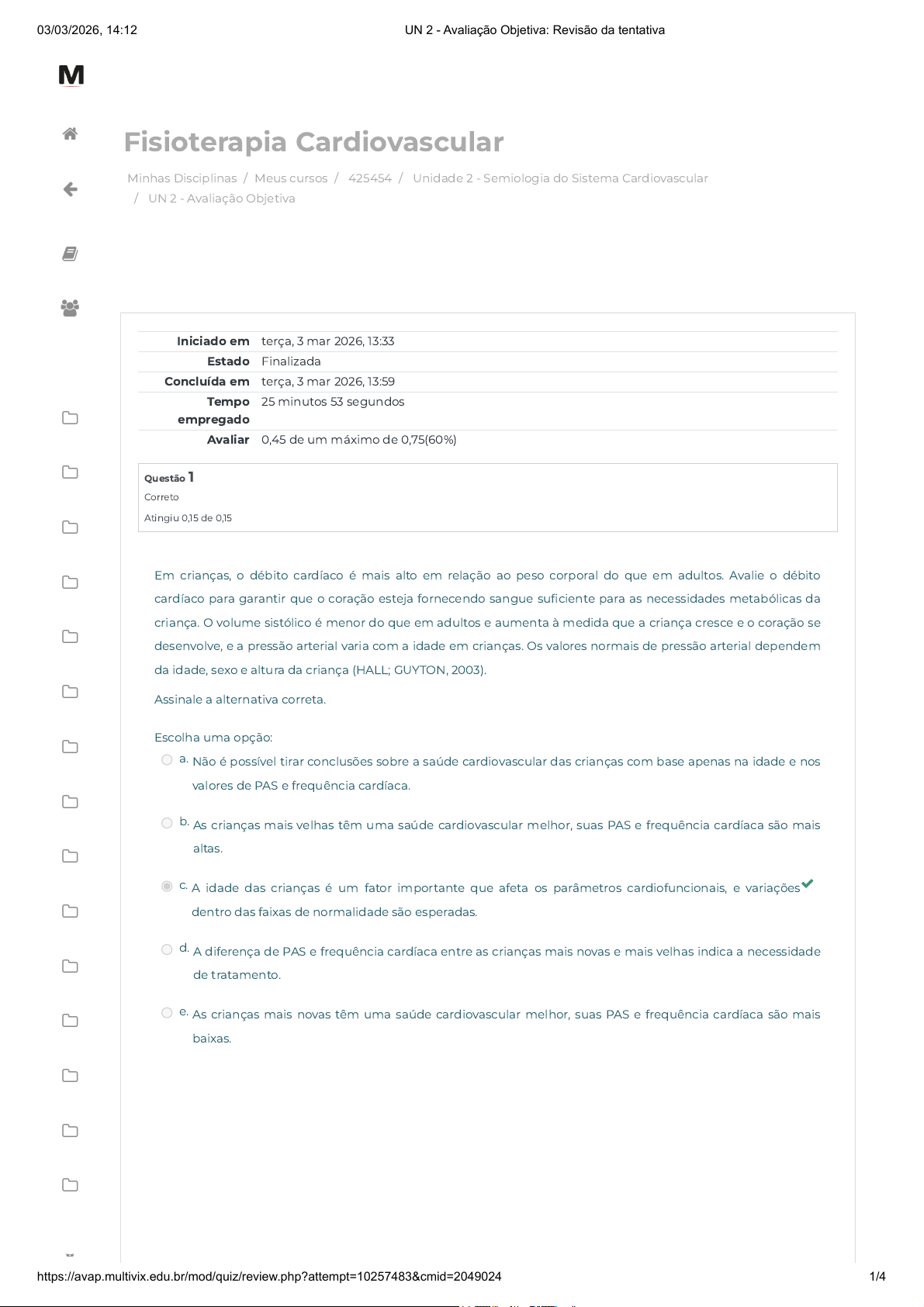 Minhas Disciplinas / Meus cursos / 425454 / Unidade 2 - Semiologia do Sistema Cardiovascular / UN 2 - Avaliação Objetiva Fisioterapia Cardiovascular Iniciado em terça, 3 mar 2026, 13:33 Estado Finalizada Concluída em terça, 3 mar 2026, 13:59 Tempo empregado 25 minutos 53 segundos Avaliar 0,45 de um máximo de 0,75(60%) Questão 1 Correto Atingiu 0,15 de 0,15 Em crianças, o débito cardíaco é mais alto em relação ao peso corporal do que em adultos. Avalie o débito cardíaco para garantir que o coração esteja fornecendo sangue suficiente para as necessidades metabólicas da criança. O volume sistólico é menor do que em adultos e aumenta à medida que a criança cresce e o coração se desenvolve, e a pressão arterial varia com a idade em crianças. Os valores normais de pressão arterial dependem da idade, sexo e altura da criança (HALL; GUYTON, 2003). Assinale a alternativa correta. Escolha uma opção: a. Não é possível tirar conclusões sobre a saúde cardiovascular das crianças com base apenas na idade e nos valores de PAS e frequência cardíaca. b. As crianças mais velhas têm uma saúde cardiovascular melhor, suas PAS e frequência cardíaca são mais altas. c. A idade das crianças é um fator importante que afeta os parâmetros cardiofuncionais, e variações dentro das faixas de normalidade são esperadas. d. A diferença de PAS e frequência cardíaca entre as crianças mais novas e mais velhas indica a necessidade de tratamento. e. As crianças mais novas têm uma saúde cardiovascular melhor, suas PAS e frequência cardíaca são mais baixas. 03/03/2026, 14:12 UN 2 - Avaliação Objetiva: Revisão da tentativa https://avap.multivix.edu.br/mod/quiz/review.php?attempt=10257483&cmid=2049024 1/4 https://avap.multivix.edu.br/my/ https://avap.multivix.edu.br/course/view.php?id=39012 https://avap.multivix.edu.br/course/view.php?id=39012§ion=3 https://avap.multivix.edu.br/mod/quiz/view.php?id=2049024 https://avap.multivix.edu.br/my/ https://avap.multivix.edu.br/course/view.php?id=39012 https://avap.multivix.edu.br/user/index.php?id=39012 https://avap.multivix.edu.br/course/view.php?id=39012§ion=1 https://avap.multivix.edu.br/course/view.php?id=39012§ion=2 https://avap.multivix.edu.br/course/view.php?id=39012§ion=3 https://avap.multivix.edu.br/course/view.php?id=39012§ion=4 https://avap.multivix.edu.br/course/view.php?id=39012§ion=5 https://avap.multivix.edu.br/course/view.php?id=39012§ion=6 https://avap.multivix.edu.br/course/view.php?id=39012§ion=7 https://avap.multivix.edu.br/course/view.php?id=39012§ion=8 https://avap.multivix.edu.br/course/view.php?id=39012§ion=9 https://avap.multivix.edu.br/course/view.php?id=39012§ion=10 https://avap.multivix.edu.br/course/view.php?id=39012§ion=11 https://avap.multivix.edu.br/course/view.php?id=39012§ion=12 https://avap.multivix.edu.br/course/view.php?id=39012§ion=13 https://avap.multivix.edu.br/course/view.php?id=39012§ion=14 https://avap.multivix.edu.br/course/view.php?id=39012§ion=15 https://avap.multivix.edu.br/hooks/portal/ https://avap.multivix.edu.br/ https://avap.multivix.edu.br/ https://avap.multivix.edu.br/ https://avap.multivix.edu.br/ https://avap.multivix.edu.br/ Questão 2 Incorreto Atingiu 0,00 de 0,15 A frequência cardíaca normal em crianças varia com a idade. Em recém-nascidos, a frequência cardíaca em repouso é geralmente de 120 a 160 batimentos por minuto (bpm) e diminui à medida que a criança cresce. Em crianças mais velhas, a FC em repouso tende a ser menor, normalmente entre 70 e 100 bpm (HALL; GUYTON, 2003). Um grupo de crianças está participando de um teste de esforço físico supervisionado para avaliar sua capacidade cardiovascular. Durante o teste, foram registrados os tempos que cada criança levou para completar uma corrida de 1.000 metros. Os resultados mostraram uma variação significativa nos tempos, com algumas crianças mais jovens superando as mais velhas. Qual opção é a adequada nessa situação? Escolha uma opção: a. As crianças mais jovens têm uma capacidade cardiovascular superior, já que conseguiram correr mais rápido. b. As crianças mais velhas têm uma capacidade cardiovascular superior, pois são mais experientes em atividades físicas. c. A capacidade cardiovascular varia amplamente entre as crianças devido a fatores como nível de condicionamento físico e motivação pessoal. d. Não é possível tirar conclusões sobre a capacidade cardiovascular das crianças com base apenas nos tempos de corrida, pois outros fatores podem influenciar o desempenho. e. A diferença nos tempos de corrida entre as crianças mais jovens e mais velhas indica uma preocupação médica e necessidade de tratamento. 03/03/2026, 14:12 UN 2 - Avaliação Objetiva: Revisão da tentativa https://avap.multivix.edu.br/mod/quiz/review.php?attempt=10257483&cmid=2049024 2/4 https://avap.multivix.edu.br/my/ https://avap.multivix.edu.br/course/view.php?id=39012 https://avap.multivix.edu.br/user/index.php?id=39012 https://avap.multivix.edu.br/course/view.php?id=39012§ion=1 https://avap.multivix.edu.br/course/view.php?id=39012§ion=2 https://avap.multivix.edu.br/course/view.php?id=39012§ion=3 https://avap.multivix.edu.br/course/view.php?id=39012§ion=4 https://avap.multivix.edu.br/course/view.php?id=39012§ion=5 https://avap.multivix.edu.br/course/view.php?id=39012§ion=6 https://avap.multivix.edu.br/course/view.php?id=39012§ion=7 https://avap.multivix.edu.br/course/view.php?id=39012§ion=8 https://avap.multivix.edu.br/course/view.php?id=39012§ion=9 https://avap.multivix.edu.br/course/view.php?id=39012§ion=10 https://avap.multivix.edu.br/course/view.php?id=39012§ion=11 https://avap.multivix.edu.br/course/view.php?id=39012§ion=12 https://avap.multivix.edu.br/course/view.php?id=39012§ion=13 https://avap.multivix.edu.br/course/view.php?id=39012§ion=14 https://avap.multivix.edu.br/course/view.php?id=39012§ion=15 https://avap.multivix.edu.br/hooks/portal/ https://avap.m
