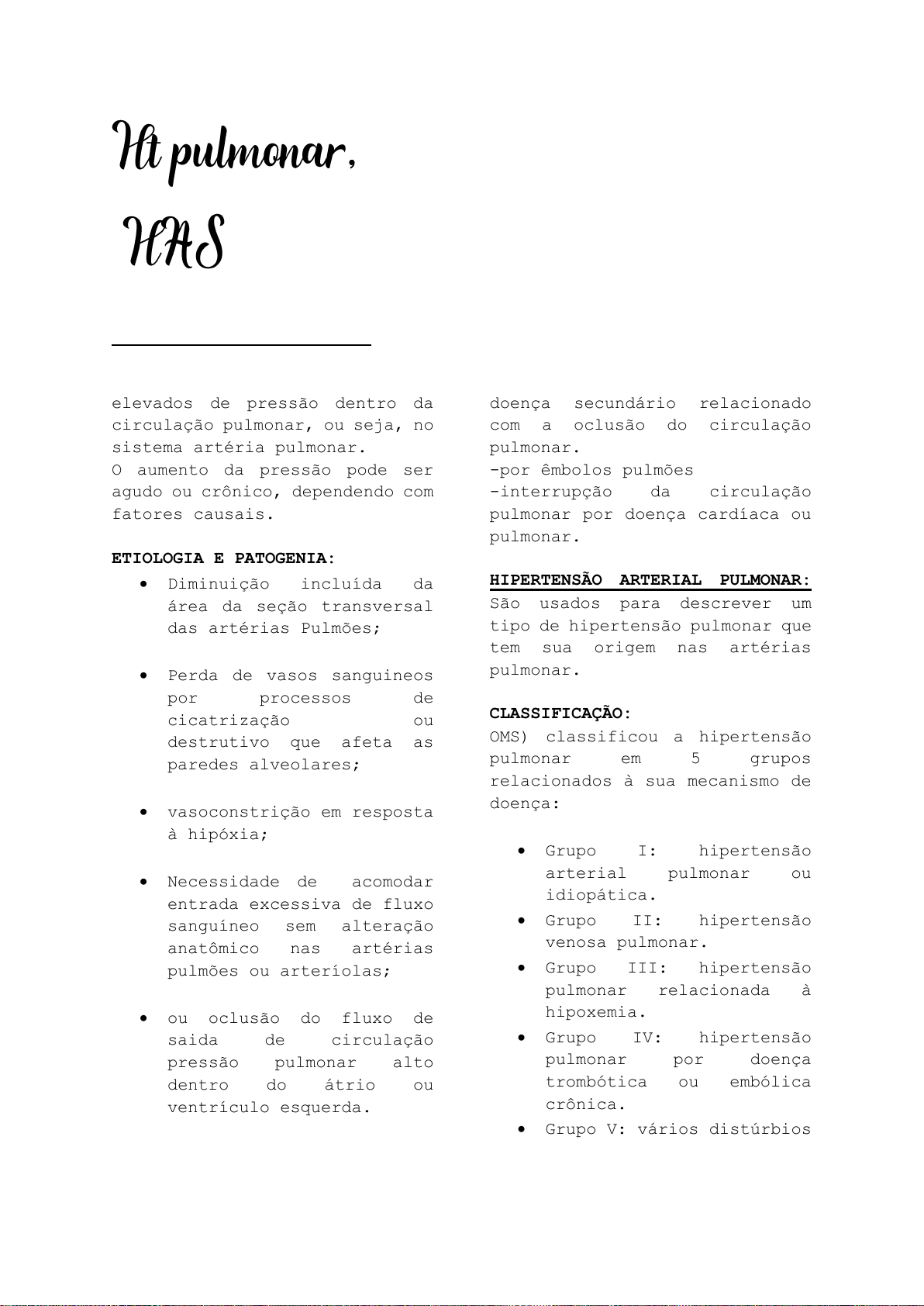 HIPERTENSÃO PULMONAR: A hipertensão pulmonar é uma doença caracterizada por níveis elevados de pressão dentro da circulação pulmonar, ou seja, no sistema artéria pulmonar. O aumento da pressão pode ser agudo ou crônico, dependendo com fatores causais. ETIOLOGIA E PATOGENIA: Diminuição incluída da área da seção transversal das artérias Pulmões; Perda de vasos sanguineos por processos de cicatrização ou destrutivo que afeta as paredes alveolares; vasoconstrição em resposta à hipóxia; Necessidade de acomodar entrada excessiva de fluxo sanguíneo sem alteração anatômico nas artérias pulmões ou arteríolas; ou oclusão do fluxo de saida de circulação pressão pulmonar alto dentro do átrio ou ventrículo esquerda. -O transtorno pode ser devido a alterações parede arterial, frequentemente chamado hipertensão arterial pulmonar. -Ou se desenvolver como uma doença secundário relacionado com a oclusão do circulação pulmonar. -por êmbolos pulmões -interrupção da circulação pulmonar por doença cardíaca ou pulmonar. HIPERTENSÃO ARTERIAL PULMONAR: São usados para descrever um tipo de hipertensão pulmonar que tem sua origem nas artérias pulmonar. CLASSIFICAÇÃO: OMS) classificou a hipertensão pulmonar em 5 grupos relacionados à sua mecanismo de doença: Grupo I: hipertensão arterial pulmonar ou idiopática. Grupo II: hipertensão venosa pulmonar. Grupo III: hipertensão pulmonar relacionada à hipoxemia. Grupo IV: hipertensão pulmonar por doença trombótica ou embólica crônica. Grupo V: vários distúrbios que causam HAP Mobile User ETIOLOGIA E PATOGENIA: - O gene do receptor de proteína morfogenética óssea tipo II (BMPR2), que codifica para um membro da superfamília do receptor do fator crescimento transformador (FCT-β) foi identificado como causa de HAP familiar. -Acredita-se que mutações nesses receptores previnam que o TGF-β e moléculas relacionadas exercem um efeito inibitório do músculo liso e da proliferação celular Endotelial. -Distúrbios vasculares do colágeno (por exemplo, esclerodermia), -Drogas e toxinas, -Infecção pelo vírus da imunodeficiência humana (HIV) -Hipertensão portal e hipertensão pulmonar persistente no recém-nascido MANIFESTAÇÕES CLINICAS A HAP é definida pela elevação persistente de a pressão das artérias pulmonares com pressões ventriculares esquerdas normais, que a diferença entre insuficiência cardíaca e lado esquerdo. • Os sintomas geralmente progridem de dificuldade para respiratória e diminuição da tolerância a exercício para insuficiência cardíaca direita, • Com edema periférico notável e limitações funcional. • Outros sintomas comuns incluem fadiga, angina e síncope ou quase síncope. DIAGNOSTICO - O Dx da hipertensão pulmonar primário é baseado na ausência de distúrbios que causam hipertensão pressão secundária e arterial pulmões médios maiores superior a 25 mm Hg em repouso ou 30 mm Hg com exercício. TRATAMENTO: O tratamento consiste em medidas para melhorar função cardíaca direita como meio de reduzir fadiga e edema periférico. • Oxigênio suplementar pode ser usado para aumentar a tolerância ao exercício. • Sildenafil, que atua de forma semelhante à ferrugem nítrico para produzir vasodilatação • O transplante pulmonar pode ser uma alternativa para pessoas que não respondem a outros tratamentos. HIPERTENSÃO PULMONAR SECUNDARIA: Embora a hipertensão pulmonar possa se desenvolver como um distúrbio primário, quase todos os casos são secundários a condições como: Hipoxemia crônica devido a DPOC, IDP oudistúrbios respiratórios relacionados ao sono; aumento da resistência à drenagem venosa pulmonar por condições como disfunção diastólica do coração esquerda ou distúrbios das válvulas mitral ou aórtica; ou distúrbios tromboembólicos crónicos. ETIOLOGIA E PATOGENIA: A exposição contínua dos vasos pulmonares à A hipoxemia é uma causa comum de hipertensão pulmonar. • A diferença dos vasos sanguíneos da circulação sistêmica, a maioria das quais se dilata em resposta a Mobile User hipoxemia e hipercapnia, os vasos pulmonares se contraem. • Outra causa de hipertensão pulmonar secundária é obstrução do fluxo sanguíneo pulmonar causada por tromboembolismo pulmonar. MANIFESTAÇÕES CLINICAS: Sinais e sintomas de hipertensão pulmonar secundário pressão arterial pulmonar elevada como doenças cardíacas ou pulmão subjacente. DIAGNOSTICO: resultados radiográficos, ecocardiografía y ecografía Doppler. TRATAMENTO: As medidas de tratamento são abordar o distúrbio subjacente. Tratamento com vasodilatadores pode ser indicado para alguns pessoas. HIPERTENSÃO ARTERIAL SISTEMICA -Principal fator de risco para enfermidades cardiovasculares. -Mais comum em varones jovens. -Os varones tem mais pre disposição que as mulheres até que elas cheguem na menopausa, que é quando elas perdem essa proteção hormonal frente a hipertensão. -Mais comum na raça negra, classe economica baixa e a hipertensão aumenta com a idade. CLASSIFICAÇÃO: Hipertensão primária (essencial) é o termo aplicado a 95% dos casos em que não é possível identificar uma causa para a hipertensão. Na hipertensão secundária, o aumento da pressão arterial é devido a uma causa subjacente identificável, como doença renal ou endócrino. HIPERTENSÃO PRIMARIA: - Embora as causas sejam desconhecido, o estilo de vida contribui. FATORES DE RISCO NÃO MODIFICAVEIS: história familiar de hipertensão, Aumentos na pressão arterial relacionados a envelhecimento e etnia. Outro fator que parece contribuir para a hipertensão é resistência à insulina e a hiperinsulinemia que acompanha distúrbios metabólicos, como diabetes tipo 2. FATPRES DE RISCO MODIFICAVEIS Alta ingestão de sal, ingestão máxima de 6 g/dia Consumo excessivo de calorias e obesidade, A perda de apenas 4,5 kg pode ser acompanhada por um diminuição da pressão a