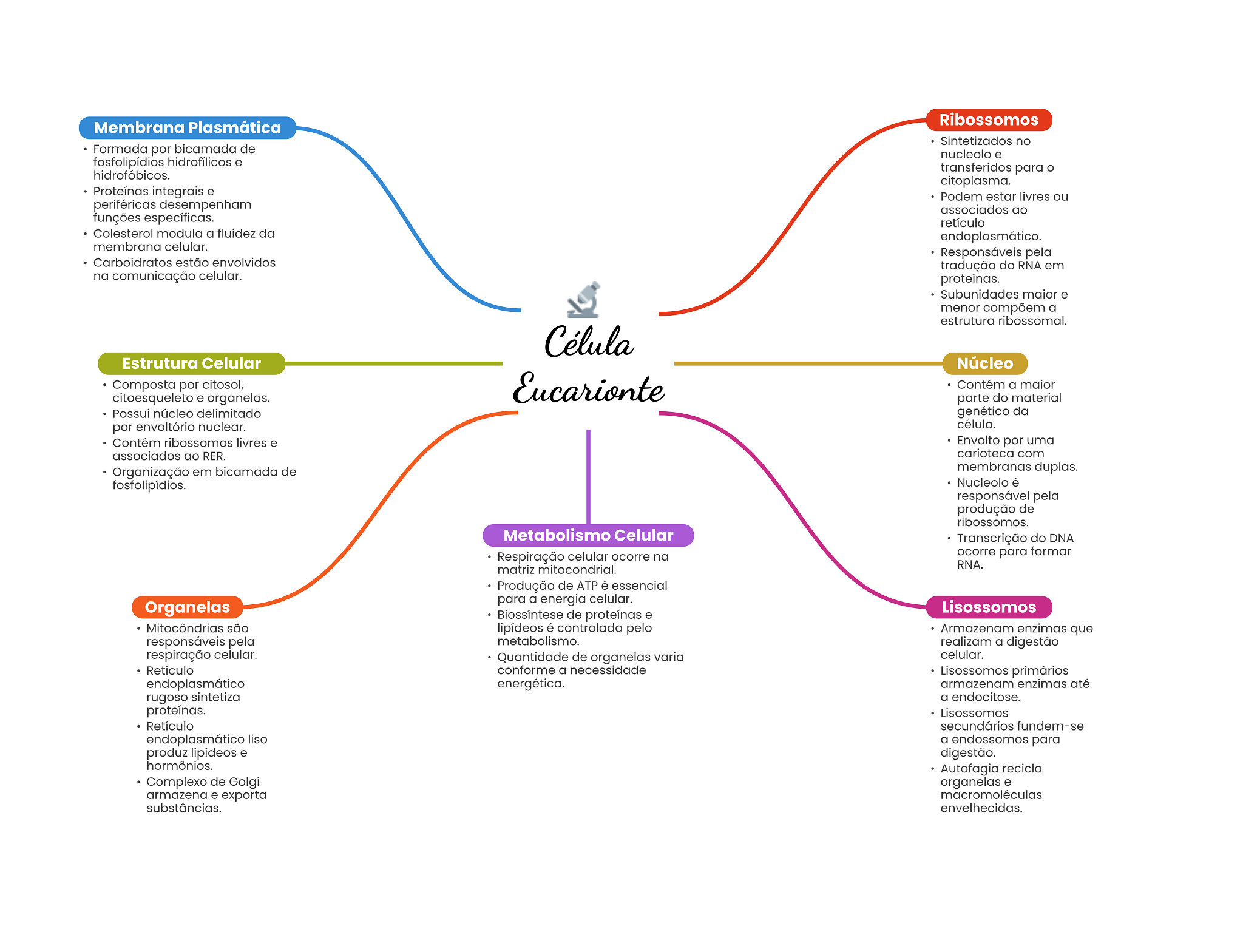 Membrana Plasmática Ribossomos Sintetizados no Formada por bicamada de nucleolo e fosfolipídios hidrofílicos e transferidos para O hidrofóbicos. citoplasma. Proteínas integrais e Podem estar livres ou periféricas desempenham associados ao funções específicas. retículo Colesterol modula a fluidez da endoplasmático. membrana celular. Responsáveis pela Carboidratos estão envolvidos tradução do RNA em na comunicação celular. proteínas. Subunidades maior e menor compõem a estrutura ribossomal. Célula Estrutura Celular Núcleo Composta por citosol, citoesqueleto e organelas. Eucarionte Contém a maior parte do material Possui núcleo delimitado genético da por envoltório nuclear. célula. Contém ribossomos livres e Envolto por uma associados ao RER. carioteca com Organização em bicamada de membranas duplas. fosfolipídios. Nucleolo é responsável pela produção de ribossomos. Metabolismo Celular Transcrição do DNA Respiração celular ocorre na ocorre para formar matriz mitocondrial. RNA. Produção de ATP é essencial para a energia celular. Organelas Lisossomos Biossíntese de proteínas e Mitocôndrias são lipídeos é controlada pelo Armazenam enzimas que responsáveis pela metabolismo. realizam a digestão respiração celular. Quantidade de organelas varia celular. Retículo conforme a necessidade Lisossomos primários endoplasmático energética. armazenam enzimas até rugoso sintetiza a endocitose. proteínas. Lisossomos Retículo secundários fundem-se endoplasmático liso a endossomos para produz lipídeos e digestão. hormônios. Autofagia recicla Complexo de Golgi organelas e armazena e exporta macromoléculas substâncias. envelhecidas.