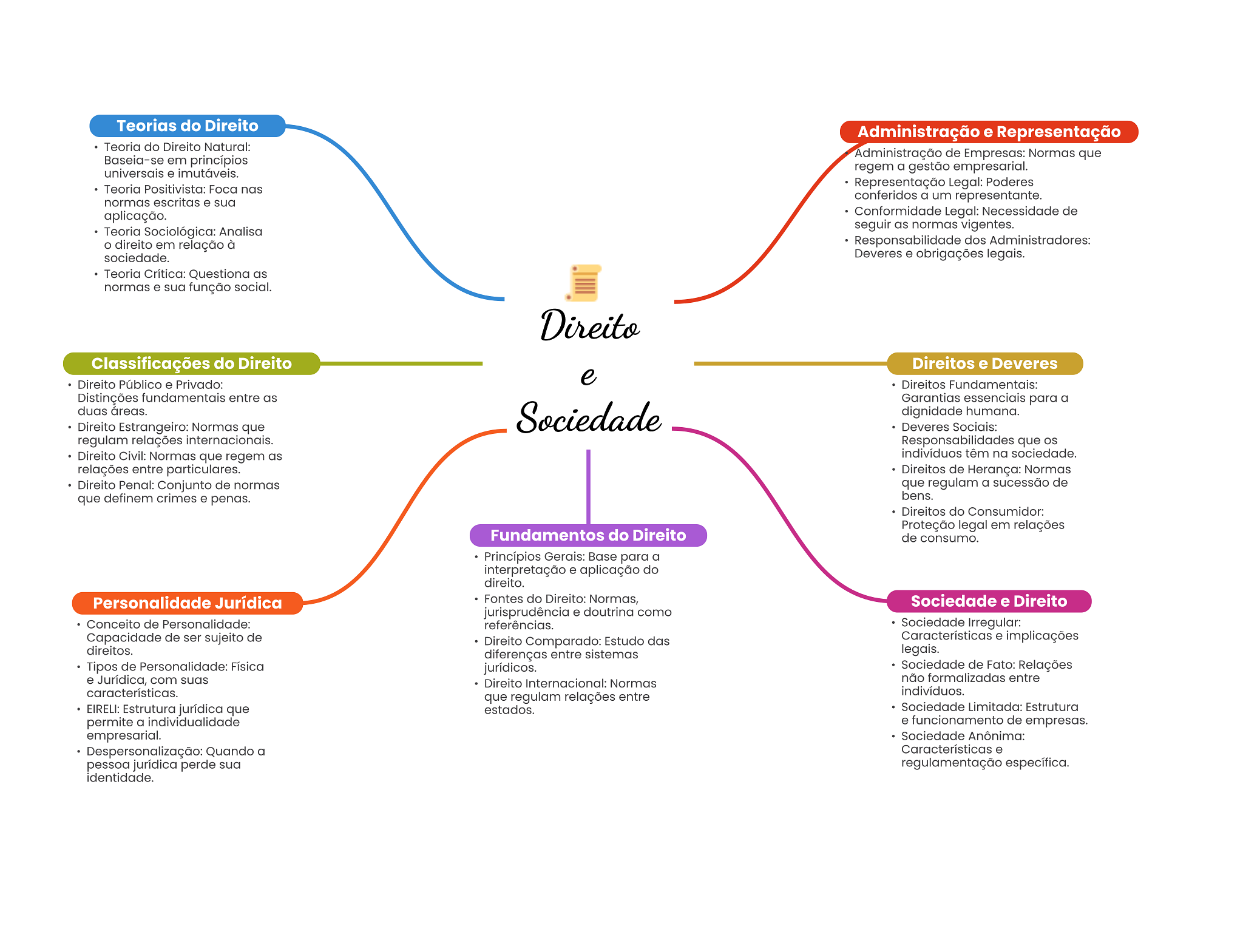 Teorias do Direito Administração e Representação Teoria do Direito Natural: Administração de Empresas: Normas que Baseia-se em princípios universais e imutáveis. regem a gestão empresarial. Teoria Positivista: Foca nas Representação Legal: Poderes normas escritas e sua conferidos a um representante. aplicação. Conformidade Legal: Necessidade de Teoria Sociológica: Analisa seguir as normas vigentes. O direito em relação à Responsabilidade dos Administradores: sociedade. Deveres e obrigações legais. Teoria Crítica: Questiona as normas e sua função social. Direito Classificações do Direito Direitos e Deveres Direito Público e Privado: e Direitos Fundamentais: Distinções fundamentais entre as Garantias essenciais para a duas áreas. Direito Estrangeiro: Normas que Sociedade dignidade humana. Deveres Sociais: regulam relações internacionais. Responsabilidades que Direito Civil: Normas que regem as indivíduos têm na sociedade. relações entre particulares. Direitos de Herança: Normas Direito Penal: Conjunto de normas que regulam a sucessão de que definem crimes e penas. bens. Direitos do Consumidor: Proteção legal em relações Fundamentos do Direito de consumo. Princípios Gerais: Base para a interpretação e aplicação do direito. Personalidade Jurídica Fontes do Direito: Normas, Sociedade e Direito jurisprudência e doutrina como Conceito de Personalidade: referências. Sociedade Irregular: Capacidade de ser sujeito de Direito Comparado: Estudo das Características e implicações direitos. diferenças entre sistemas legais. Tipos de Personalidade: Física jurídicos. Sociedade de Fato: Relações e Jurídica, com suas Direito Internacional: Normas não formalizadas entre características. indivíduos. que regulam relações entre EIRELI: Estrutura jurídica que estados. Sociedade Limitada: Estrutura permite a individualidade e = funcionamento de empresas. empresarial. Sociedade Anônima: Despersonalização: Quando a Características e pessoa jurídica perde sua regulamentação específica. identidade.