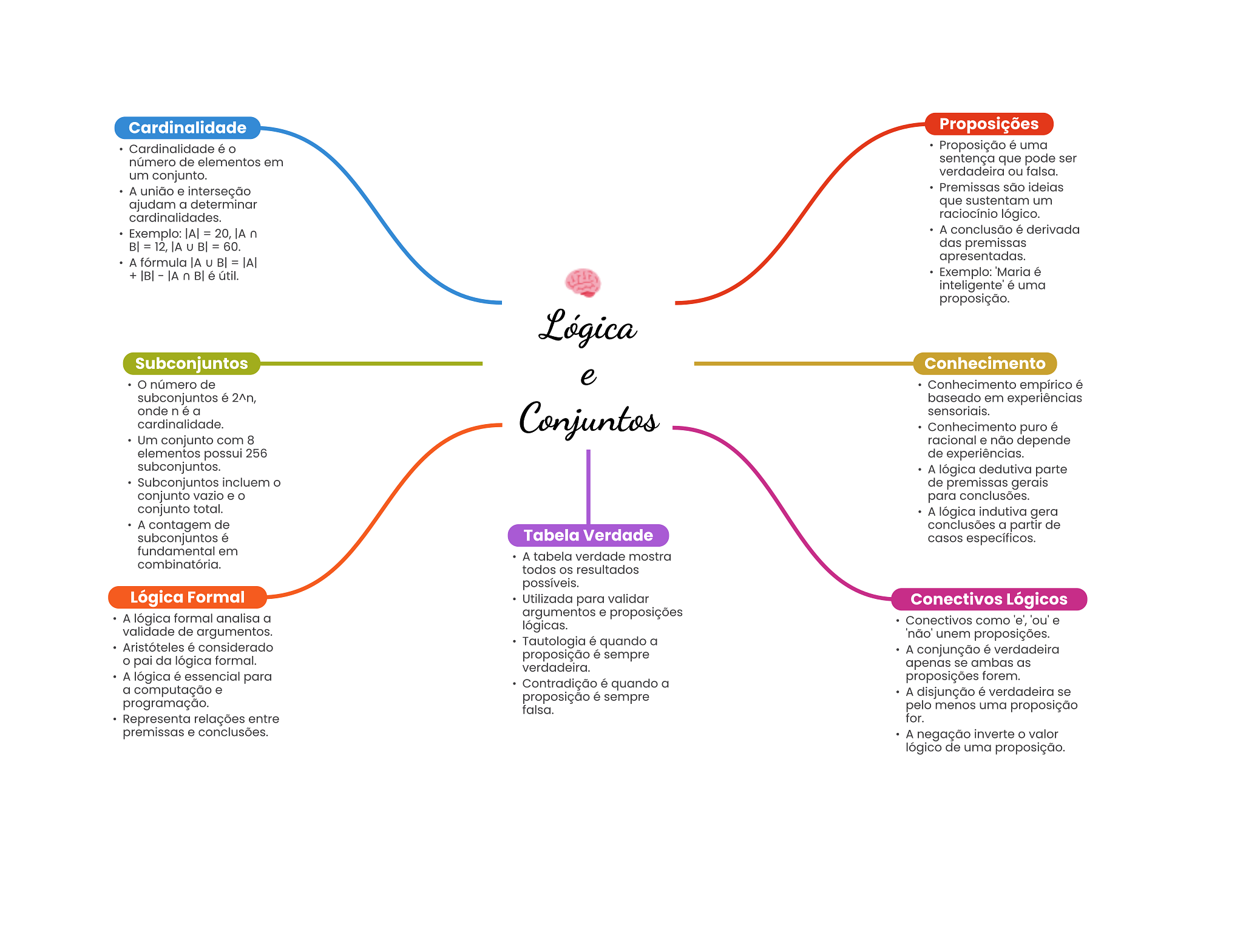 Cardinalidade Proposições Cardinalidade é Proposição é uma número de elementos em sentença que pode ser um conjunto. verdadeira ou falsa. A união e interseção Premissas são ideias ajudam a determinar que sustentam um cardinalidades. raciocínio lógico. Exemplo: = 20, n A conclusão é derivada B| = 12, U B| = 60. das premissas A fórmula U B| = apresentadas. + |B| IA n B| é útil. Exemplo: Maria é inteligente' é uma proposição. Lógica Subconjuntos Conhecimento número de e Conhecimento empírico é subconjuntos é 2^n, baseado em experiências ondenéa cardinalidade. Conjuntos sensoriais. Conhecimento puro é Um conjunto com 8 racional e não depende elementos possui 256 de experiências. subconjuntos. A lógica dedutiva parte Subconjuntos incluem de premissas gerais conjunto vazio e O para conclusões. conjunto total. A lógica indutiva gera A contagem de conclusões a partir de subconjuntos é Tabela Verdade casos específicos. fundamental em A tabela verdade mostra combinatória. todos OS resultados possíveis. Lógica Formal Utilizada para validar Conectivos Lógicos A lógica formal analisa a argumentos e proposições validade de argumentos. lógicas. Conectivos como 'e', 'ou' e 'não' unem proposições. Aristóteles é considerado Tautologia é quando a proposição é sempre A conjunção é verdadeira pai da lógica formal. verdadeira. apenas se ambas as A lógica é essencial para proposições forem. a computação e Contradição é quando a programação. proposição é sempre A disjunção é verdadeira se falsa. pelo menos uma proposição Representa relações entre for. premissas e conclusões. A negação inverte valor lógico de uma proposição.