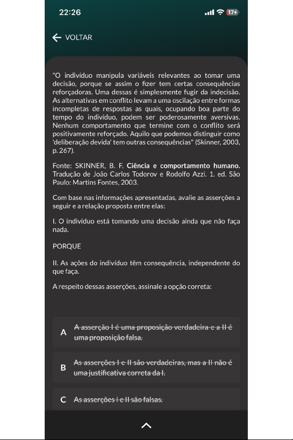 22:26 174 VOLTAR "O indivíduo manipula variáveis relevantes ao tomar uma decisão, porque se assim o fizer tem certas consequências reforçadoras. Uma dessas é simplesmente fugir da indecisão. As alternativas em conflito levam a uma oscilação entre formas incompletas de respostas as quais, ocupando boa parte do tempo do indivíduo, podem ser poderosamente aversivas. Nenhum comportamento que termine com conflito será positivamente reforçado. Aquilo que podemos distinguir como 'deliberação devida' tem outras consequências" (Skinner, 2003, p. 267). Fonte: SKINNER, B. F. Ciência e comportamento humano. Tradução de João Carlos Todorov e Rodolfo Azzi. 1. ed. São Paulo: Martins Fontes, 2003. Com base nas informações apresentadas, avalie as asserções a seguir e a relação proposta entre elas: I. O indivíduo está tomando uma decisão ainda que não faça nada. PORQUE II. As ações do indivíduo têm consequência, independente do que faça. A respeito dessas asserções, assinale a opção correta: A asserção lé uma proposição verdadeira e a H é A uma proposição falsa. As asserções le H são verdadeiras, mas a H não é uma justificativa correta da c As asserções le H são falsas.22:26 174 VOLTAR II. As ações do indivíduo têm consequência, independente do que faça. A respeito dessas asserções, assinale a opção correta: A asserção lé uma proposição verdadeira e a Hé uma proposição falsa. As asserções le H são verdadeiras, mas a H não é uma justificativa correta da c As asserções le H são falsas. A asserção lé uma proposição falsa e a H é uma D proposição verdadeira. As asserções e II são verdadeiras, e a é uma E justificativa correta da I.22:26 174 VOLTAR O ser humano tem evoluído nos últimos milênios, criando diversas tecnologias e formas de viver em uma sociedade digna e cidadã para todos. Essa evolução, apesar de ser sentida por toda a sociedade, é fomentada pelo Eu crítico, pensador, que busca sempre por novos desafios, crescimento pessoal e formação de um cidadão completo. Analisando o Eu pessoa e a sua evolução, na construção de um Você (família) e de um Nós, como sociedade, formam cidadãos mais completos. Com base nas informações apresentadas, assinale a alternativa correta: Eu passa por amadurecimento pessoal ao exercer nada, mas, assim mesmo, forma um Você e um Nós alinhados com os interesses coletivos. A evolução do Eu por meio de aquisição de conhecimentos, amadurecimento pessoal, fazendo o Eu tornar-se uma pessoa melhor em todos os aspectos, ajuda a formar um Você e um Nós mais justos e cidadãos, fazendo, assim, um mundo melhor. A evolução de algumas poucas pessoas é c suficiente para a geração de um mundo melhor. Eu é um sujeito omisso, repleto de D individualidade e carente de empatia. A evolução do Eu é inexistente na formação do E22:26 174 VOLTAR O exercício da Cidadania Ambiental está intimamente ligado à capacidade do cidadão de atuar como agente de mudança na sociedade. Isso depende do desenvolvimento da disposição e da competência do indivíduo para um envolvimento crítico, ativo e democrático na prevenção e resolução de problemas ambientais. Há um apelo por uma cidadania bem informada e empoderada para tomar ações adequadas à gravidade dos problemas ambientais que afetam o nosso mundo. Fonte: adaptado de: REIS, P. Cidadania ambiental e ativismo juvenil. ENCITEC-Ensino de Ciências e Tecnologia em Revista, [s. I.], V. 11, n. 2, p. 5-24, 2021. Disponível em: https://repositorio.ul.pt/handle/10451/49793 Acesso em: 18 jul. 2024. Considerando excerto e as práticas cidadãs voltadas para essa causa, analise as afirmativas a seguir: I. Abastecer com diesel para diminuir o consumo. II. Utilizar fontes de energia solares em regime total ou parcial de consumo. III. Participar de votações públicas que envolvam regulamentações de agrotóxicos. IV. Consumir produtos orgânicos importados que sejam produzidos em fazendas regulamentadas. É correto o que se afirma em: A II e III, apenas. c D22:27 174 VOLTAR Artigo 2 1. Todo ser humano tem capacidade para gozar os direitos e as liberdades estabelecidos nesta Declaração, sem distinção de qualquer espécie, seja de raça, cor, sexo, língua, religião, opinião política ou de outra natureza, origem nacional ou social, riqueza, nascimento, ou qualquer outra condição. 2. Não será também feita nenhuma distinção fundada na condição política, jurídica ou internacional do país ou território a que pertença uma pessoa, quer se trate de um território independente, sob tutela, sem governo próprio, quer sujeito a qualquer outra limitação de soberania. Fonte: adaptado de: universal-dos-direitos-humanos. Acesso em: 17 jul. 2024. Com base nas informações apresentadas, avalie as asserções a seguir e a relação proposta entre elas: I. Os limites estabelecidos pela declaração devem ser aplicados em conformidade com a legislação de cada nação. PORQUE II. Os limites impostos pela declaração buscam o bem-estar do indivíduo e do coletivo. A respeito dessas asserções, assinale a opção correta: As asserções le H são verdadeiras, mas a H não é A uma justificativa correta da I. A asserção I é uma proposição falsa e a é uma B proposição verdadeira.22:27 174 VOLTAR O conceito de cidadania foi expandido para incluir diversas perspectivas. Ele está relacionado a uma crescente interdependência e interconectividade entre os países nas esferas econômica, cultural e social, impulsionado pelo aumento do comércio internacional, migração e comunicação. Além disso, essa noção reflete nossas preocupações com o bem-estar global, indo além das fronteiras nacionais, com base na compreensão de que o bem-estar global tem um impacto direto sobre bem-estar nacional e local. Fonte: adaptado de: http://www.peaunesco- sp.com.br/encontros/nacional_2016/4%20Educacao%20para Acesso em: 23