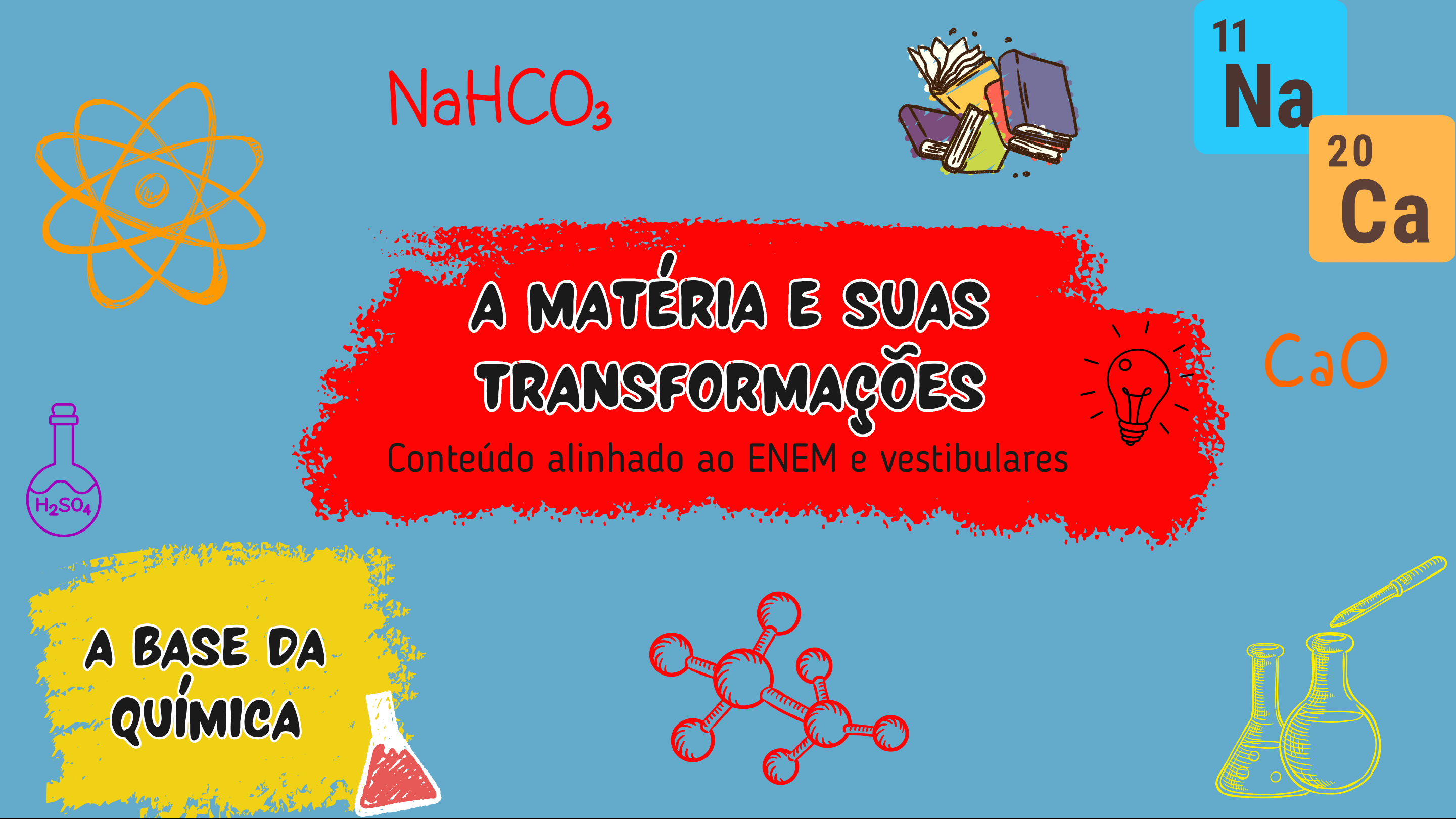 11 NaHCO3 Na 20 Ca A E SUAS TRANSFORMAÇÕES CaO Conteúdo alinhado ao ENEM e vestibulares H2SO4 A BASE DA QUÍMICASUMÁRIO 1.6 Propriedades da Matéria Propriedades Gerais da Matéria CAPÍTULO 1 - LINGUAGEM QUÍMICA EXTRA Propriedades Específicas da Matéria BONUS 1.1 A importância da linguagem química 1. Propriedades Organolépticas 1.2 Conceitos fundamentais: átomo, elemento e molécula 2. Propriedades Químicas Duas avaliações Átomo 3. Propriedades Físicas Diagnóticas Elementos químicos: a identidade da matéria 1.7 Substância Pura X Mistura Molécula Substância Pura 1.3 Substâncias Químicas Mistura Substância Simples 1.8 Processos de Separação de Mistura Substância Composta Processos de Separaçao de Misturas Heterogêneas 1.4 Matéria e suas transformações Processos de Separaçao de Misturas Homogêneas Fenômenos Físicos 1.9 Mapas-Resumo do Capítulo Substância Pura e Mistura Fenômenos Químicos Gráficos das Misturas Fenômenos Nucleares Processos de Separação de Mistura 1.5 Estados Físicos da Matéria Estados Físicos da Matéria Estado Sólido Fenômenos Químicos, Físicos e Nucleares. Estado Líquido 2.0 Agora é Sua Vez Estado Gasoso 2.1 Exercícios de fixação Mudanças de Estado Físico 2.2 Exercícios Complementares 2.3 Exercícios Enem @PROFESSORATAISFERNANDESCAPÍTULO 1 - LINGUAGEM QUÍMICA átomo é tão pequeno que não pode ser observado diretamente, mas sua estrutura define propriedades como reatividade, estabilidade e 1.1 A importância da linguagem química tipos de ligações. A Química é uma ciência que descreve fenômenos microscópicos por Elementos químicos: a identidade da matéria meio de símbolos, fórmulas e representações. Esse sistema simbólico H permite que cientistas, professores e estudantes comuniquem, de forma Cada elemento químico corresponde a um conjunto Ca rápida e universal, transformações extremamente complexas. Calcium Oxygenium de átomos que possuem a mesma característica Assim como a Matemática usa números e operações, a Química utiliza Au Cu Ag Fe fundamental: número atômico. Cuprum Argenium Ferrum Aurum símbolos, fórmulas e equações para representar a matéria e suas transformações. Essa linguagem aparece no cotidiano nos rótulos de Elemento químico alimentos, nas fórmulas de medicamentos, na composição de combustíveis e é indispensável em provas como ENEM e vestibulares. É conjunto de todos os átomos que possuem 0 mesmo número de prótons no núcleo. Essa característica permanece constante, independentemente do 1.2 Conceitos fundamentais: átomo, elemento e molécula estado físico, da forma como átomo aparece ou das combinações que realiza. Nesta seção, construímos a base de toda a Química. Cada termo aparece Elemento químico = mesmo número de prótons recorrentemente em exercícios, problemas e situações do dia a dia. Exemplos: Átomo Z = 1 -> Hidrogênio (H) É a unidade fundamental da matéria, contendo: Z = 8 Oxigênio (0) prótons (carga positiva); Z = 26 -> Ferro (Fe) nêutrons (sem carga); Z = 20 Cálcio (Ca) elétrons (carga negativa). ENEM gosta de explorar essa definição ao relacionar propriedades periódicas ou interpretar fórmulas químicas. @PROFESSORATAISFERNANDESMolécula 1.3 Substâncias Químicas União estável de dois ou mais átomos. Exemplos: Na Química, chamamos de substância todo material que possui H2O molécula de água composição definida e propriedades características, como ponto de fusão, ozônio ponto de ebulição e densidade. CO2 dióxido de carbono Exemplo: Exemplos para fixar! água pura sempre ferve a 100 (ao nível do mar) e congela a Exemplo 1 Água Essas são propriedades da substância água, e não de qualquer mistura que contenha água. Representação: 2 As substâncias puras podem ser classificadas em substâncias simples e 2 moléculas de água substâncias compostas. H H Hidrogênio (H) Substância Simples 2 elementos Oxigênio (0) É aquela formada por apenas um tipo de elemento químico, mesmo que tenha vários átomos ligados entre si. H H Cada molécula tem: 2 H + 10 -> 3 átomos 6 átomos Observação: 0 importante não é a quantidade de átomos, mas quantos No total: 4 H (2 2) e 2 (2 1) elementos diferentes aparecem. Coeficiente altera número Exemplos: Exemplo 2 Gás oxigênio de moléculas, não fórmula. formada apenas por átomos de oxigênio Representação: 5 formada apenas por átomos de hidrogênio 5 moléculas (ozônio) só oxigênio, apesar de ter três átomos Fe ferro metálico 1 elemento S₈ enxofre em uma de suas formas alotrópicas Todas são substâncias simples, pois apresentam um único elemento Cada molécula tem: 2 químico. 10 átomos No total: 5 ( ) = 10 átomos @PROFESSORATAISFERNANDESDica de vestibular: 1.4 Matéria e suas transformações ENEM adora confundir dizendo que "tem vários átomos". que é Matéria? Vários átomos # vários elementos. Matéria é tudo aquilo que possui massa e ocupa lugar no espaço. Substância Composta Exemplos: água, ar, metais, rochas, seres vivos. É aquela formada por dois ou mais elementos químicos diferentes, matéria pode sofrer transformações, chamadas de fenômenos, que quimicamente ligados. são classificadas de acordo com 0 tipo de alteração que ocorre. Exemplos: Fenômenos Físicos H2O hidrogênio + oxigênio Nos fenômenos físicos, ocorre mudança na forma ou no estado físico CO2 carbono + oxigênio da matéria, sem alteração da composição química. sódio + cloro Características: nitrogênio + hidrogênio cálcio + carbono + oxigênio Não há formação de novas substâncias Mesmo que seja uma molécula pequena ou grande, se tiver mais de um substância inicial permanece a mesma elemento, é substância composta. Geralmente são reversíveis Exemplos: Dica de vestibular: Sempre observe a fórmula química. Fusão do gelo Evaporação da água Se aparecem símbolos diferentes, a substância é composta. Fixação! Tip