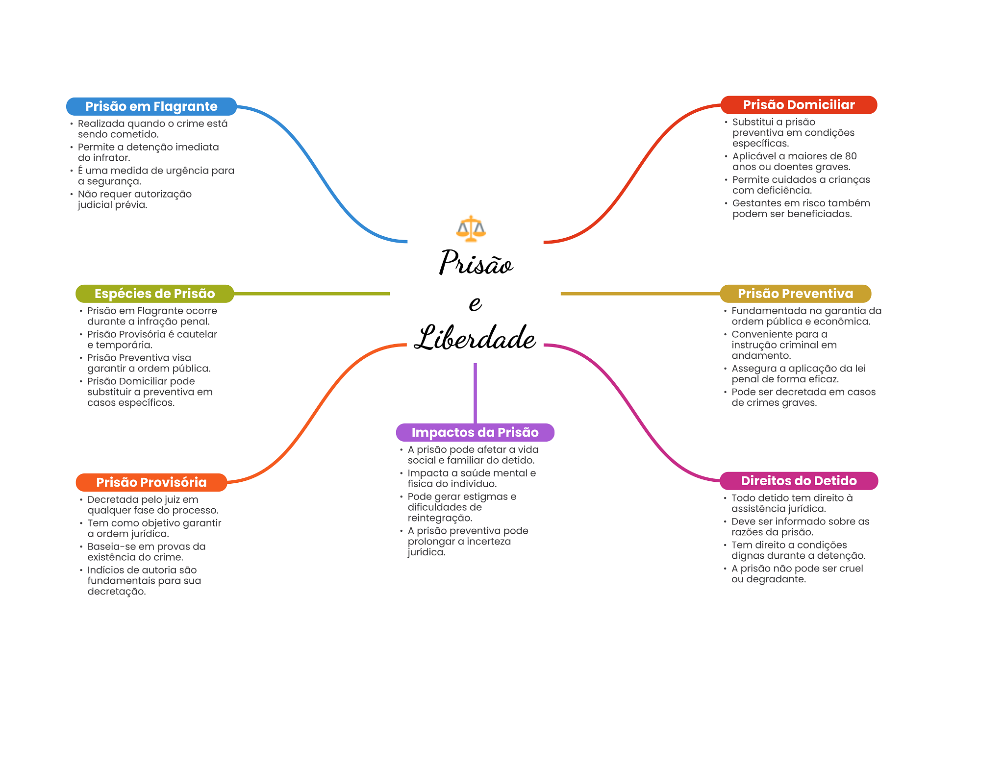 Prisão em Flagrante Prisão Domiciliar Realizada quando crime está Substitui a prisão sendo cometido. preventiva em condições Permite a detenção imediata específicas. do infrator. Aplicável a maiores de 80 É uma medida de urgência para anos ou doentes graves. a segurança. Permite cuidados a crianças Não requer autorização com deficiência. judicial prévia. Gestantes em risco também podem ser beneficiadas. Prisão Espécies de Prisão Prisão Preventiva e Prisão em Flagrante ocorre Fundamentada na garantia da durante a infração penal. ordem pública e econômica. Prisão Provisória é cautelar Liberdade Conveniente para a e temporária. instrução criminal em Prisão Preventiva visa andamento. garantir a ordem pública. Assegura a aplicação da lei Prisão Domiciliar pode penal de forma eficaz. substituir a preventiva em Pode ser decretada em casos casos específicos. de crimes graves. Impactos da Prisão A prisão pode afetar a vida social e familiar do detido. Impacta a saúde mental e Prisão Provisória física do indivíduo. Direitos do Detido Decretada pelo juiz em Pode gerar estigmas e Todo detido tem direito à qualquer fase do processo. dificuldades de assistência jurídica. Tem como objetivo garantir reintegração. Deve ser informado sobre as a ordem jurídica. A prisão preventiva pode razões da prisão. Baseia-se em provas da prolongar a incerteza Tem direito a condições existência do crime. jurídica. dignas durante a detenção. Indícios de autoria são A prisão não pode ser cruel fundamentais para sua ou degradante. decretação.