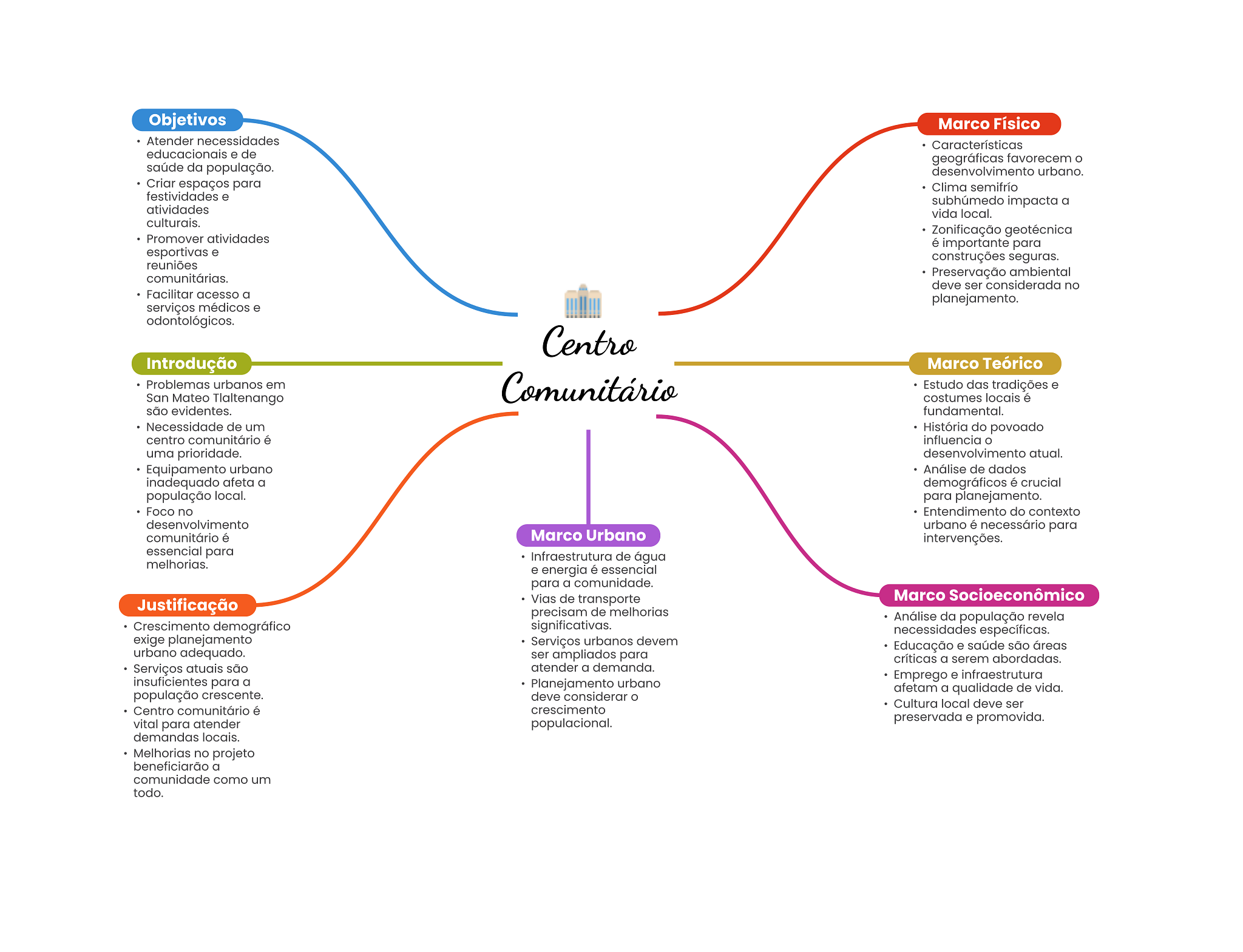 Objetivos Marco Físico Atender necessidades Características educacionais e de geográficas favorecem saúde da população. desenvolvimento urbano. Criar espaços para Clima semifrío festividades e subhúmedo impacta a atividades vida local. culturais. Zonificação geotécnica Promover atividades é importante para esportivas e construções seguras. reuniões comunitárias. Preservação ambiental deve ser considerada no Facilitar acesso a planejamento. serviços médicos e odontológicos. Centro Introdução Marco Teórico Problemas urbanos em Comunitário Estudo das tradições e San Mateo Tlaltenango costumes locais é são evidentes. fundamental. Necessidade de um História do povoado centro comunitário é influencia O uma prioridade. desenvolvimento atual. Equipamento urbano Análise de dados inadequado afeta a demográficos é crucial população local. para planejamento. Foco no Entendimento do contexto desenvolvimento urbano é necessário para comunitário é Marco Urbano intervenções. essencial para Infraestrutura de água melhorias. e energia é essencial para a comunidade. Justificação Vias de transporte Marco Socioeconômico precisam de melhorias Análise da população revela Crescimento demográfico significativas. necessidades específicas. exige planejamento Serviços urbanos devem Educação e saúde são áreas urbano adequado. ser ampliados para críticas a serem abordadas. Serviços atuais são atender a demanda. insuficientes para a Emprego e infraestrutura Planejamento urbano afetam a qualidade de vida. população crescente. deve considerar Cultura local deve ser Centro comunitário é crescimento vital para atender populacional. preservada e promovida. demandas locais. Melhorias no projeto beneficiarão a comunidade como um todo.