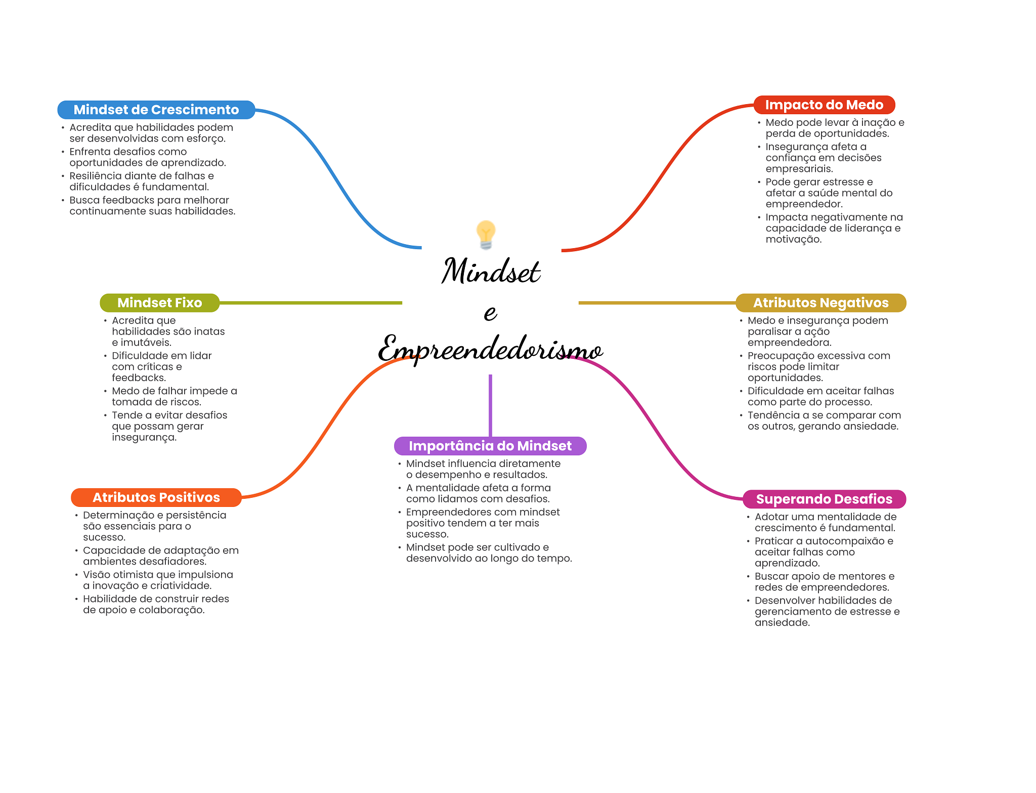 Mindset de Crescimento Impacto do Medo Acredita que habilidades podem Medo pode levar à inação e ser desenvolvidas com esforço. perda de oportunidades. Enfrenta desafios como Insegurança afeta a oportunidades de aprendizado. confiança em decisões empresariais. Resiliência diante de falhas e dificuldades é fundamental. Pode gerar estresse e afetar a saúde mental do Busca feedbacks para melhorar empreendedor. continuamente suas habilidades. Impacta negativamente na capacidade de liderança e motivação. Mindset Mindset Fixo Atributos Negativos e Acredita que Medo e insegurança podem habilidades são inatas paralisar a ação e imutáveis. Dificuldade em lidar Empreendedorismo empreendedora. Preocupação excessiva com com críticas e riscos pode limitar feedbacks. oportunidades. Medo de falhar impede a Dificuldade em aceitar falhas tomada de riscos. como parte do processo. Tende a evitar desafios Tendência a se comparar com que possam gerar OS outros, gerando ansiedade. insegurança. Importância do Mindset Mindset influencia diretamente O desempenho e resultados. A mentalidade afeta a forma Atributos Positivos como lidamos com desafios. Superando Desafios Determinação e persistência Empreendedores com mindset Adotar uma mentalidade de são essenciais para positivo tendem a ter mais crescimento é fundamental. sucesso. sucesso. Praticar a autocompaixão e Capacidade de adaptação em Mindset pode ser cultivado e aceitar falhas como ambientes desafiadores. desenvolvido ao longo do tempo. aprendizado. Visão otimista que impulsiona Buscar apoio de mentores e a inovação e criatividade. redes de empreendedores. Habilidade de construir redes Desenvolver habilidades de de apoio e colaboração. gerenciamento de estresse e ansiedade.