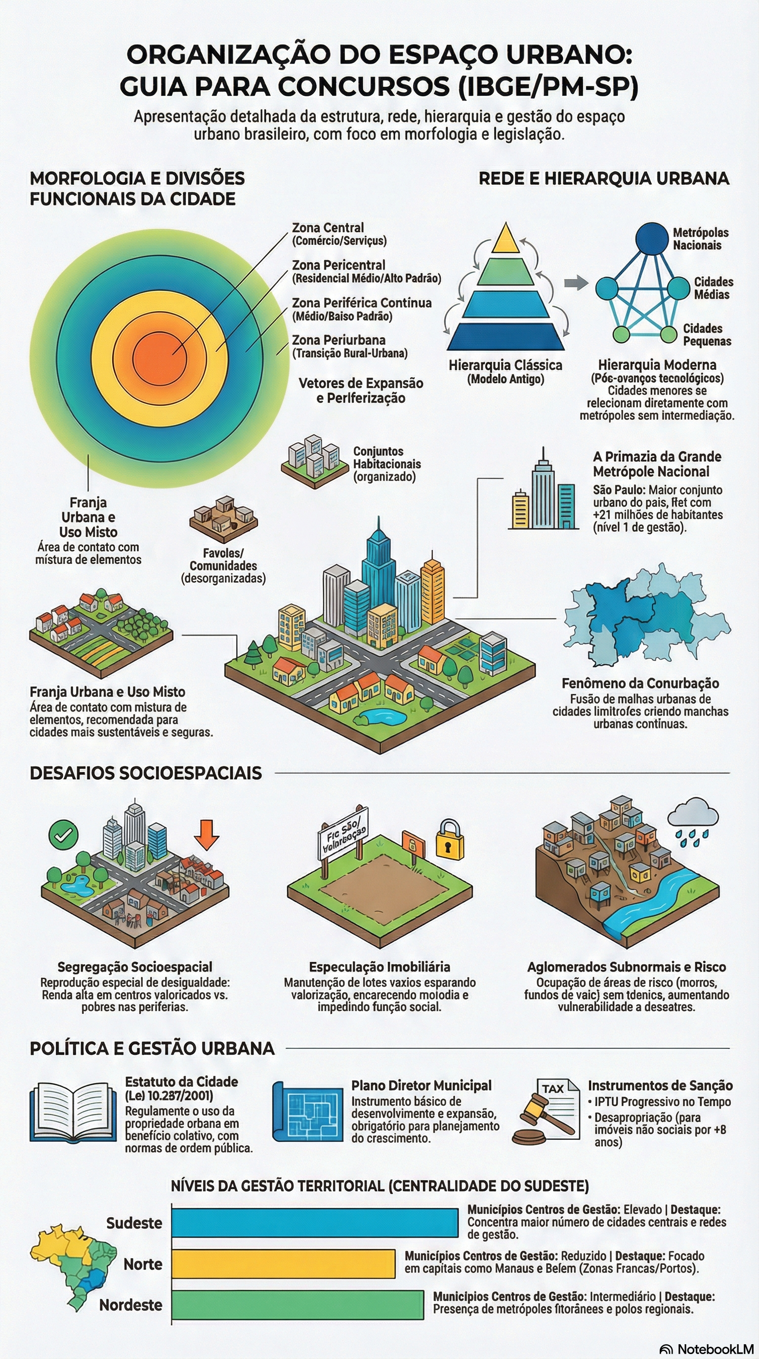 ORGANIZAÇÃO DO ESPAÇO URBANO: GUIA PARA CONCURSOS (IBGE/PM-SP) Apresentação detalhada da estrutura, rede, hierarquia e gestão do espaço urbano brasileiro, com foco em morfologia e legislação. MORFOLOGIA E DIVISÕES REDE E HIERARQUIA URBANA FUNCIONAIS DA CIDADE Zona Central Metrópolas (Comércio/Serviçus) Nacionais Zona Pericentral (Residencial Médio/Alto Padrão) Cidades Médias Zona Periférica Continua (Médio/Baiso Padrão) Cidades Zona Periurbana Pequenas (Transição Rural-Urbana) Hierarquia Clássica Hierarquia Moderna Vetores de Expansão (Modelo Antigo) tecnológicos) Cidades menores se e Perlferização relecionam diretamente com metrópoles sem intermediação. Conjuntos A Primazia da Grande Habitacionais (organizado) Metrópole Nacional São Paulo: Maior conjunto Franja urbano do pais, com Urbana e +21 milhões de habitantes Uso Misto (nível 1 de gestão). Área de contato com místura de elementos Favoles/ Comunidades (desorganizadas) Fenômeno da Conurbação Franja Urbana e Uso Misto Fusão de malhas urbanas de Área de contato com mistura de cidades limitrofes criendo manchas elementos, recomendada para urbanas continuas. cidades mais sustentáveis e seguras. DESAFIOS SOCIOESPACIAIS Segregação Socioespacial Especulação Imobiliária Aglomerados Subnormais e Risco Reprodução especial de desigualdade: Manutenção de lotes vaxios esparando Ocupação de áreas de risco (morros, Renda alta em centros valoricados valorização, encarecendo e fundos de vaic) sem tdenics, aumentando pobres nas periferias. impedindo função social. vulnerabilidade a deseatres. POLÍTICA E GESTÃO URBANA Estatuto da Cidade Plano Diretor Municipal TAX Instrumentos de Sanção (Le) 10.237/2001) Instrumento básico de IPTU Progressivo no Tempo Regulamente uso da desenvolvimente e expansão, propriedade orbana em Desapropriação (para obrigatório para planejamento benefício colativo, com imóveis não sociais por +8 do normas de ordem pública. anos) NÍVEIS DA GESTÃO TERRITORIAL (CENTRALIDADE DO SUDESTE) Municípios Centros de Gestão: Elevado I Destaque: Sudeste Concentra maior número de cidades centrais e redes de gestão. Norte Municípios Centros de Gestão: Reduzido I Destaque: Focado em capitais como Manaus e (Zonas Francas/Portos). Nordeste Municipios Centros de Gestão: Intermediário I Destaque: Presença de metrópoles fitorânees e polos regionais. NotebookLM