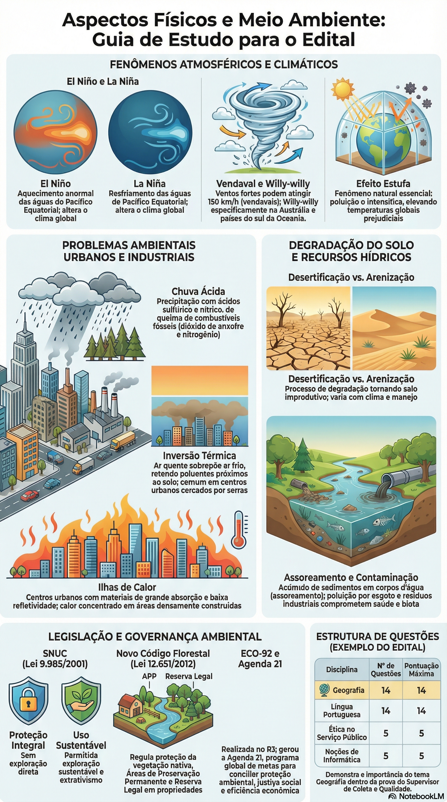 Aspectos Físicos e Meio Ambiente: Guia de Estudo para Edital FENÔMENOS ATMOSFÉRICOS E CLIMÁTICOS El Niño e La Niña El Niño La Niña Vendaval e Willy-willy Efeito Estufa Aquecimento anormal Resfriamento das águas Ventos fortes podem atingir Fenômeno natural essencial: das águas do Pacífico de Pacífico Equatorial; 150 km/h (vendavais); Willy-willy poluição intensitica, elevando Equatorial; altera altera clima global especificamente na Austrália e temperaturas globais clima global países do sul da Oceania. prejudiciais PROBLEMAS AMBIENTAIS DEGRADAÇÃO DO SOLO URBANOS E INDUSTRIAIS E RECURSOS HÍDRICOS Desertificação vs. Arenização Chuva Ácida Precipitação com ácidos e nítrico. de queima de combustíveis fósseis (dióxido de anxofre e nitrogênio) Desertificação vs. Arenização Processo de degradação tornando salo improdutivo; varia com clima e manejo Inversão Térmica Ar quente sobrepõe ar frio, retendo poluentes próximos ao solo; cemum em centros urbanos cercados por serras Assoreamento e Contaminação Ilhas de Calor Acúmido de sedimentos em corpos d'água Centros urbanos com materiais de grande absorção e baixa (assoreamento); poluição por esgoto e residuos refletividade; calor concentrado em áreas densamente construidas industriais comprometem saúde e biota LEGISLAÇÃO E GOVERNANÇA AMBIENTAL ESTRUTURA DE QUESTÕES (EXEMPLO DO EDITAL) SNUC Novo Código Florestal ECO-92 e (Lei 9.985/2001) (Lei 12.651/2012) Agenda 21 N° de Disciplina Pontuação APP Reserva Legal Questões Máxima Geografia 14 14 Língua 14 14 Portuguesa Ética no Proteção Uso 5 5 Serviço Público Integral Sustentável Realizada no R3; gerou Sem Parmitida Noções de Regula proteção da a Agenda 21, programa Informática 5 5 exploração exploração vegetação nativa, global de metas para direta sustentável e Áreas de Preservação conciller proteção Demonstra e importância do tema extrativismo Permanente e Reserva ambiental, justiya social Geográfia dentro da prova do Supervisor Legal em propriedades e eficiência econômica de Coleta e Qualidade. NotebookLM