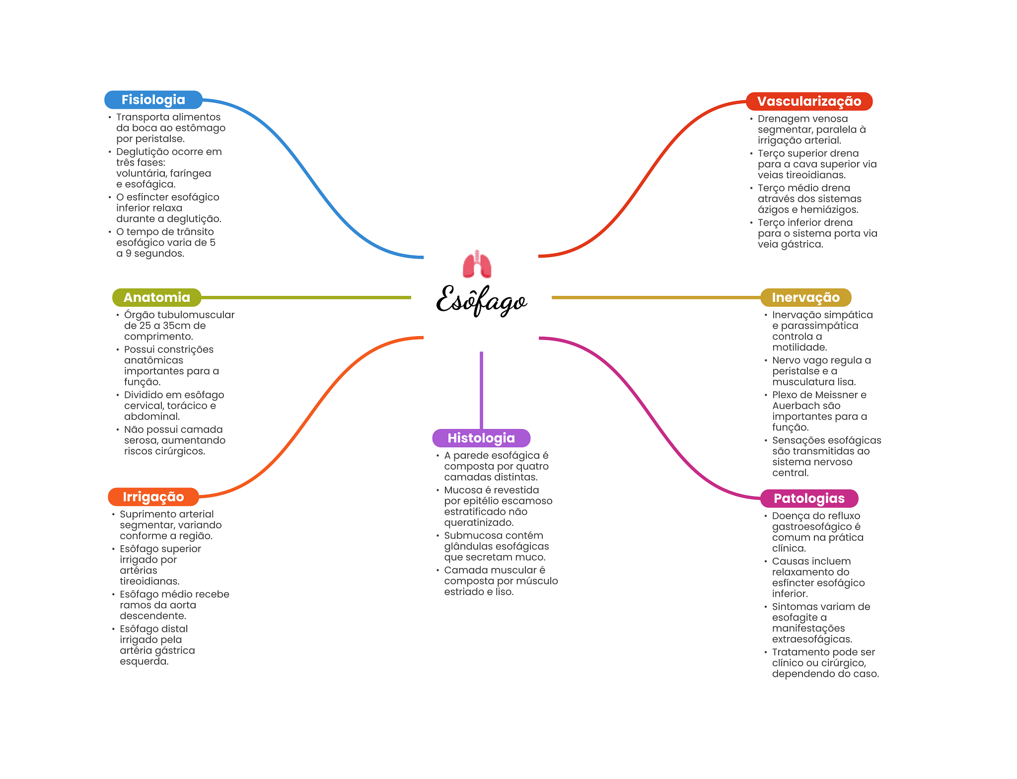 Fisiologia Vascularização Transporta alimentos Drenagem venosa da boca ao estômago segmentar, paralela à por peristalse. irrigação arterial. Deglutição ocorre em Terço superior drena três fases: para a cava superior via voluntária, faríngea veias tireoidianas. e esofágica. Terço médio drena esfíncter esofágico através dos sistemas inferior relaxa ázigos e hemiázigos. durante a deglutição. Terço inferior drena tempo de trânsito para sistema porta via esofágico varia de 5 veia gástrica. a 9 segundos. Anatomia Esôfago Inervação Órgão tubulomuscular Inervação simpática de 25 a 35cm de e parassimpática comprimento. controla a Possui constrições motilidade. anatômicas Nervo vago regula a importantes para a peristalse e a função. musculatura lisa. Dividido em esôfago Plexo de Meissner e cervical, torácico e Auerbach são abdominal. importantes para a Não possui camada função. serosa, aumentando Histologia Sensações esofágicas riscos cirúrgicos. A parede esofágica é são transmitidas ao sistema nervoso composta por quatro camadas distintas. central. Mucosa é revestida Irrigação por epitélio escamoso Patologias Suprimento arterial estratificado não Doença do refluxo segmentar, variando queratinizado. gastroesofágico é conforme a região. Submucosa contém comum na prática Esôfago superior glândulas esofágicas clínica. irrigado por que secretam muco. Causas incluem artérias Camada muscular é relaxamento do tireoidianas. composta por músculo esofágico Esôfago médio recebe estriado e liso. inferior. ramos da aorta Sintomas variam de descendente. esofagite a Esôfago distal manifestações irrigado pela extraesofágicas. artéria gástrica Tratamento pode ser esquerda. clínico ou cirúrgico, dependendo do caso.