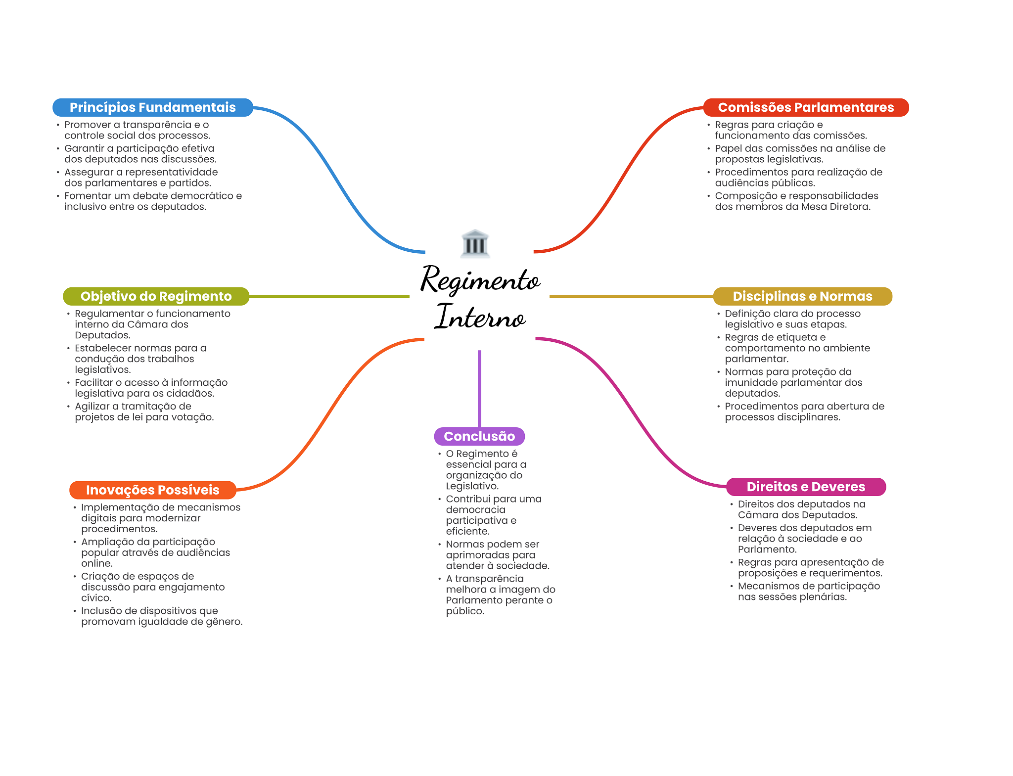 Princípios Fundamentais Comissões Parlamentares Promover a transparência e Regras para criação e controle social dos processos. funcionamento das comissões. Garantir a participação efetiva Papel das comissões na análise de dos deputados nas discussões. propostas legislativas. Assegurar a representatividade Procedimentos para realização de dos parlamentares e partidos. audiências públicas. Fomentar um debate democrático e Composição e responsabilidades inclusivo entre OS deputados. dos membros da Mesa Diretora. Regimento Objetivo do Regimento Disciplinas e Normas Regulamentar O funcionamento Interno Definição clara do processo interno da Câmara dos legislativo e suas etapas. Deputados. Regras de etiqueta e Estabelecer normas para a comportamento no ambiente condução dos trabalhos parlamentar. legislativos. Normas para proteção da Facilitar acesso à informação imunidade parlamentar dos legislativa para cidadãos. deputados. Agilizar a tramitação de Procedimentos para abertura de projetos de lei para votação. processos disciplinares. Conclusão Regimento é essencial para a organização do Inovações Possíveis Legislativo. Direitos e Deveres Contribui para uma Implementação de mecanismos democracia Direitos dos deputados na digitais para modernizar participativa e Câmara dos Deputados. procedimentos. eficiente. Deveres dos deputados em Ampliação da participação relação à sociedade e ao Normas podem ser popular através de audiências Parlamento. aprimoradas para online. atender à sociedade. Regras para apresentação de Criação de espaços de A transparência proposições e requerimentos. discussão para engajamento melhora a imagem do Mecanismos de participação cívico. Parlamento perante nas sessões plenárias. Inclusão de dispositivos que público. promovam igualdade de gênero.