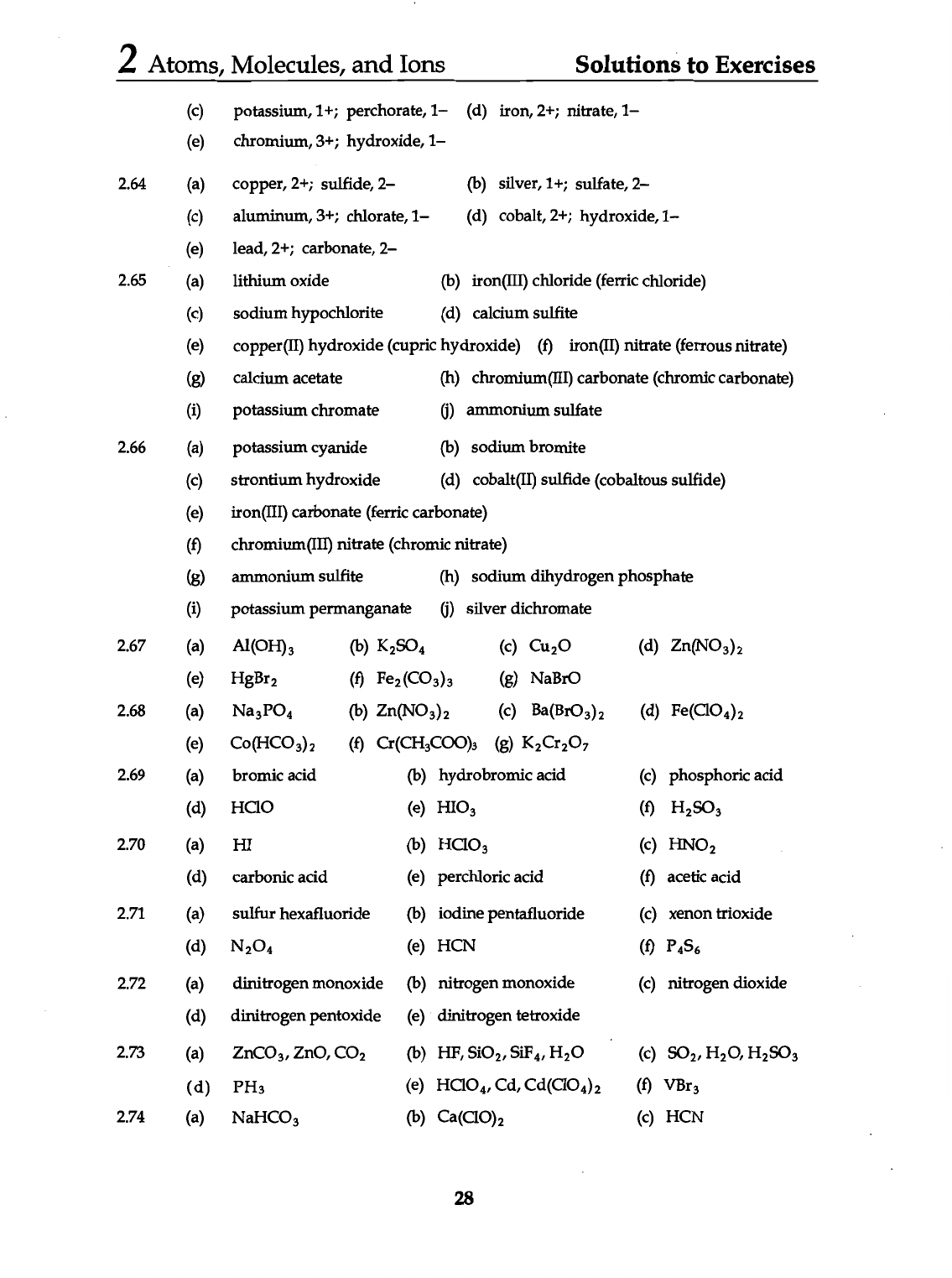 2 Atoms, Molecules, and Ions Solutions to Exercises (c) potassium, 1+; perchorate, 1- (d) iron, 2+; nitrate, 1- (e) chromium, 3+; hydroxide, 1- 2.64 (a) copper, 2+; sulfide, 2- (b) silver, 1+; sulfate, 2- (c) aluminum, 3+; chlorate, 1- (d) cobalt, 2+; hydroxide, 1- (e) lead, 2+; carbonate, 2- 2.65 (a) lithium oxide (b) iron(III) chloride (ferric chloride) (c) sodium hypochlorite (d) calcium sulfite (e) copper(II) hydroxide (cupric hydroxide) (f) iron(II) nitrate (ferrous nitrate) (g) calcium acetate (h) chromium(III) carbonate (chromic carbonate) (i) potassium chromate (j) ammonium sulfate 2.66 (a) potassium cyanide (b) sodium bromite (c) strontium hydroxide (d) cobalt(II) sulfide (cobaltous sulfide) (e) iron(III) carbonate (ferric carbonate) (f) chromium(III) nitrate (chromic nitrate) (g) ammonium sulfite (h) sodium dihydrogen phosphate (i) potassium permanganate (j) silver dichromate 2.67 (a) (b) (c) (d) Zn(NO₃)₂ (e) HgBr₂ (f) Fe₂(CO₃)₃ (g) NaBrO 2.68 (a) (b) Zn(NO₃)₂ (c) Ba(BrO₃)₂ (d) Fe(ClO₄)₂ (e) Co(HCO₃)₂ (f) Cr(CH₃COO)₃ (g) 2.69 (a) bromic acid (b) hydrobromic acid (c) phosphoric acid (d) HCIO (e) HIO₃ (f) 2.70 (a) HI (b) HCIO₃ (c) HNO₂ (d) carbonic acid (e) perchloric acid (f) acetic acid 2.71 (a) sulfur hexafluoride (b) iodine pentafluoride (c) xenon trioxide (d) (e) HCN (f) 2.72 (a) dinitrogen monoxide (b) nitrogen monoxide (c) nitrogen dioxide (d) dinitrogen pentoxide (e) dinitrogen tetroxide 2.73 (a) ZnCO₃, ZnO, (b) HF, SiO₂, SiF₄, (c) (d) PH₃ (e) Cd, Cd(ClO₄)₂ (f) VBr₃ 2.74 (a) (b) Ca(CIO)₂ (c) HCN 28