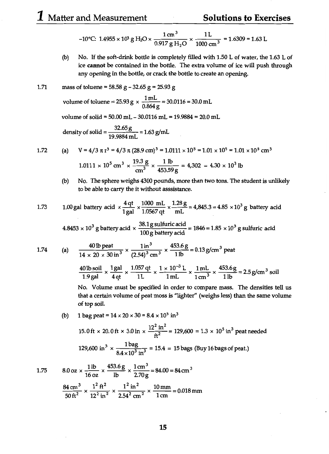 1 Matter and Measurement Solutions to Exercises -10°C: 1.4955 10³ g 0.917 g X 1000 1L 3 = 1.6309 = 1.63 L 1 cm³ (b) No. If the soft-drink bottle is completely filled with 1.50 L of water, the 1.63 L of ice cannot be contained in the bottle. The extra volume of ice will push through any opening in the bottle, or crack the bottle to create an opening. 1.71 mass of toluene = 58.58 g 32.65 g = 25.93 g volume of toluene = 25.93 g 0.864g 1 mL = 30.0116 = 30.0 mL volume of solid = 50.00 mL- 30.0116 mL = 19.9884 = 20.0 mL density of solid = 19.9884 32.65g = 1.72 (a) V = 4/3 π = 4/3 π (28.9 cm)³ = 1.0111 10⁵ = 1.01 10⁵ = 1.01 10⁵ cm³ 1.0111 X 10⁵ cm³ 19.3 cm³ g X 453.59 1 lb = 4,302 = 4.30 10³ lb (b) No. The sphere weighs 4300 pounds, more than two tons. The student is unlikely to be able to carry the it without asssistance. 1.73 1.00 gal battery acid X 1 4 gal qt X 1000 1.0567 mL qt 1.28 mL = 4,845.3 = 4.85 X 10³ g battery acid 4.8453 10³ g battery acid X g = 1846 = 1.85 10³ g sulfuric acid 38.1 sulfuric acid 100 g battery acid 1.74 (a) 14 40 20 lb peat 30 X (2.54)³ 1in³ cm³ X 453.6g = 0.13 g/cm³ peat 40 1.9 lb gal soil 1 4 gal qt 1.057 1L qt X 1 1 mL 10⁻³ L X 1cm 1 mL 3 453.6 = soil No. Volume must be specified in order to compare mass. The densities tell us that a certain volume of peat moss is "lighter" (weighs less) than the same volume of top soil. (b) 1 bag peat = 14 20 30 = 8.4 10³ in³ 15.0ft 3.0 in in² = 129,600 = 1.3 10⁵ in³ peat needed 129,600 in³ 1 bag in³ = 15.4 = 15 bags (Buy 16 bags of peat.) 1.75 8.0 OZ 1lb 453.6 lb 2.70g = 84.00 = 84 3 84 cm³ X 1 cm = 0.018 mm 15