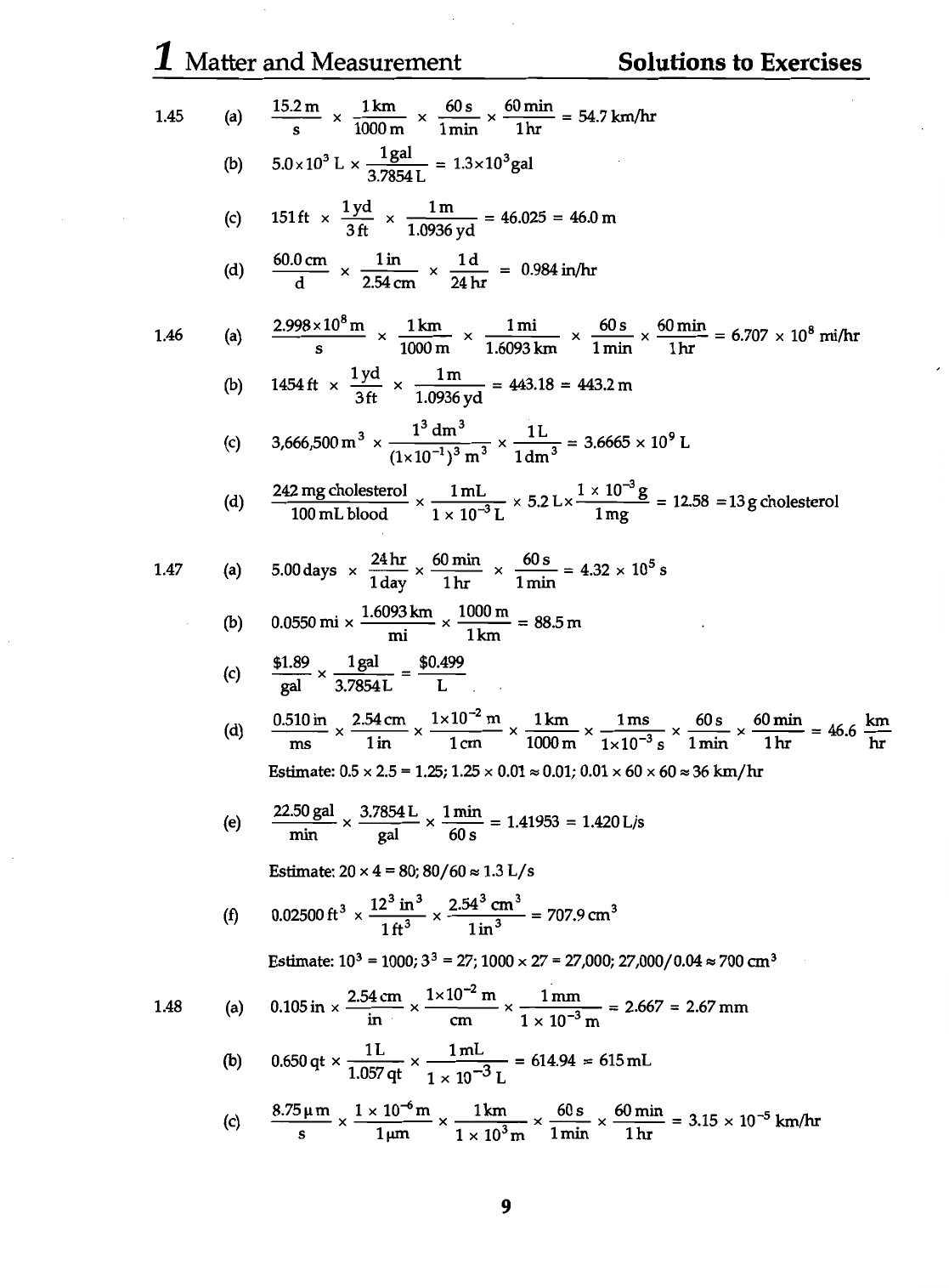 1 Matter and Measurement Solutions to Exercises 1.45 (a) 15.2 S m X 1000 1km m X 60 1hr min = 54.7 km/hr (b) 5.0 10³ L 1gal = 1.3x10³gal (c) 151 ft X 1 3ft yd X 1.0936 1m yd = 46.025 = 46.0 m (d) 60.0 d cm 1in 24 1d hr = 0.984 in/hr 2.54 cm 1.46 (a) 2.998 S 10⁸ m X 1000 1 km m X 1.6093 1 mi km X 1 min 60 S X 60 1hr min = 6.707 X 10⁸ mi/hr (b) 1454 ft 1yd 3ft X 1.0936 1m yd = 443.18 = 443.2 m (c) 3,666,500 3 X (1x10⁻¹)³ 1³ dm³ m³ X 1L = 3.6665 X L (d) 242 mg cholesterol X 1 1 10⁻³ mL L X 5.2 Lx 1 10⁻³ = 12.58 = 13 cholesterol 100 mL blood 1 mg 1.47 (a) 5.00 days X 1 24 day hr X 60 1hr min 60 = 4.32 10⁵ S (b) 0.0550 mi 1.6093 mi km 1000 m = 88.5 m 1km (c) $1.89 gal 3.7854 L = $0.499 L (d) 0.510 ms in 2.54 1in cm 1x 1cm 10⁻² m X 1000 1 km m 1x 1ms 10⁻³ min 60 S 60 1hr min = 46.6 km hr Estimate: 0.5 2.5 = 1.25; 1.25 0.01 ≈ 0.01; 0.01 X 60 X 60 ≈ 36 km/hr (e) 22.50 min gal gal 1 60 min = 1.41953 = 1.420 L/s Estimate: 20 X 4 = 80; 80/60 ≈ 1.3 L/s (f) 0.02500 X 12³ X 2.54³ cm³ = Estimate: 10³ = 1000; = 27; 1000 27 = 27,000; 27,000/0.04 ≈ 700 cm³ 1.48 (a) 0.105 in 2.54 in cm 10⁻² cm m X 1 1 10⁻³ mm m = 2.667 = 2.67 mm (b) 0.650 qt X 1.057 1L X 1 1mL -3 L = 614.94 = 615 mL (c) 8.75 S 1 1 10⁻⁶ µm m X 1 1 km 10³ m X 60 1hr min = 3.15 10⁻⁵ km/hr 9