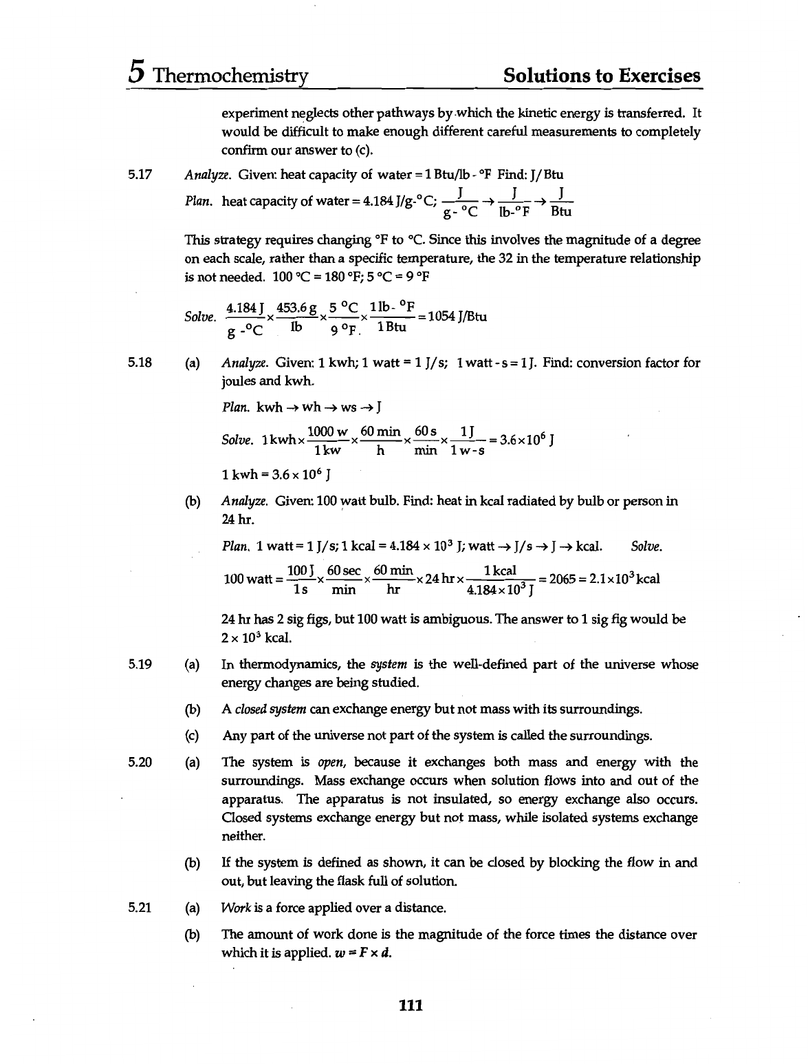 5 Thermochemistry Solutions to Exercises experiment neglects other pathways by which the kinetic energy is transferred. It would be difficult to make enough different careful measurements to completely confirm our answer to (c). 5.17 Analyze. Given: heat capacity of water = 1 Btu/lb - °F Find: Btu Plan. heat capacity of water = 4.184 C; g J °C J Btu J This strategy requires changing °F to °C. Since this involves the magnitude of a degree on each scale, rather than a specific temperature, the 32 in the temperature relationship is not needed. 100 °C = 180 °F; Solve. g °C 453.6 lb 5 1 Btu = 1054 J/Btu 5.18 (a) Analyze. Given: 1 kwh; 1 watt = 1 S = 1J. Find: conversion factor for joules and kwh. Plan. kwh wh WS J Solve. 1 kwhx 1000 1 kw W 60 min h min 60 1 1J = 3.6 10⁶ J 1 kwh = 3.6 10⁶ J (b) Analyze. Given: 100 watt bulb. Find: heat in kcal radiated by bulb or person in 24 hr. Plan. 1 watt = 1 kcal = 4.184 10³ J; watt J/s J kcal. Solve. 100 watt = 100 60 min sec 60 hr min 24 hr 1 kcal = 2065 = 10³ kcal 24 hr has 2 sig figs, but 100 watt is ambiguous. The answer to 1 sig fig would be 2 10³ kcal. 5.19 (a) In thermodynamics, the system is the well-defined part of the universe whose energy changes are being studied. (b) A closed system can exchange energy but not mass with its surroundings. (c) Any part of the universe not part of the system is called the surroundings. 5.20 (a) The system is open, because it exchanges both mass and energy with the surroundings. Mass exchange occurs when solution flows into and out of the apparatus. The apparatus is not insulated, so energy exchange also occurs. Closed systems exchange energy but not mass, while isolated systems exchange neither. (b) If the system is defined as shown, it can be closed by blocking the flow in and out, but leaving the flask full of solution. 5.21 (a) Work is a force applied over a distance. (b) The amount of work done is the magnitude of the force times the distance over which it is applied. w = Fxd. 111