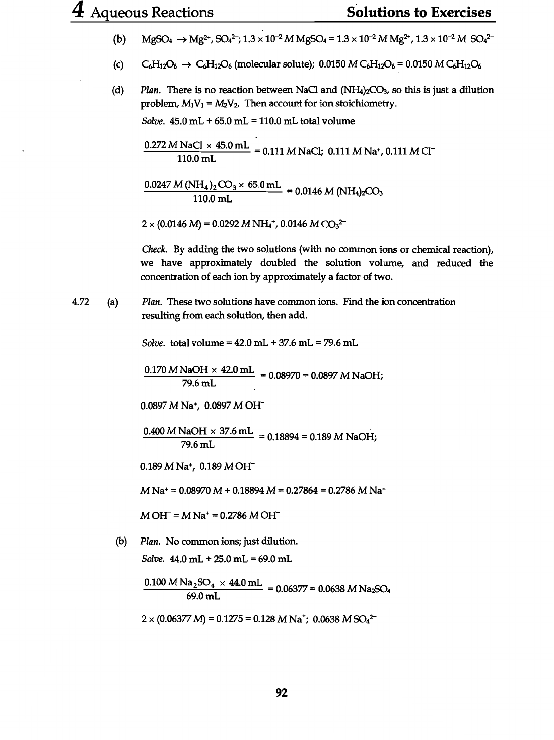 4 Aqueous Reactions Solutions to Exercises (b) MgSO4 1.3 10⁻² M MgSO4 = 1.3 10⁻² M 1.3 10⁻² M (c) C₆H₁₂O₆ (molecular solute); 0.0150 M C₆H₁₂O₆ = 0.0150 M C₆H₁₂O₆ (d) Plan. There is no reaction between NaCl and (NH₄)₂CO₃, so this is just a dilution problem, = Then account for ion stoichiometry. Solve. 45.0 mL + 65.0 mL = 110.0 mL total volume 0.272 M NaCl 45.0 mL = 0.111 M NaCl; 0.111 M Na+, 0.111 M 110.0 mL 0.0247 M (NH₄)₂ CO₃ X 65.0 mL = 0.0146 M (NH₄)₂CO₃ 110.0 mL 2x (0.0146 M) = 0.0292 M 0.0146 M Check. By adding the two solutions (with no common ions or chemical reaction), we have approximately doubled the solution volume, and reduced the concentration of each ion by approximately a factor of two. 4.72 (a) Plan. These two solutions have common ions. Find the ion concentration resulting from each solution, then add. Solve. total volume = 42.0 mL + 37.6 mL = 79.6 mL 0.170 M NaOH X 42.0 mL = 0.08970 = 0.0897 M NaOH; 79.6 mL 0.0897 M Na+, 0.0897 M OH⁻ 0.400 M NaOH 37.6 mL = 0.18894 = 0.189 M NaOH; 79.6 mL 0.189 M Na+, 0.189 M M Na+ = 0.08970 M + 0.18894 M = 0.27864 = 0.2786 M Na+ M = M Na+ = 0.2786 M (b) Plan. No common ions; just dilution. Solve. 44.0 mL + 25.0 mL = 69.0 mL 0.100 M Na₂SO₄ X 44.0 mL = 0.06377 = 0.0638 M 69.0 mL 2 (0.06377 M) = 0.1275 = 0.128 M 0.0638 M 92
