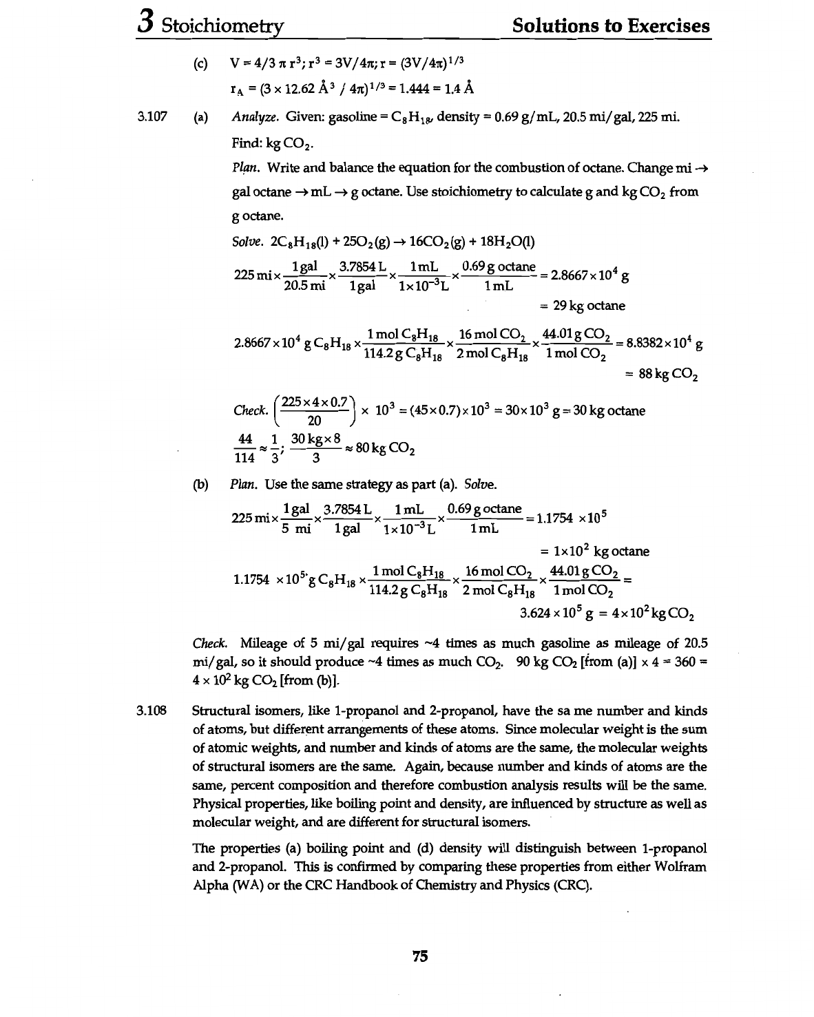 3 Stoichiometry Solutions to Exercises (c) 3.107 (a) Analyze. Given: gasoline = C₈H₁₈ density = 0.69 g/mL, 20.5 mi/gal, 225 mi. Find: kg Plan. Write and balance the equation for the combustion of octane. Change mi gal octane mL g octane. Use stoichiometry to calculate g and kg from g octane. Solve. 225 mi 20.5 mi 1 gal X 1 mL 0.69 1 mL octane = = 29 kg octane 2.8667 C₈H₁₈ 114.2 1 mol C₈H₁₈ C₈H₁₈ 2 16 mol mol C₈H₁₈ 44.01 1 mol = 8.8382 10⁴ g = Check. 20 10³ = (45 0.7) = = kg octane ≈ (b) Plan. Use the same strategy as part (a). Solve. 225 mi 5 mi 3.7854 1 gal L 1 mL 0.69 1mL octane = 1.1754 10⁵ = kg octane 1.1754 X C₈H₁₈ 114.2 1 mol g C₈H₁₈ C₈H₁₈ 2 16 mol mol C₈H₁₈ 1 mol CO₂ = Check. Mileage of 5 mi/gal requires ~4 times as much gasoline as mileage of 20.5 mi/gal, so it should produce ~4 times as much 90 kg [from (a)] 4 = 360 = 4 10² kg [from (b)]. 3.108 Structural isomers, like 1-propanol and 2-propanol, have the sa me number and kinds of atoms, but different arrangements of these atoms. Since molecular weight is the sum of atomic weights, and number and kinds of atoms are the same, the molecular weights of structural isomers are the same. Again, because number and kinds of atoms are the same, percent composition and therefore combustion analysis results will be the same. Physical properties, like boiling point and density, are influenced by structure as well as molecular weight, and are different for structural isomers. The properties (a) boiling point and (d) density will distinguish between 1-propanol and 2-propanol. This is confirmed by comparing these properties from either Wolfram Alpha (WA) or the CRC Handbook of Chemistry and Physics (CRC). 75