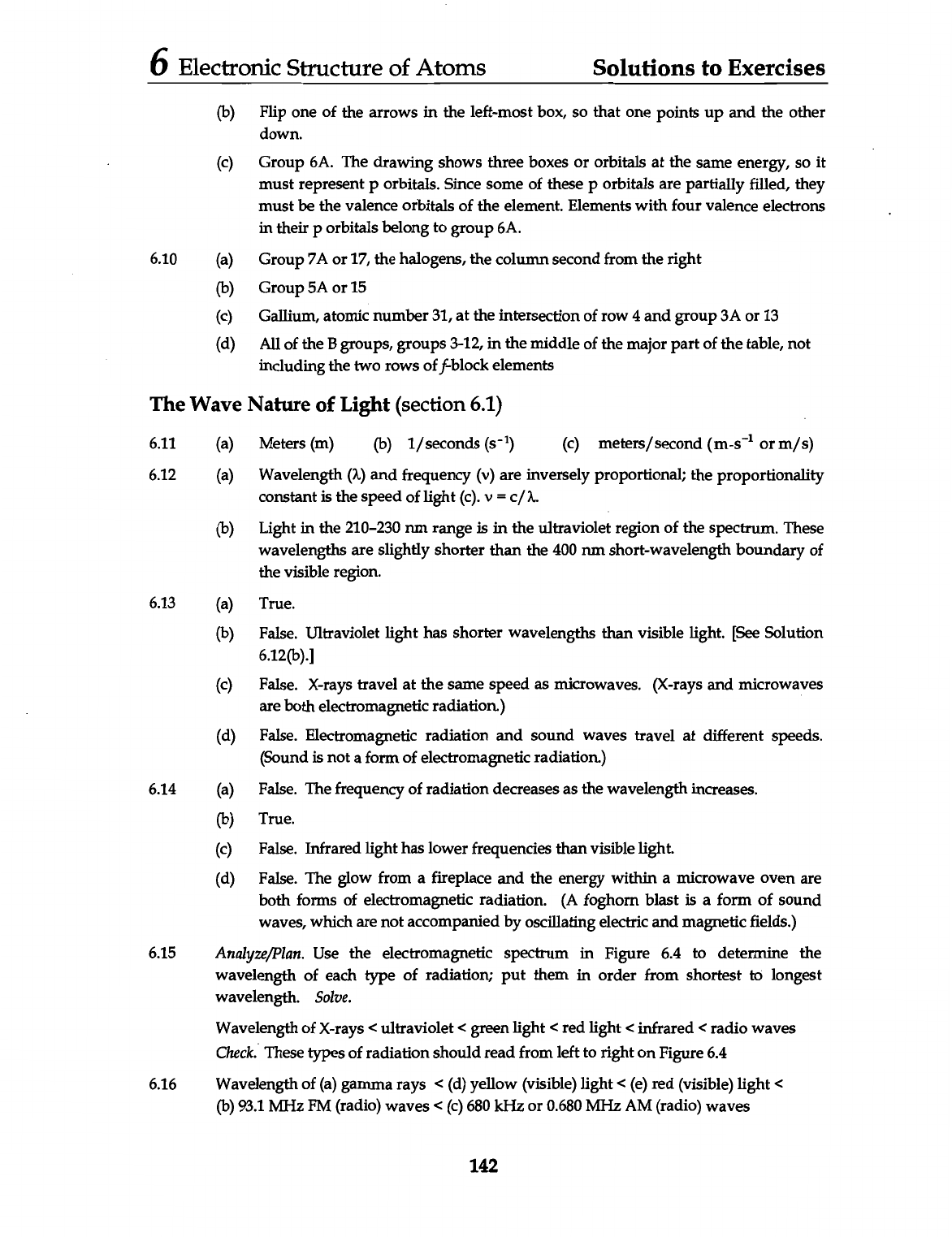 6 Electronic Structure of Atoms Solutions to Exercises (b) Flip one of the arrows in the left-most box, so that one points up and the other down. (c) Group 6A. The drawing shows three boxes or orbitals at the same energy, so it must represent p orbitals. Since some of these p orbitals are partially filled, they must be the valence orbitals of the element. Elements with four valence electrons in their p orbitals belong to group 6A. 6.10 (a) Group 7A or 17, the halogens, the column second from the right (b) Group 5A or 15 (c) Gallium, atomic number 31, at the intersection of row 4 and group 3A or 13 (d) All of the B groups, groups 3-12, in the middle of the major part of the table, not including the two rows of f-block elements The Wave Nature of Light (section 6.1) 6.11 (a) Meters (m) (b) 1/seconds (s⁻¹) (c) meters/second (m-s⁻¹ or m/s) 6.12 (a) Wavelength () and frequency (v) are inversely proportional; the proportionality constant is the speed of light (c). = (b) Light in the 210-230 nm range is in the ultraviolet region of the spectrum. These wavelengths are slightly shorter than the 400 nm short-wavelength boundary of the visible region. 6.13 (a) True. (b) False. Ultraviolet light has shorter wavelengths than visible light. [See Solution 6.12(b).] (c) False. X-rays travel at the same speed as microwaves. (X-rays and microwaves are both electromagnetic radiation.) (d) False. Electromagnetic radiation and sound waves travel at different speeds. (Sound is not a form of electromagnetic radiation.) 6.14 (a) False. The frequency of radiation decreases as the wavelength increases. (b) True. (c) False. Infrared light has lower frequencies than visible light. (d) False. The glow from a fireplace and the energy within a microwave oven are both forms of electromagnetic radiation. (A foghorn blast is a form of sound waves, which are not accompanied by oscillating electric and magnetic fields.) 6.15 Analyze/Plan. Use the electromagnetic spectrum in Figure 6.4 to determine the wavelength of each type of radiation; put them in order from shortest to longest wavelength. Solve. Wavelength of X-rays