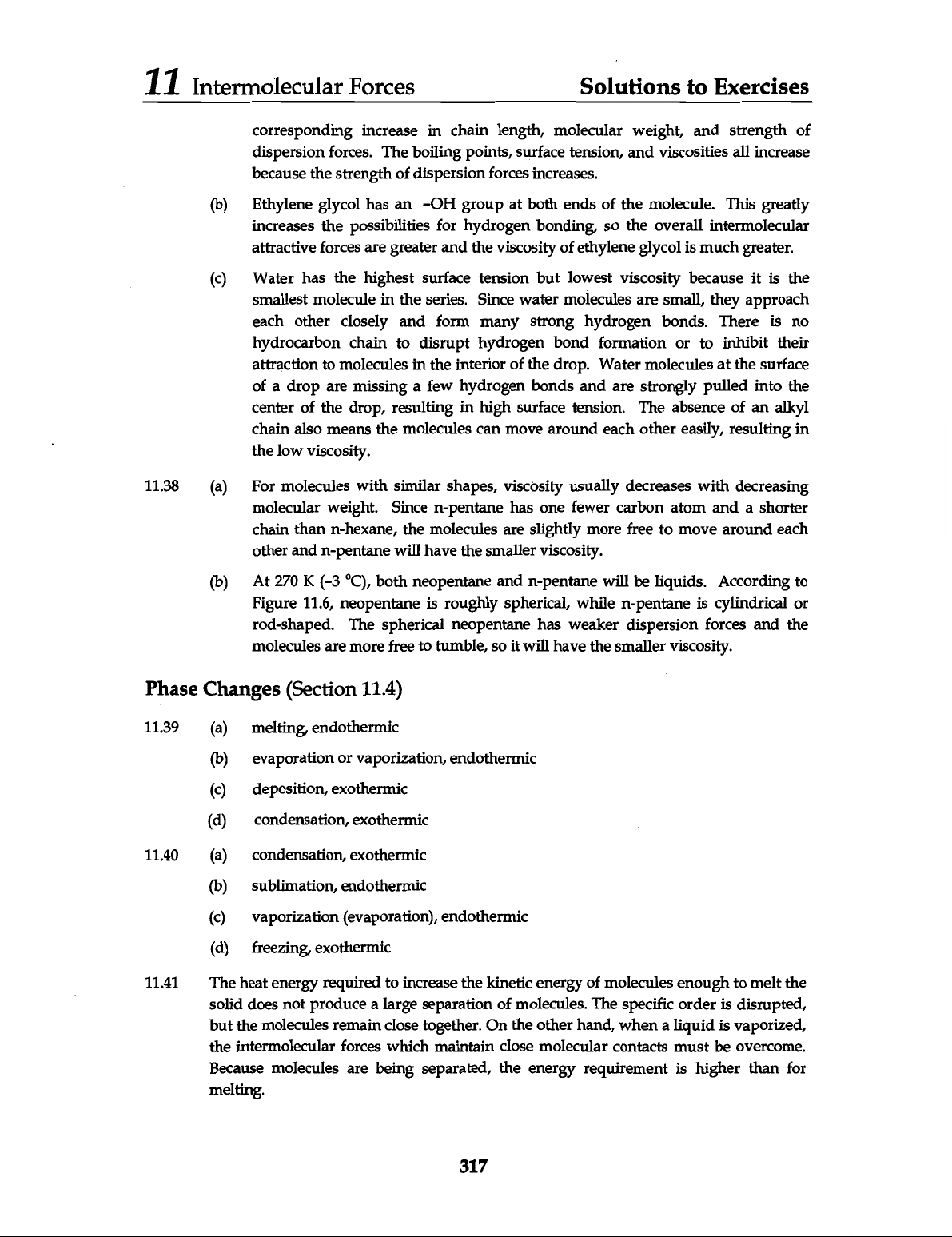 11 Intermolecular Forces Solutions to Exercises corresponding increase in chain length, molecular weight, and strength of dispersion forces. The boiling points, surface tension, and viscosities all increase because the strength of dispersion forces increases. (b) Ethylene glycol has an -OH group at both ends of the molecule. This greatly increases the possibilities for hydrogen bonding, so the overall intermolecular attractive forces are greater and the viscosity of ethylene glycol is much greater. (c) Water has the highest surface tension but lowest viscosity because it is the smallest molecule in the series. Since water molecules are small, they approach each other closely and form many strong hydrogen bonds. There is no hydrocarbon chain to disrupt hydrogen bond formation or to inhibit their attraction to molecules in the interior of the drop. Water molecules at the surface of a drop are missing a few hydrogen bonds and are strongly pulled into the center of the drop, resulting in high surface tension. The absence of an alkyl chain also means the molecules can move around each other easily, resulting in the low viscosity. 11.38 (a) For molecules with similar shapes, viscosity usually decreases with decreasing molecular weight. Since n-pentane has one fewer carbon atom and a shorter chain than n-hexane, the molecules are slightly more free to move around each other and n-pentane will have the smaller viscosity. (b) At 270 K (-3 °C), both neopentane and n-pentane will be liquids. According to Figure 11.6, neopentane is roughly spherical, while n-pentane is cylindrical or rod-shaped. The spherical neopentane has weaker dispersion forces and the molecules are more free to tumble, so it will have the smaller viscosity. Phase Changes (Section 11.4) 11.39 (a) melting, endothermic (b) evaporation or vaporization, endothermic (c) deposition, exothermic (d) condensation, exothermic 11.40 (a) condensation, exothermic (b) sublimation, endothermic (c) vaporization (evaporation), endothermic (d) freezing, exothermic 11.41 The heat energy required to increase the kinetic energy of molecules enough to melt the solid does not produce a large separation of molecules. The specific order is disrupted, but the molecules remain close together. On the other hand, when a liquid is vaporized, the intermolecular forces which maintain close molecular contacts must be overcome. Because molecules are being separated, the energy requirement is higher than for melting. 317