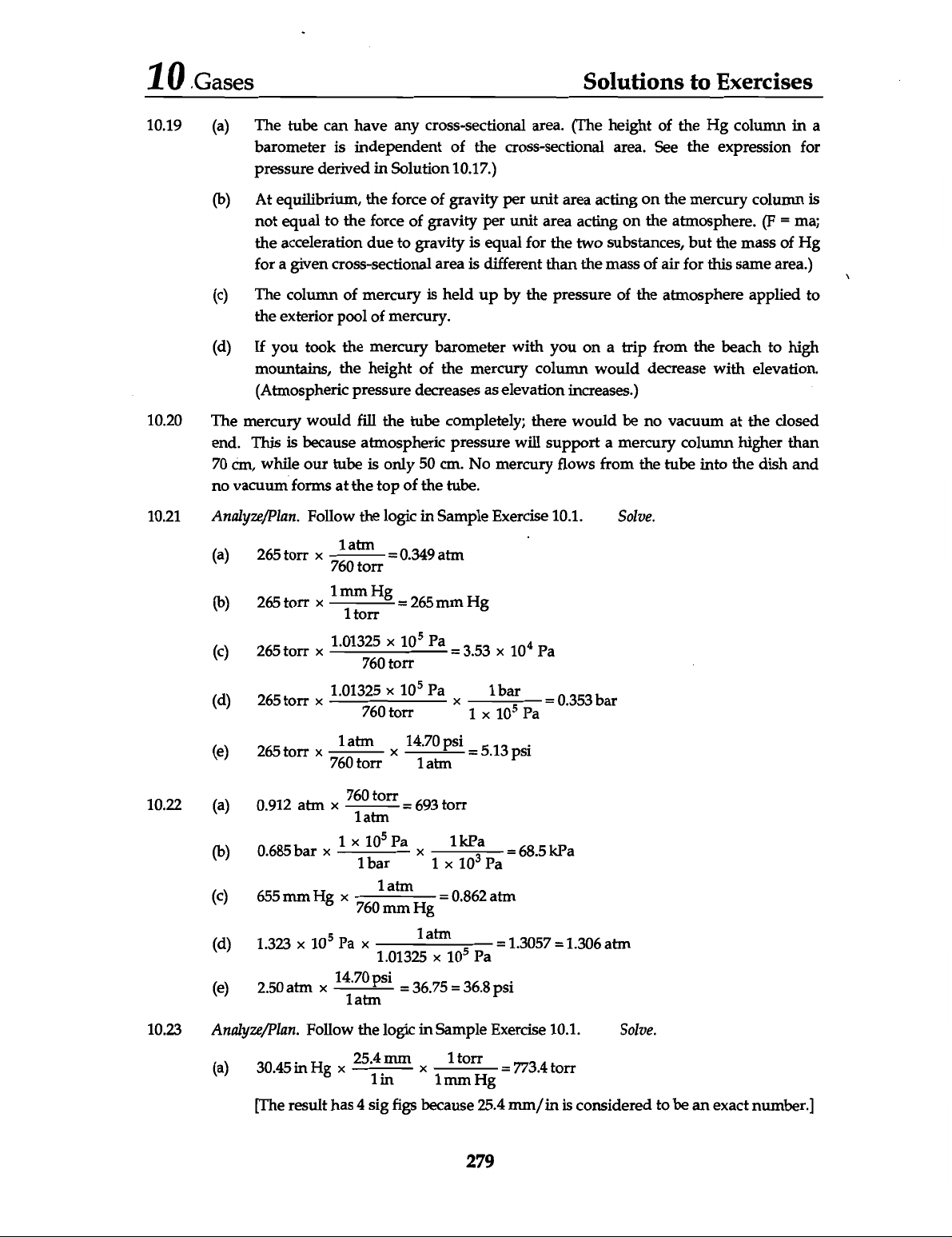 10 Gases Solutions to Exercises 10.19 (a) The tube can have any cross-sectional area. (The height of the Hg column in a barometer is independent of the cross-sectional area. See the expression for pressure derived in Solution 10.17.) (b) At equilibrium, the force of gravity per unit area acting on the mercury column is not equal to the force of gravity per unit area acting on the atmosphere. (F = ma; the acceleration due to gravity is equal for the two substances, but the mass of Hg for a given cross-sectional area is different than the mass of air for this same area.) (c) The column of mercury is held up by the pressure of the atmosphere applied to the exterior pool of mercury. (d) If you took the mercury barometer with you on a trip from the beach to high mountains, the height of the mercury column would decrease with elevation. (Atmospheric pressure decreases as elevation increases.) 10.20 The mercury would fill the tube completely; there would be no vacuum at the closed end. This is because atmospheric pressure will support a mercury column higher than 70 cm, while our tube is only 50 cm. No mercury flows from the tube into the dish and no vacuum forms at the top of the tube. 10.21 Analyze/Plan. Follow the logic in Sample Exercise 10.1. Solve. (a) 265 torr 760 torr = 0.349 atm (b) 265 torr X mm 1 torr = 265 mm Hg (c) 265 torr 1.01325 10⁵ Pa = 3.53 10⁴ Pa 760 torr (d) 265 torr 1.01325 760 torr 10⁵ Pa X 1 1 10⁵ bar Pa = 0.353 bar (e) 265 torr 760 torr 14.70 1 atm psi = 5.13 psi 10.22 (a) 0.912 atm X 760 1 torr = 693 torr atm (b) 0.685 bar 1 1 bar Pa 1 1kPa Pa = 68.5 kPa 1 atm (c) 655 mm = 0.862 atm 760 mm (d) 10⁵ 1.323 Pa = 1.3057 = 1.306 atm 1.01325 X 10⁵ Pa (e) 2.50 atm 14.70 1atm psi = = 36.8 psi 10.23 Analyze/Plan. Follow the logic in Sample Exercise 10.1. Solve. (a) 30.45 in Hg 25.4 1in mm X 1 mm 1 torr = 773.4 torr [The result has 4 sig figs because 25.4 mm/in is considered to be an exact number.] 279