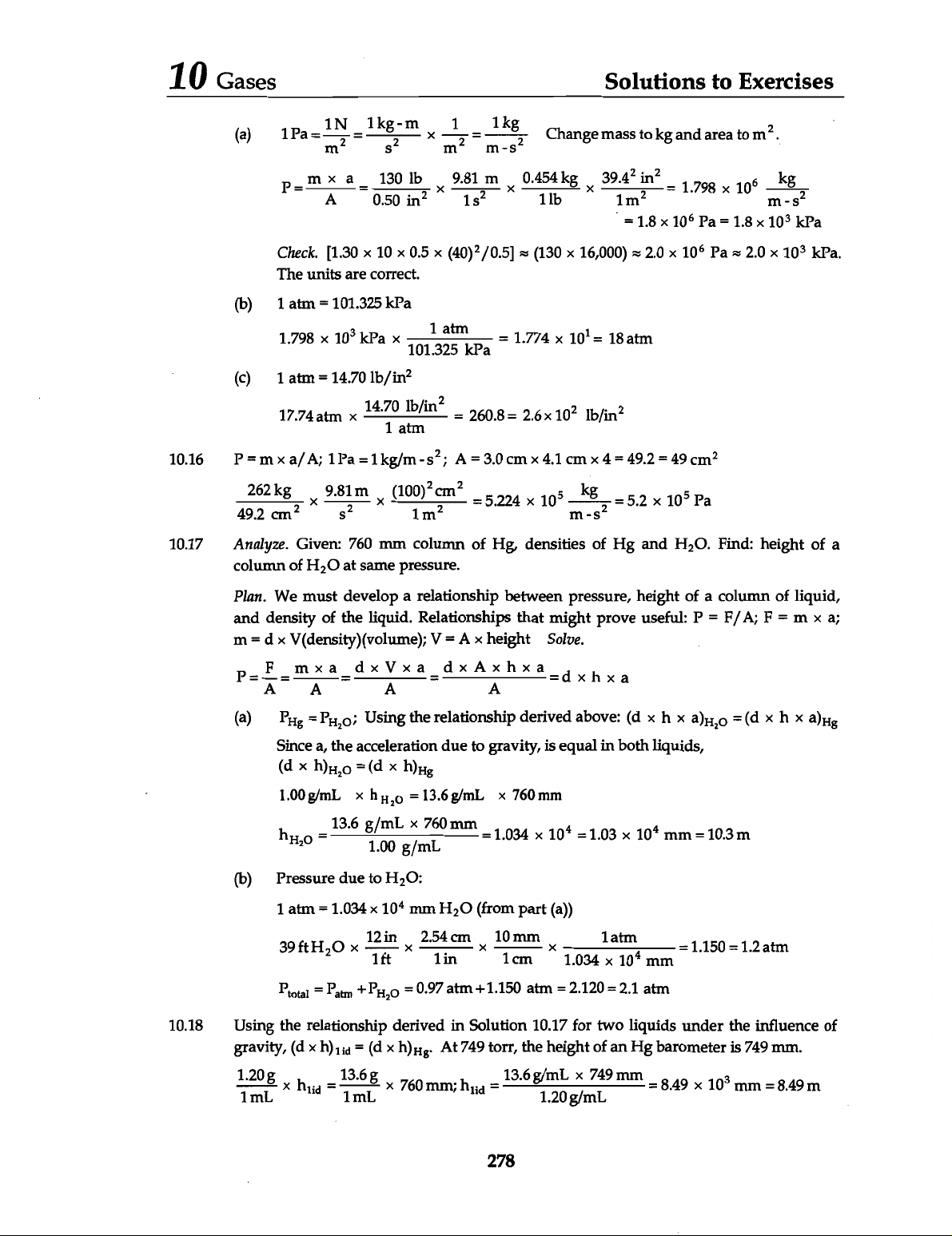 10 Gases Solutions to Exercises (a) 1Pa = m² 1N = 1kg-m s² X 1 = m 1kg Change mass to kg and area to m². P = A a = 0.50 130 lb X 9.81 m X 0.454 1lb kg X 1m² = 1.798 10⁶ kg = 1.8 10⁶ Pa = 1.8 10³ kPa Check. [1.30 X 10 0.5 X ≈ (130 X 16,000) ≈ 2.0 X 10⁶ Pa ≈ 2.0 X 10³ kPa. The units are correct. (b) 1 atm = 101.325 kPa 1.798 X 10³ kPa X = 1.774 X 10¹ = 18 atm 1 atm 101.325 kPa (c) 1 atm = 14.70 17.74 atm X 14.70 = 260.8 = 2.6 10² 1 atm 10.16 P = m a/A; 1Pa = 1kg/m A = 3.0 cm X 4.1 cm X 4 = 49.2 = 49 49.2 262 kg X 9.81 s² m X = 5.224 X 10⁵ kg = 5.2 X 10⁵ Pa 10.17 Analyze. Given: 760 mm column of Hg, densities of Hg and Find: height of a column of H₂O at same pressure. Plan. We must develop a relationship between pressure, height of a column of liquid, and density of the liquid. Relationships that might prove useful: P = F/A; F = m a; m=dx V(density) (volume); V = A height Solve. P = F = = = dxAxhxa A A A A (a) = PH₂O; Using the relationship derived above: (d h = (d Since a, the acceleration due to gravity, is equal in both liquids, 1.00g/mL X = X 760 mm = 13.6 1.00 g/mL X 760 mm = 1.034 10⁴ = 1.03 10⁴ mm = 10.3 m (b) Pressure due to H₂O: 1 atm = 1.034 10⁴ mm H₂O (from part (a)) 39 ft X X 2.54 1in cm X 10 1cm mm X 1.034 1atm 10⁴ mm = 1.150 = 1.2 atm = +PH₂O = 0.97 atm +1.150 atm = 2.120 = 2.1 atm 10.18 Using the relationship derived in Solution 10.17 for two liquids under the influence of gravity, (d = At 749 torr, the height of an Hg barometer is 749 mm. 1.20g 1mL = 13.6g mL 760 mm; = 13.6 g/mL 1.20g/mL 749 mm = 8.49 10³ mm = 8.49 m 278