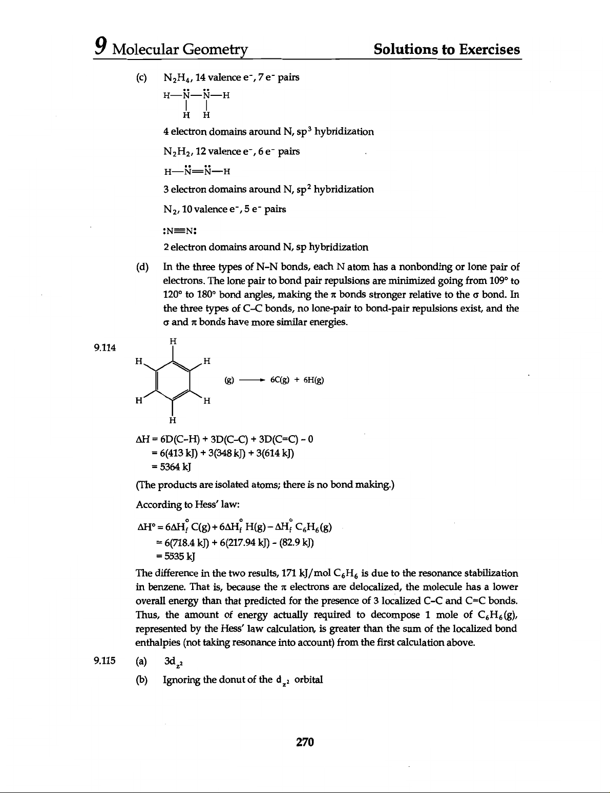 9 Molecular Geometry Solutions to Exercises (c) 14 valence pairs H H 4 electron domains around N, sp³ hybridization N₂H₂, 12 valence e⁻, 6e⁻ pairs 3 electron domains around N, hybridization N₂, 10 valence 5 e- pairs :N=N: 2 electron domains around N, sp hybridization (d) In the three types of N-N bonds, each N atom has a nonbonding or lone pair of electrons. The lone pair to bond pair repulsions are minimized going from 109° to 120° to 180° bond angles, making the π bonds stronger relative to the σ bond. In the three types of C-C bonds, no lone-pair to bond-pair repulsions exist, and the σ and π bonds have more similar energies. H 9.114 H H (g) 6C(g) + 6H(g) H H H AH = 6D(C-H) + 3D(C-C) + 3D(C=C) - 0 = 6(413 kJ) + 3(348 kJ) + = 5364 kJ (The products are isolated atoms; there is no bond making.) According to Hess' law: = C(g) + H(g) - C₆H₆(g) = 6(718.4 + 6(217.94 - (82.9 = 5535 kJ The difference in the two results, 171 kJ/mol C₆H₆ is due to the resonance stabilization in benzene. That is, because the π electrons are delocalized, the molecule has a lower overall energy than that predicted for the presence of 3 localized C-C and C=C bonds. Thus, the amount of energy actually required to decompose 1 mole of C₆H₆(g), represented by the Hess' law calculation, is greater than the sum of the localized bond enthalpies (not taking resonance into account) from the first calculation above. 9.115 (a) (b) Ignoring the donut of the orbital 270
