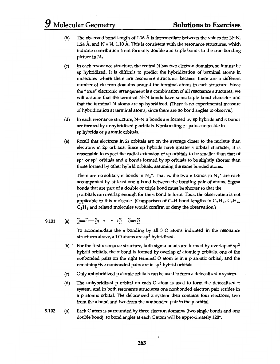 9 Molecular Geometry Solutions to Exercises (b) The observed bond length of 1.16 Å is intermediate between the values for N=N, 1.24 Å, and N ≡ N, 1.10 Å. This is consistent with the resonance structures, which indicate contribution from formally double and triple bonds to the true bonding picture in N₃⁻. (c) In each resonance structure, the central N has two electron domains, so it must be sp hybridized. It is difficult to predict the hybridization of terminal atoms in molecules where there are resonance structures because there are a different number of electron domains around the terminal atoms in each structure. Since the "true" electronic arrangement is a combination of all resonance structures, we will assume that the terminal N-N bonds have some triple bond character and that the terminal N atoms are sp hybridized. (There is no experimental measure of hybridization at terminal atoms, since there are no bond angles to observe.) (d) In each resonance structure, N-N σ bonds are formed by sp hybrids and π bonds are formed by unhybridized p orbitals. Nonbonding pairs can reside in sp hybrids or p atomic orbitals. (e) Recall that electrons in 2s orbitals are on the average closer to the nucleus than electrons in 2p orbitals. Since sp hybrids have greater S orbital character, it is reasonable to expect the radial extension of sp orbitals to be smaller than that of or sp³ orbitals and σ bonds formed by sp orbitals to be slightly shorter than those formed by other hybrid orbitals, assuming the same bonded atoms. There are no solitary σ bonds in N₃⁻. That is, the two σ bonds in are each accompanied by at least one π bond between the bonding pair of atoms. Sigma bonds that are part of a double or triple bond must be shorter so that the orbitals can overlap enough for the π bond to form. Thus, the observation is not applicable to this molecule. (Comparison of C-H bond lengths in C₂H₂, C₂H₆ and related molecules would confirm or deny the observation.) 9.101 (a) To accommodate the π bonding by all 3 atoms indicated in the resonance structures above, all atoms are hybridized. (b) For the first resonance structure, both sigma bonds are formed by overlap of hybrid orbitals, the π bond is formed by overlap of atomic p orbitals, one of the nonbonded pairs on the right terminal atom is in a atomic orbital, and the remaining five nonbonded pairs are in hybrid orbitals. (c) Only unhybridized p atomic orbitals can be used to form a delocalized π system. (d) The unhybridized p orbital on each atom is used to form the delocalized π system, and in both resonance structures one nonbonded electron pair resides in a p atomic orbital. The delocalized π system then contains four electrons, two from the π bond and two from the nonbonded pair in the p orbital. 9.102 (a) Each C atom is surrounded by three electron domains (two single bonds and one double bond), so bond angles at each C atom will be approximately 120°. 263