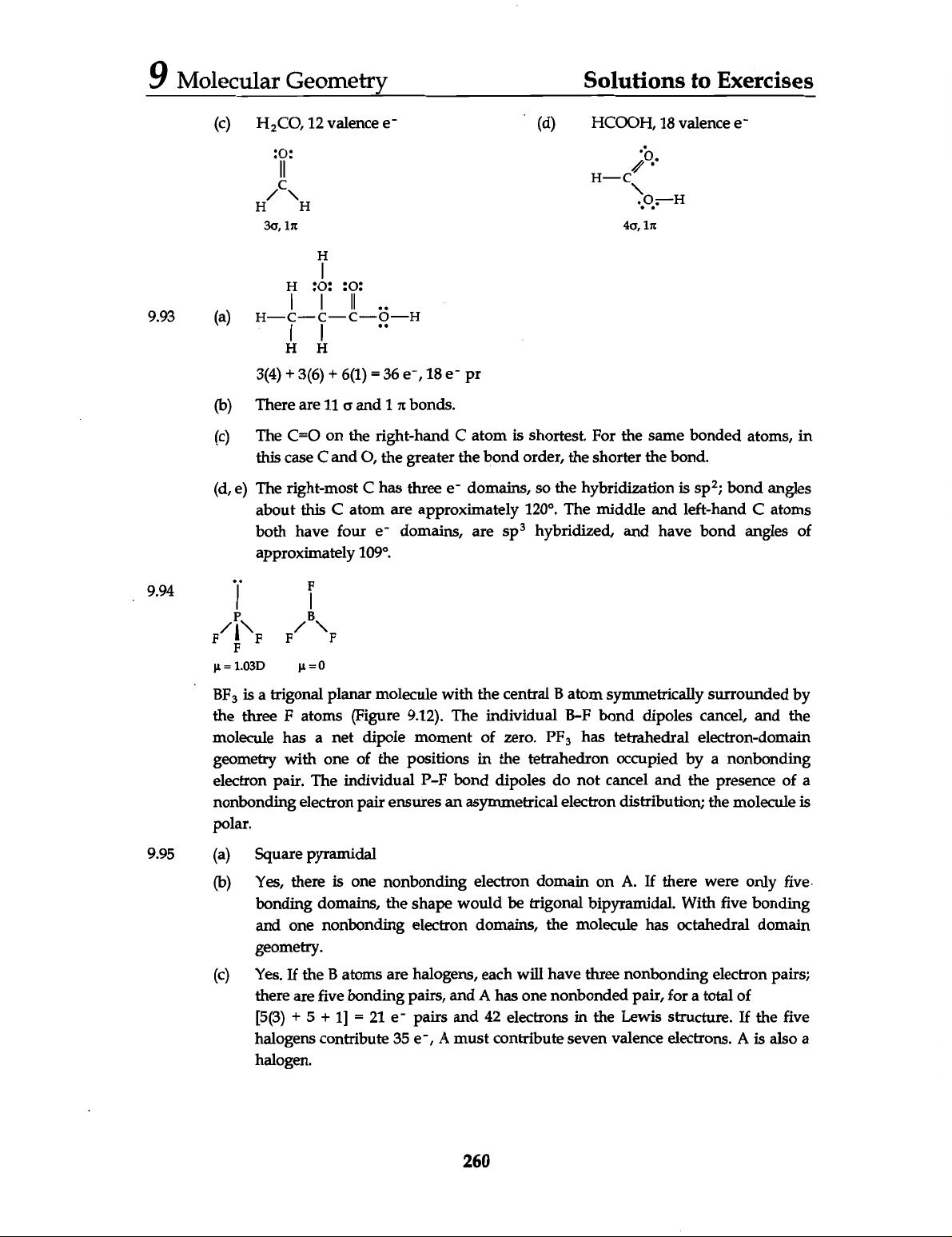 9 Molecular Geometry Solutions to Exercises (c) 12 valence (d) HCOOH, 18 valence e- H C C H H 3σ, 1π 4σ, 1π H H 9.93 (a) H C C C H H H 3(4) + 3(6) + 6(1) = 36 18 e- pr (b) There are 11 σ and 1 π bonds. (c) The C=O on the right-hand C atom is shortest. For the same bonded atoms, in this case C and O, the greater the bond order, the shorter the bond. (d, e) The right-most C has three e- domains, so the hybridization is sp²; bond angles about this C atom are approximately 120°. The middle and left-hand C atoms both have four e- domains, are sp³ hybridized, and have bond angles of approximately 109°. 9.94 F P B F F F F F µ = 1.03D BF₃ is a trigonal planar molecule with the central atom symmetrically surrounded by the three F atoms (Figure 9.12). The individual B-F bond dipoles cancel, and the molecule has a net dipole moment of zero. PF₃ has tetrahedral electron-domain geometry with one of the positions in the tetrahedron occupied by a nonbonding electron pair. The individual P-F bond dipoles do not cancel and the presence of a nonbonding electron pair ensures an asymmetrical electron distribution; the molecule is polar. 9.95 (a) Square pyramidal (b) Yes, there is one nonbonding electron domain on A. If there were only five. bonding domains, the shape would be trigonal bipyramidal. With five bonding and one nonbonding electron domains, the molecule has octahedral domain geometry. (c) Yes. If the B atoms are halogens, each will have three nonbonding electron pairs; there are five bonding pairs, and A has one nonbonded pair, for a total of [5(3) + 5 + 1] = 21 e- pairs and 42 electrons in the Lewis structure. If the five halogens contribute 35 e-, A must contribute seven valence electrons. A is also a halogen. 260