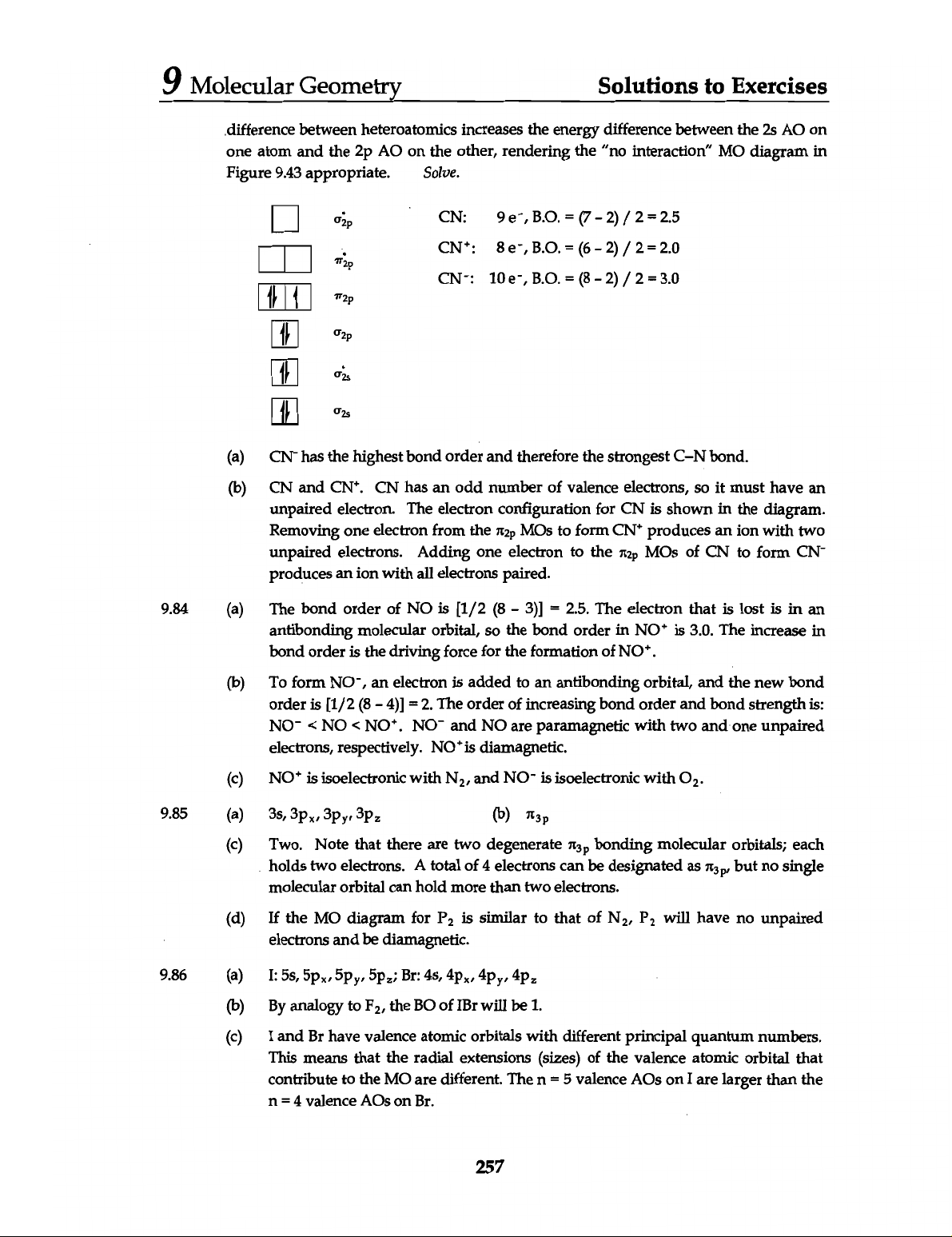9 Molecular Geometry Solutions to Exercises difference between heteroatomics increases the energy difference between the 2s AO on one atom and the 2p AO on the other, rendering the "no interaction" MO diagram in Figure 9.43 appropriate. Solve. CN: B.O. = (7 - 2) / 2 = 2.5 CN+: B.O. = (6 2) / 2 = 2.0 CN-: B.O. = (8 2) / 2 = 3.0 σ₂ₛ (a) CN⁻ has the highest bond order and therefore the strongest C-N bond. (b) CN and CN+. CN has an odd number of valence electrons, so it must have an unpaired electron. The electron configuration for CN is shown in the diagram. Removing one electron from the π2p MOs to form CN+ produces an ion with two unpaired electrons. Adding one electron to the π2p MOs of CN to form CN⁻ produces an ion with all electrons paired. 9.84 (a) The bond order of NO is [1/2 (8 3)] = 2.5. The electron that is lost is in an antibonding molecular orbital, so the bond order in NO+ is 3.0. The increase in bond order is the driving force for the formation of NO+. (b) To form NO-, an electron is added to an antibonding orbital, and the new bond order is [1/2 (8 4)] = 2. The order of increasing bond order and bond strength is: