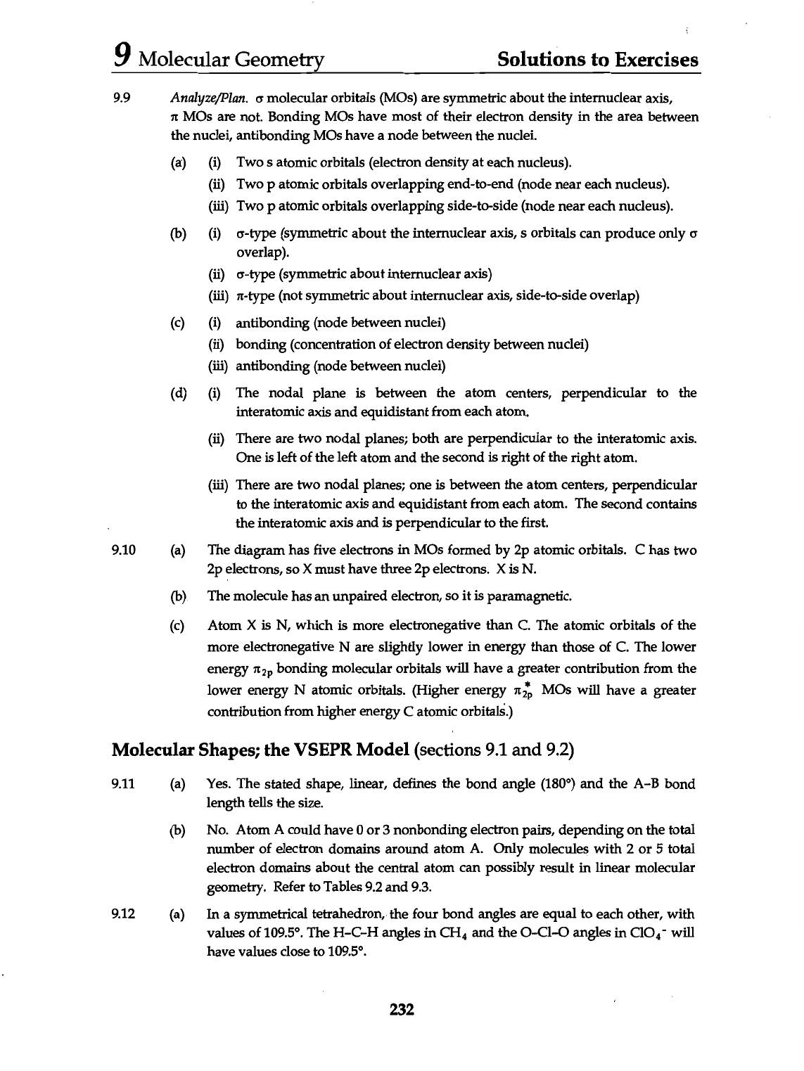 9 Molecular Geometry Solutions to Exercises 9.9 Analyze/Plan. σ molecular orbitals (MOs) are symmetric about the internuclear axis, π MOs are not. Bonding MOs have most of their electron density in the area between the nuclei, antibonding MOs have a node between the nuclei. (a) (i) Two S atomic orbitals (electron density at each nucleus). (ii) Two p atomic orbitals overlapping end-to-end (node near each nucleus). (iii) Two atomic orbitals overlapping side-to-side (node near each nucleus). (b) (i) σ-type (symmetric about the internuclear axis, S orbitals can produce only σ overlap). (ii) σ-type (symmetric about internuclear axis) (iii) π-type (not symmetric about internuclear axis, side-to-side overlap) (c) (i) antibonding (node between nuclei) (ii) bonding (concentration of electron density between nuclei) (iii) antibonding (node between nuclei) (d) (i) The nodal plane is between the atom centers, perpendicular to the interatomic axis and equidistant from each atom. (ii) There are two nodal planes; both are perpendicular to the interatomic axis. One is left of the left atom and the second is right of the right atom. (iii) There are two nodal planes; one is between the atom centers, perpendicular to the interatomic axis and equidistant from each atom. The second contains the interatomic axis and is perpendicular to the first. 9.10 (a) The diagram has five electrons in MOs formed by 2p atomic orbitals. C has two 2p electrons, so X must have three 2p electrons. X is N. (b) The molecule has an unpaired electron, so it is paramagnetic. (c) Atom X is N, which is more electronegative than C. The atomic orbitals of the more electronegative N are slightly lower in energy than those of C. The lower energy bonding molecular orbitals will have a greater contribution from the lower energy N atomic orbitals. (Higher energy MOs will have a greater contribution from higher energy C atomic orbitals.) Molecular Shapes; the VSEPR Model (sections 9.1 and 9.2) 9.11 (a) Yes. The stated shape, linear, defines the bond angle (180°) and the A-B bond length tells the size. (b) No. Atom A could have 0 or 3 nonbonding electron pairs, depending on the total number of electron domains around atom A. Only molecules with 2 or 5 total electron domains about the central atom can possibly result in linear molecular geometry. Refer to Tables 9.2 and 9.3. 9.12 (a) In a symmetrical tetrahedron, the four bond angles are equal to each other, with values of 109.5°. The H-C-H angles in CH₄ and the angles in will have values close to 109.5°. 232