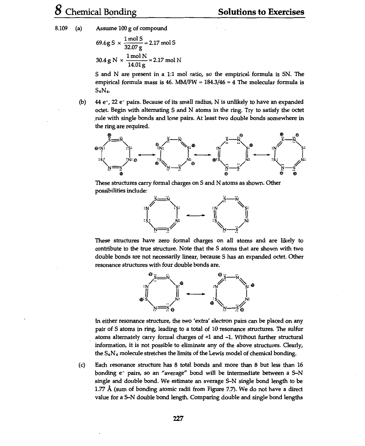 8 Chemical Bonding Solutions to Exercises 8.109 (a) Assume 100 g of compound 1 mol S 69.6g S 32.07 = 2.17 mol S 30.4 g N 14.01g N = 2.17 mol N S and N are present in a 1:1 mol ratio, so the empirical formula is SN. The empirical formula mass is 46. MM/FW = 184.3/46 = 4 The molecular formula is S4N4. (b) 44 22 pairs. Because of its small radius, N is unlikely to have an expanded octet. Begin with alternating S and N atoms in the ring. Try to satisfy the octet rule with single bonds and lone pairs. At least two double bonds somewhere in the ring are required. S N N N S :N: :N :N :N: :s N: N: N: N: N: These structures carry formal charges on S and N atoms as shown. Other possibilities include: N N :N :N :s N: :s N: Z: N: These structures have zero formal charges on all atoms and are likely to contribute to the true structure. Note that the S atoms that are shown with two double bonds are not necessarily linear, because S has an expanded octet. Other resonance structures with four double bonds are. S N N :N :N S: N: :s N: Z: S N S In either resonance structure, the two 'extra' electron pairs can be placed on any pair of S atoms in ring, leading to a total of 10 resonance structures. The sulfur atoms alternately carry formal charges of +1 and -1. Without further structural information, it is not possible to eliminate any of the above structures. Clearly, the molecule stretches the limits of the Lewis model of chemical bonding. (c) Each resonance structure has 8 total bonds and more than 8 but less than 16 bonding e- pairs, so an "average" bond will be intermediate between a S-N single and double bond. We estimate an average S-N single bond length to be 1.77 Å (sum of bonding atomic radii from Figure 7.7). We do not have a direct value for a S-N double bond length. Comparing double and single bond lengths 227