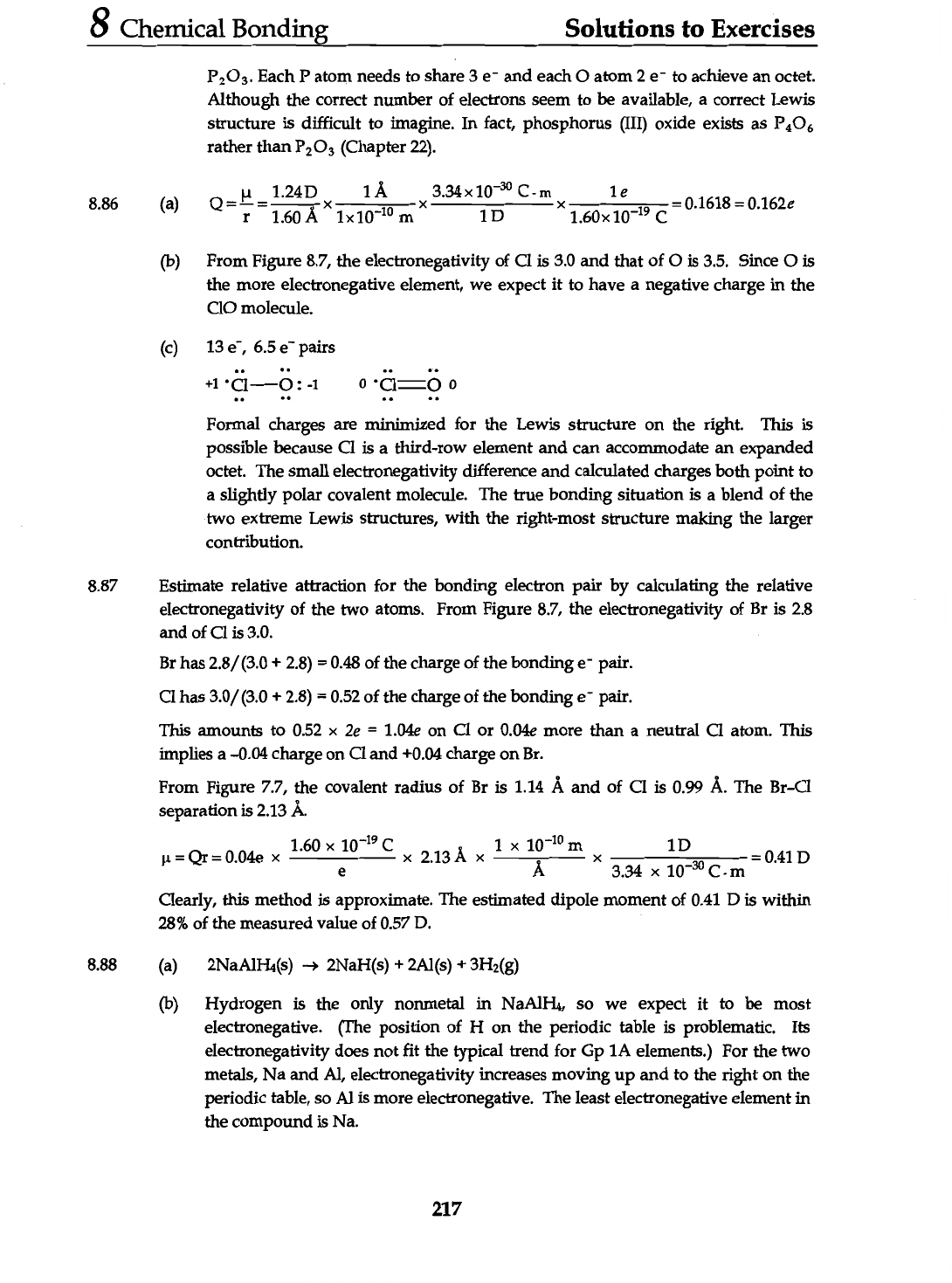 8 Chemical Bonding Solutions to Exercises P₂O₃. Each P atom needs to share 3 and each atom to achieve an octet. Although the correct number of electrons seem to be available, a correct Lewis structure is difficult to imagine. In fact, phosphorus (III) oxide exists as P₄O₆ rather than P₂O₃ (Chapter 22). 8.86 (a) Q = r = 1.60 1.24D Å 1 Å 1D 1e = = 0.162 (b) From Figure 8.7, the electronegativity of is 3.0 and that of is 3.5. Since o is the more electronegative element, we expect it to have a negative charge in the molecule. (c) 6.5 pairs +1 -1 Formal charges are minimized for the Lewis structure on the right. This is possible because CI is a third-row element and can accommodate an expanded octet. The small electronegativity difference and calculated charges both point to a slightly polar covalent molecule. The true bonding situation is a blend of the two extreme Lewis structures, with the right-most structure making the larger contribution. 8.87 Estimate relative attraction for the bonding electron pair by calculating the relative electronegativity of the two atoms. From Figure 8.7, the electronegativity of Br is 2.8 and of is 3.0. Br has 2.8/(3.0 + 2.8) = 0.48 of the charge of the bonding pair. has (3.0 + 2.8) = 0.52 of the charge of the bonding pair. This amounts to 0.52 2e = 1.04e on or 0.04e more than a neutral atom. This implies a -0.04 charge on and +0.04 charge on Br. From Figure 7.7, the covalent radius of Br is 1.14 Å and of is 0.99 Å. The Br-Cl separation is 2.13 Å. µ = Qr = 0.04e 1.60 10⁻¹⁹ 2.13 Å 1 10⁻¹⁰ Å 3.34 10⁻³⁰ 1D = D Clearly, this method is approximate. The estimated dipole moment of 0.41 D is within 28% of the measured value of 0.57 D. 8.88 (a) 2NaAlH4(s) 2NaH(s) + + (b) Hydrogen is the only nonmetal in so we expect it to be most electronegative. (The position of H on the periodic table is problematic. Its electronegativity does not fit the typical trend for Gp 1A elements.) For the two metals, Na and Al, electronegativity increases moving up and to the right on the periodic table, so Al is more electronegative. The least electronegative element in the compound is Na. 217