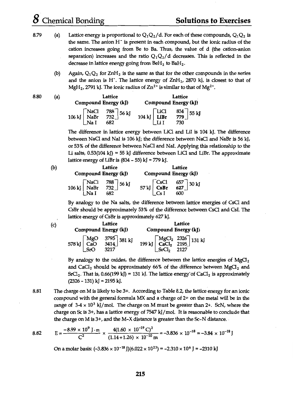 8 Chemical Bonding Solutions to Exercises 8.79 (a) Lattice energy is proportional to Q₁Q₂/d. For each of these compounds, is the same. The anion H⁻ is present in each compound, but the ionic radius of the cation increases going from Be to Ba. Thus, the value of d (the cation-anion separation) increases and the ratio Q₁Q₂/d decreases. This is reflected in the decrease in lattice energy going from BeH₂ to BaH₂. (b) Again, Q₁Q₂ for ZnH₂ is the same as that for the other compounds in the series and the anion is H⁻. The lattice energy of ZnH₂, 2870 kJ, is closest to that of MgH₂, 2791 kJ. The ionic radius of Zn²⁺ is similar to that of Mg²⁺. 8.80 (a) Lattice Lattice Compound Energy (kJ) Compound Energy (kJ) NaCl 788 56 kJ LiCl 834 55 kJ 106 kJ NaBr 732 104 kJ LiBr 779 Na I 682 Li I 730 The difference in lattice energy between LiCl and Lil is 104 kJ. The difference between NaCl and Nal is 106 kJ; the difference between NaCl and NaBr is 56 kJ, or 53% of the difference between NaCl and Nal. Applying this relationship to the Li salts, 0.53(104 kJ) = 55 kJ difference between LiCl and LiBr. The approximate lattice energy of LiBr is (834 - 55) kJ = 779 kJ. (b) Lattice Lattice Compound Energy (kJ) Compound Energy (kJ) NaCl 788 56 kJ CsCl 657 30 kJ 106 kJ NaBr 732 57 kJ CsBr 627 Na I 682 Cs I 600 By analogy to the Na salts, the difference between lattice energies of CsCl and CsBr should be approximately 53% of the difference between CsCl and Csl. The lattice energy of CsBr is approximately 627 kJ. (c) Lattice Lattice Compound Energy (kJ) Compound Energy (kJ) MgO 3795 381 kJ MgCl₂ 2326 131 kJ 578 kJ CaO 3414 199 kJ CaCl₂ 2195 SrO 3217 SrCl₂ 2127 By analogy to the oxides, the difference between the lattice energies of MgCl₂ and CaCl₂ should be approximately 66% of the difference between MgCl₂ and SrCl₂. That is, 0.66(199 kJ) = 131 kJ. The lattice of CaCl₂ is approximately (2326 131) kJ = 2195 kJ. 8.81 The charge on M is likely to be 3+. According to Table 8.2, the lattice energy for an ionic compound with the general formula MX and a charge of 2+ on the metal will be in the range of 3-4 X 10³ kJ/mol. The charge on M must be greater than 2+. ScN, where the charge on Sc is 3+, has a lattice energy of 7547 kJ/mol. It is reasonable to conclude that the charge on M is 3+, and the M-X distance is greater than the Sc-N distance. 8.82 E = (1.14+1.26) 4(1.60 10⁻¹⁹ 10⁻¹⁰ = -3.836 10⁻¹⁸ = -3.84 10⁻¹⁸ J On a molar basis: (-3.836 J)(6.022 = -2.310 10⁶ J = -2310 kJ 215