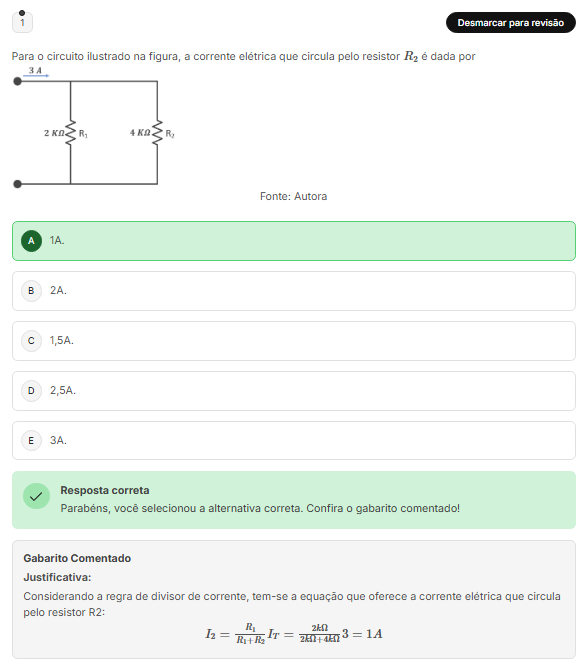 1 Desmarcar para revisão Para circuito ilustrado na figura, a corrente elétrica que circula pelo resistor é dada por 2 Fonte: Autora A 1A. B 2A. C 1,5A. D 2,5A. E 3A. Resposta correta Parabéns, você selecionou a alternativa correta. Confira gabarito comentado! Gabarito Comentado Justificativa: Considerando a regra de divisor de corrente, tem-se a equação que oferece a corrente elétrica que circula pelo resistor R2: