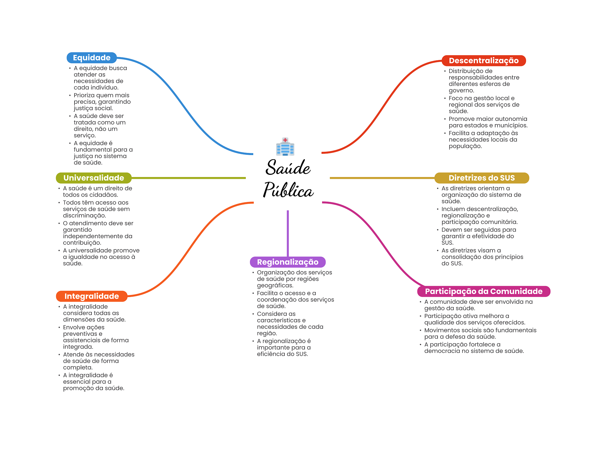 Equidade Descentralização A equidade busca Distribuição de atender as necessidades de responsabilidades entre diferentes esferas de cada indivíduo. governo. Prioriza quem mais Foco na gestão local e precisa, garantindo regional dos serviços de justiça social. saúde. A saúde deve ser Promove maior autonomia tratada como um direito, não um para estados e municípios. serviço. Facilita a adaptação às necessidades locais da A equidade é fundamental para a população. justiça no sistema de saúde. Saúde Universalidade Diretrizes do SUS A saúde é um direito de Pública As diretrizes orientam a todos cidadãos. organização do sistema de Todos têm acesso aos saúde. serviços de saúde sem Incluem descentralização, discriminação. regionalização e atendimento deve ser participação comunitária. garantido Devem ser seguidas para independentemente da garantir a efetividade do contribuição. SUS. A universalidade promove As diretrizes visam a a igualdade no acesso à consolidação dos princípios saúde. Regionalização do SUS. Organização dos serviços de saúde por regiões geográficas. Integralidade Facilita acesso e a Participação da Comunidade coordenação dos serviços A comunidade deve ser envolvida na A integralidade de saúde. gestão da saúde. considera todas as Considera as dimensões da saúde. Participação ativa melhora a características e qualidade dos serviços oferecidos. Envolve ações necessidades de cada Movimentos sociais são fundamentais preventivas e região. assistenciais de forma para a defesa da saúde. A regionalização é integrada. importante para a A participação fortalece a democracia no sistema de saúde. Atende às necessidades eficiência do SUS. de saúde de forma completa. A integralidade é essencial para a promoção da saúde.