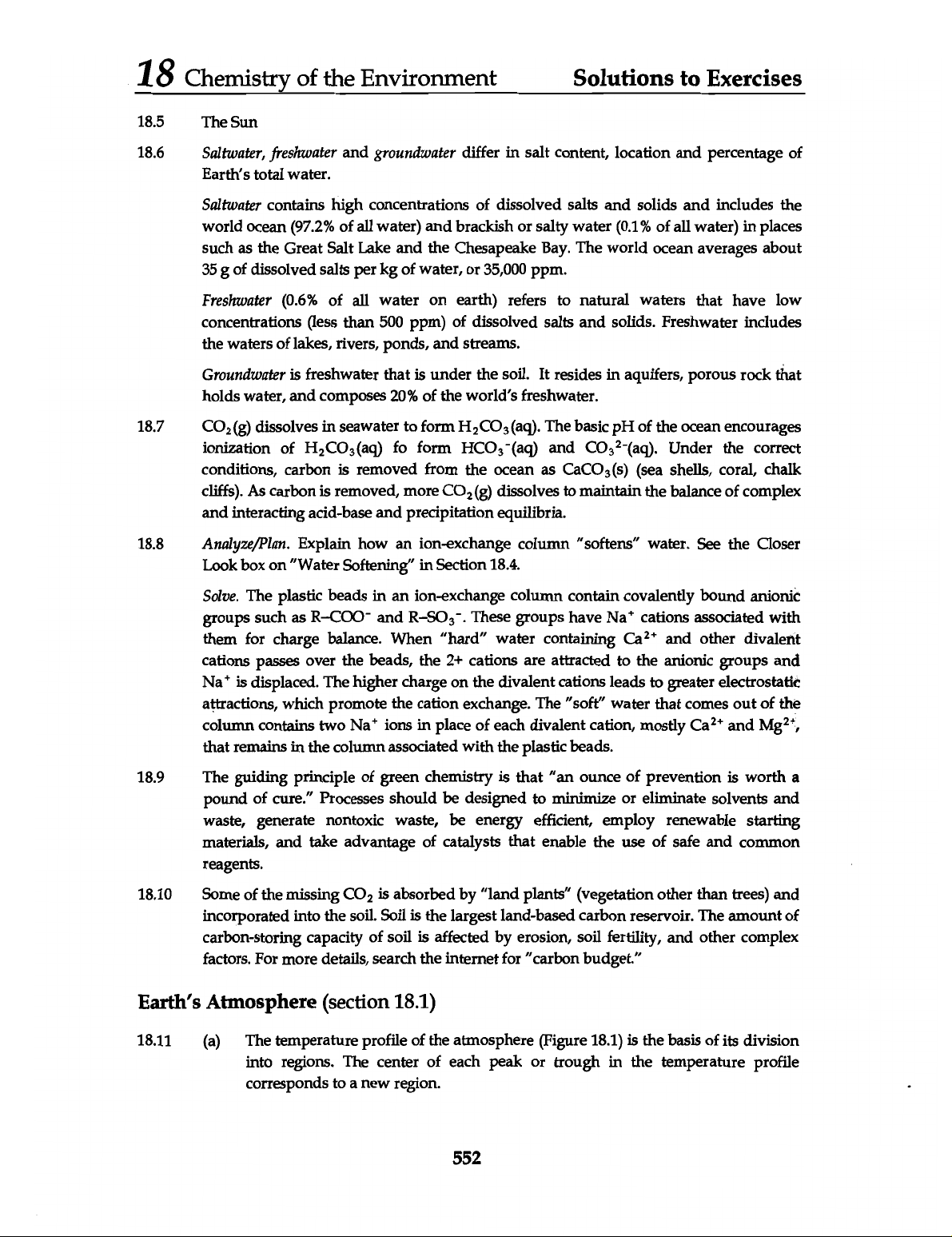 18 Chemistry of the Environment Solutions to Exercises 18.5 The Sun 18.6 Saltwater, freshwater and groundwater differ in salt content, location and percentage of Earth's total water. Saltwater contains high concentrations of dissolved salts and solids and includes the world ocean (97.2% of all water) and brackish or salty water (0.1% of all water) in places such as the Great Salt Lake and the Chesapeake Bay. The world ocean averages about 35 g of dissolved salts per kg of water, or 35,000 ppm. Freshwater (0.6% of all water on earth) refers to natural waters that have low concentrations (less than 500 ppm) of dissolved salts and solids. Freshwater includes the waters of lakes, rivers, ponds, and streams. Groundwater is freshwater that is under the soil. It resides in aquifers, porous rock that holds water, and composes 20% of the world's freshwater. 18.7 dissolves in seawater to form The basic pH of the ocean encourages ionization of fo form (aq) and Under the correct conditions, carbon is removed from the ocean as CaCO₃(s) (sea shells, coral, chalk cliffs). As carbon is removed, more dissolves to maintain the balance of complex and interacting acid-base and precipitation equilibria. 18.8 Analyze/Plan. Explain how an ion-exchange column "softens" water. See the Closer Look box on "Water Softening" in Section 18.4. Solve. The plastic beads in an ion-exchange column contain covalently bound anionic groups such as R-COO- and These groups have Na+ cations associated with them for charge balance. When "hard" water containing Ca²⁺ and other divalent cations passes over the beads, the 2+ cations are attracted to the anionic groups and Na+ is displaced. The higher charge on the divalent cations leads to greater electrostatic attractions, which promote the cation exchange. The "soft" water that comes out of the column contains two Na+ ions in place of each divalent cation, mostly Ca²⁺ and that remains in the column associated with the plastic beads. 18.9 The guiding principle of green chemistry is that "an ounce of prevention is worth a pound of cure." Processes should be designed to minimize or eliminate solvents and waste, generate nontoxic waste, be energy efficient, employ renewable starting materials, and take advantage of catalysts that enable the use of safe and common reagents. 18.10 Some of the missing is absorbed by "land plants" (vegetation other than trees) and incorporated into the soil. Soil is the largest land-based carbon reservoir. The amount of carbon-storing capacity of soil is affected by erosion, soil fertility, and other complex factors. For more details, search the internet for "carbon budget." Earth's Atmosphere (section 18.1) 18.11 (a) The temperature profile of the atmosphere (Figure 18.1) is the basis of its division into regions. The center of each peak or trough in the temperature profile corresponds to a new region. 552