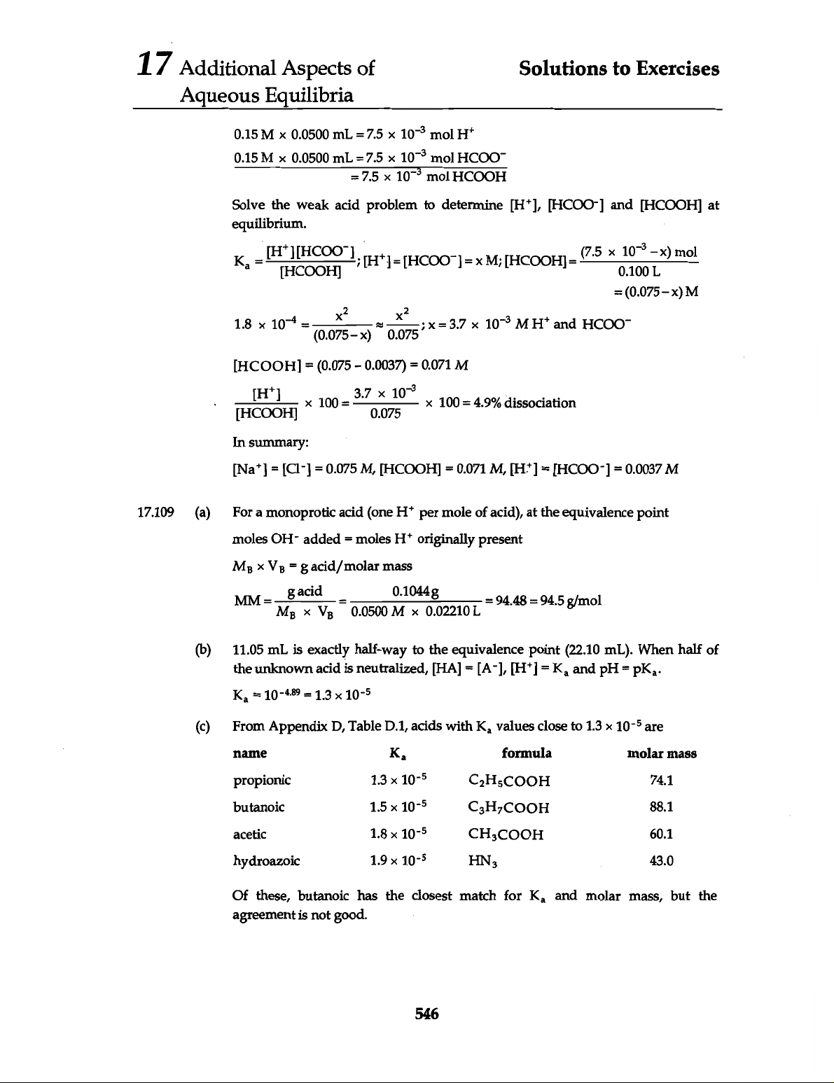 17 Additional Aspects of Solutions to Exercises Aqueous Equilibria 0.15 M X 0.0500 mL = 7.5 X 10⁻³ mol 0.15 M 0.0500 mL = 7.5 X 10⁻³ mol HCOO⁻ = 7.5 10⁻³ mol HCOOH Solve the weak acid problem to determine and [HCOOH] at equilibrium. = (0.075 x) M 1.8 10⁻⁴ = (0.075-x) x² ≈ 0.075 ; = 3.7 X 10⁻³ M and HCOO⁻ [HCOOH] = (0.075 0.0037) = 0.071 M [HCOOH] [H⁺] 100 = 0.075 10⁻³ 100 = 4.9% dissociation In summary: [Na⁺] = = 0.075 M, [HCOOH] = 0.071 M, = = 0.0037 M 17.109 (a) For a monoprotic acid (one per mole of acid), at the equivalence point moles OH- added = moles originally present X = g acid/molar mass MM = MB g acid X = 0.0500 M 0.1044g 0.02210 L = (b) 11.05 mL is exactly half-way to the equivalence point (22.10 mL). When half of the unknown acid is neutralized, [HA] = = and pH = (c) From Appendix D, Table D.1, acids with Ka values close to 1.3 are name Ka formula molar mass propionic 1.3 10⁻⁵ 74.1 butanoic 1.5 10⁻⁵ 88.1 acetic 1.8 CH₃COOH 60.1 hydroazoic 1.9 43.0 Of these, butanoic has the closest match for and molar mass, but the agreement is not good. 546