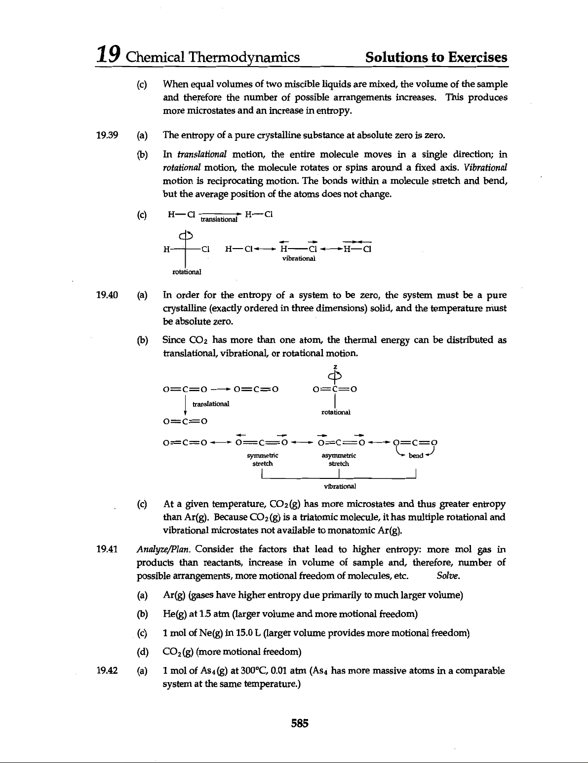 19 Chemical Thermodynamics Solutions to Exercises (c) When equal volumes of two miscible liquids are mixed, the volume of the sample and therefore the number of possible arrangements increases. This produces more microstates and an increase in entropy. 19.39 (a) The entropy of a pure crystalline substance at absolute zero is zero. (b) In translational motion, the entire molecule moves in a single direction; in rotational motion, the molecule rotates or spins around a fixed axis. Vibrational motion is reciprocating motion. The bonds within a molecule stretch and bend, but the average position of the atoms does not change. (c) H CI H translational H H H H CI vibrational rotational 19.40 (a) In order for the entropy of a system to be zero, the system must be a pure crystalline (exactly ordered in three dimensions) solid, and the temperature must be absolute zero. (b) Since has more than one atom, the thermal energy can be distributed as translational, vibrational, or rotational motion. Z translational rotational C symmetric asymmetric bend stretch stretch vibrational (c) At a given temperature, has more microstates and thus greater entropy than Ar(g). Because is a triatomic molecule, it has multiple rotational and vibrational microstates not available to monatomic Ar(g). 19.41 Analyze/Plan. Consider the factors that lead to higher entropy: more mol gas in products than reactants, increase in volume of sample and, therefore, number of possible arrangements, more motional freedom of molecules, etc. Solve. (a) Ar(g) (gases have higher entropy due primarily to much larger volume) (b) He(g) at 1.5 atm (larger volume and more motional freedom) (c) 1 mol of Ne(g) in 15.0 L (larger volume provides more motional freedom) (d) CO₂(g) (more motional freedom) 19.42 (a) 1 mol of at 300°C, 0.01 atm has more massive atoms in a comparable system at the same temperature.) 585