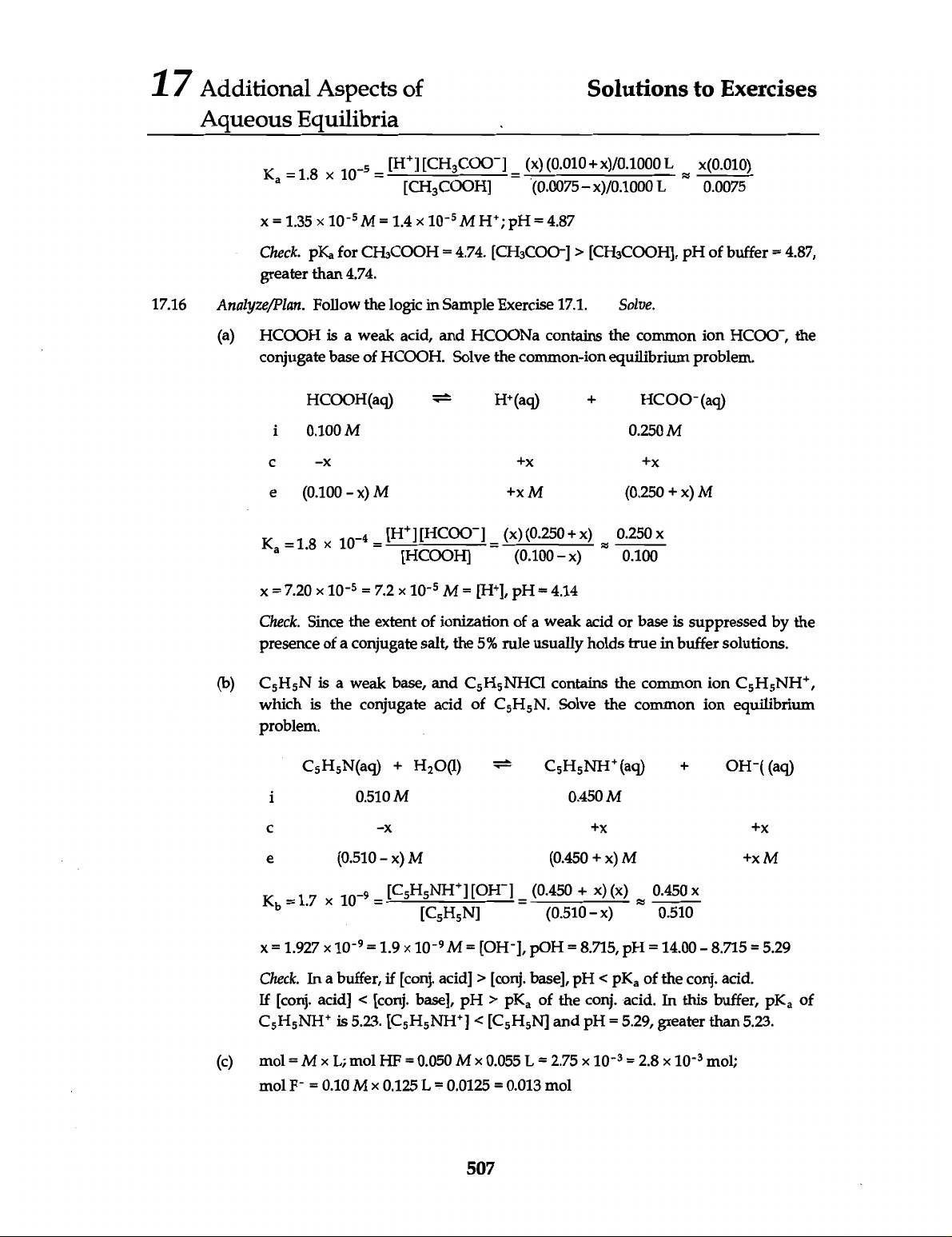 17 Additional Aspects of Solutions to Exercises Aqueous Equilibria = 1.8 10⁻⁵ = [CH₃COOH] = (x) L ≈ x(0.010) 0.0075 = 1.35 10⁻⁵ = 1.4 pH = 4.87 Check. for = 4.74. [CH₃COO⁻] > [CH₃COOH], pH of buffer = 4.87, greater than 4.74. 17.16 Analyze/Plan. Follow the logic in Sample Exercise 17.1. Solve. (a) HCOOH is a weak acid, and HCOONa contains the common ion the conjugate base of HCOOH. Solve the common-ion equilibrium problem. HCOOH(aq) 1L + i 0.100 M 0.250 M -x +x +x e (0.100 x) M +x M (0.250 + x) M X = 7.20 = 10⁻⁵ M = pH = 4.14 Check. Since the extent of ionization of a weak acid or base is suppressed by the presence of a conjugate salt, the 5% rule usually holds true in buffer solutions. (b) C₅H₅N is a weak base, and contains the common ion C₅H₅NH⁺, which is the conjugate acid of C₅H₅N. Solve the common ion equilibrium problem. C₅H₅N(aq) + 1L + (aq) i 0.510 M 0.450 M -x +x +x e (0.510 x) M (0.450 + M +x M Kb = 1.7 10⁻⁹ = [C₅H₅N] = (0.450 (0.510-x) + (x) ≈ 0.450 0.510 = 1.927 = 1.9 10⁻⁹ M = pOH = 8.715, pH = 14.00 - 8.715 = 5.29 Check. In a buffer, if [conj. acid] > [conj. base], pH of the conj. acid. In this buffer, of is 5.23. [C₅H₅NH⁺]