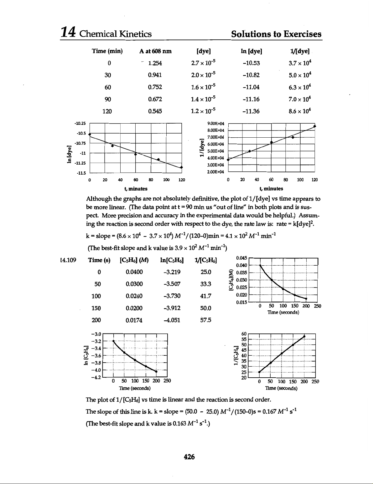 14 Chemical Kinetics Solutions to Exercises Time (min) A at 608 nm [dye] In [dye] 1/[dye] 0 - 1.254 2.7 X 10⁻⁵ -10.53 3.7 10⁴ 30 0.941 2.0 X 10⁻⁵ -10.82 5.0 10⁴ 60 0.752 1.6 10⁻⁵ -11.04 6.3 10⁴ 90 0.672 1.4 X 10⁻⁵ -11.16 7.0 X 10⁴ 120 0.545 1.2 X 10⁻⁵ -11.36 8.6 X 10⁴ -10.25 9.00E+04 8.00E+04 -10.5 7.00E+04 -10.75 In[dye] -11 1/[dye] 6.00E+04 5.00E+04 4.00E+04 -11.25 3.00E+04 -11.5 2.00E+04 0 20 40 60 80 100 120 0 20 40 60 80 100 120 t, minutes t, minutes Although the graphs are not absolutely definitive, the plot of 1/[dye] time appears to be more linear. (The data point at t = 90 min us "out of line" in both plots and is sus- pect. More precision and accuracy in the experimental data would be helpful.) Assum- ing the reaction is second order with respect to the dye, the rate law is: rate = k = slope = (8.6 10⁴ - 3.7 10⁴) (120-0)min = 4.1 10² M⁻¹ min⁻¹ (The best-fit slope and k value is 3.9 10² min⁻¹) 14.109 Time (s) [C₅H₆] (M) In[C₅H₆] 1/[C₅H₆] 0.045 0.040 0 0.0400 -3.219 25.0 0.035 50 0.0300 33.3 0.030 -3.507 0.025 100 0.0240 -3.730 41.7 0.020 0.015 150 0.0200 -3.912 50.0 0 50 100 150 200 250 Time (seconds) 200 0.0174 -4.051 57.5 -3.0 60 -3.2 55 50 -3.4 [C₅H₆] -3.6 45 40 -3.8 35 30 -4.0 25 -4.2 20 0 50 100 150 200 250 0 50 100 150 200 250 Time (seconds) Time (seconds) The plot of 1/[C₅H₆] time is linear and the reaction is second order. The slope of this line is k. k = slope = (50.0 - 25.0) M⁻¹ (150-0)s = 0.167 (The best-fit slope and k value is 0.163 M⁻¹ 426