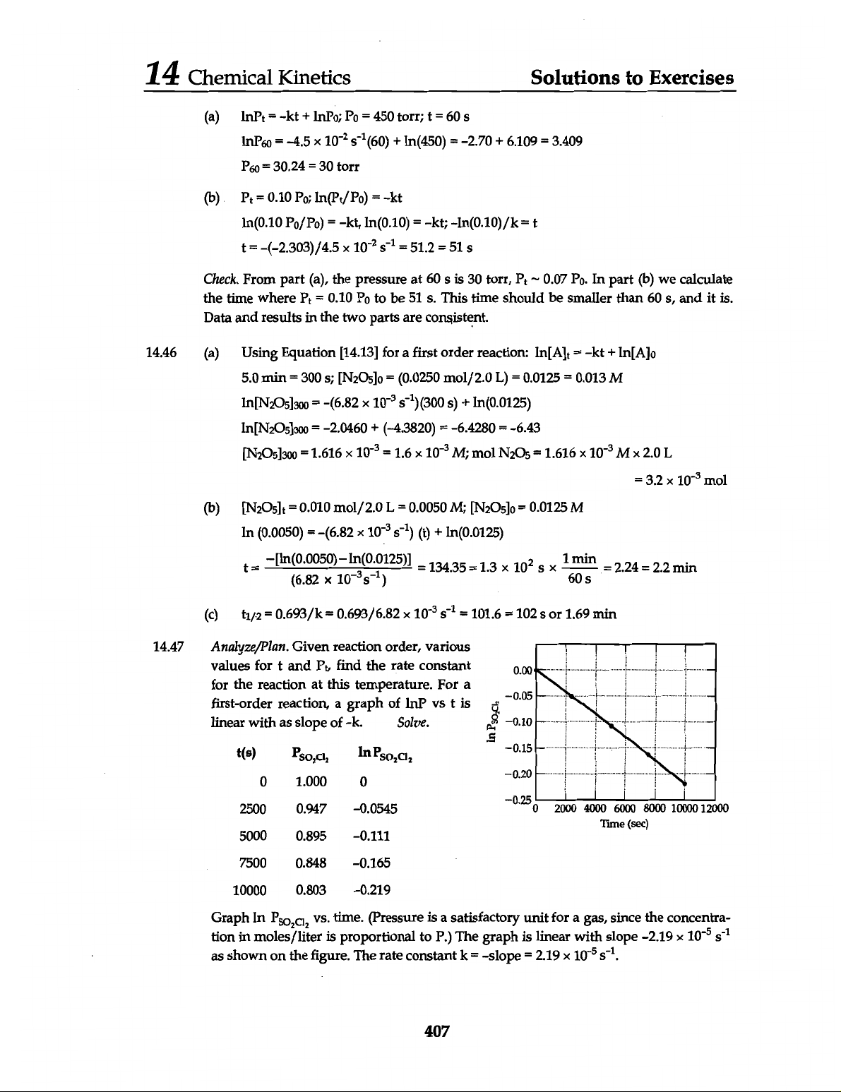 14 Chemical Kinetics Solutions to Exercises (a) InPₜ = -kt + = 450 torr; t = 60 S InP60 = -4.5 10⁻² (60) + In(450) = -2.70 + 6.109 = 3.409 = 30.24 = 30 torr (b) = 0.10 = -kt = -kt, In(0.10) = -kt; -In(0.10)/k = t t = -(-2.303)/4.5 10⁻² = 51.2 = 51 Check. From part (a), the pressure at 60 S is 30 torr, ~ 0.07 In part (b) we calculate the time where Pₜ = 0.10 P₀ to be 51 S. This time should be smaller than 60 s, and it is. Data and results in the two parts are consistent. 14.46 (a) Using Equation [14.13] for a first order reaction: In[A]ₜ = -kt + 5.0 min = 300 s; = (0.0250 mol/2.0 L) = 0.0125 = 0.013 M = -(6.82 + In(0.0125) = -2.0460 + (-4.3820) = -6.4280 = -6.43 = 1.616 10⁻³ = 1.6 10⁻³ M; mol = 1.616 10⁻³ = 3.2 10⁻³ mol (b) = 0.010 mol/2.0 = 0.0050 M; = 0.0125 M In (0.0050) = -(6.82 10⁻³ (t) + In(0.0125) t = (6.82 = 134.35 = 1.3 10² 1 60 min = = min (c) t1/2 = 0.693/k = 0.693/6.82 10⁻³ = 101.6 = 102 S or 1.69 min 14.47 Analyze/Plan. Given reaction order, various values for t and find the rate constant 0.00 for the reaction at this temperature. For a -0.05 first-order reaction, a graph of InP vs t is linear with as slope of -k. Solve. In -0.10 t(s) In -0.15 -0.20 0 1.000 0 -0.25 2500 0.947 -0.0545 0 2000 4000 6000 8000 10000 12000 Time (sec) 5000 0.895 -0.111 7500 0.848 -0.165 10000 0.803 -0.219 Graph In time. (Pressure is a satisfactory unit for a gas, since the concentra- tion in moles/liter is proportional to P.) The graph is linear with slope -2.19 10⁻⁵ as shown on the figure. The rate constant k = -slope = 2.19 10⁻⁵ s⁻¹. 407
